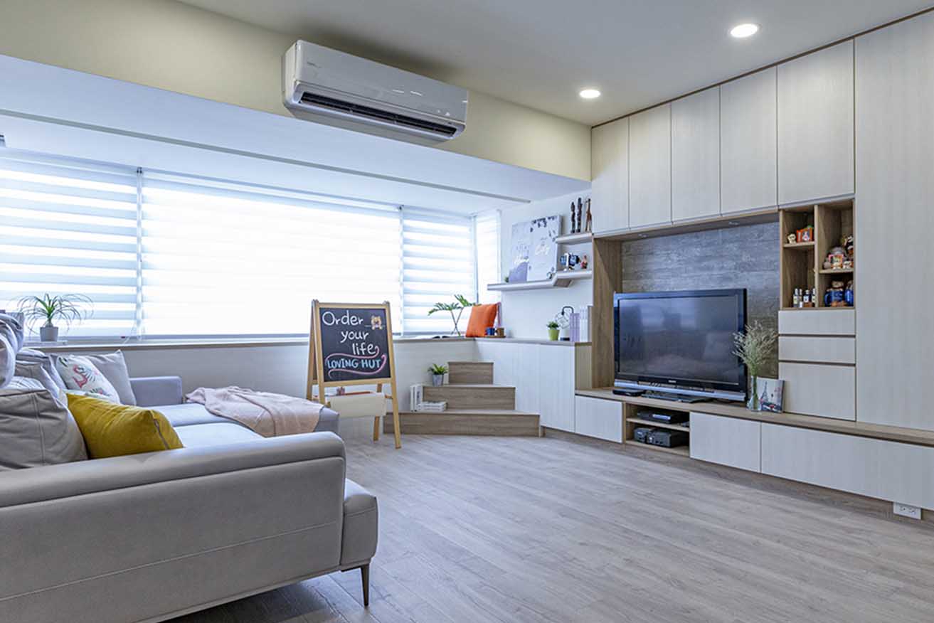 屋主本身擁有較多日用物品、衣物以及寵物用品,因此採以分區收納為主軸。公空間以玄關鞋櫃、穿鞋椅收納鞋履、大型球具;客廳則將窗台連結至電視櫃,透過不同深度及高度,使狗狗的乾糧也能妥善囤放,並結合開放層架設計,用以擺放寵物監視器,使主人能隨時關心毛孩的一舉一動。