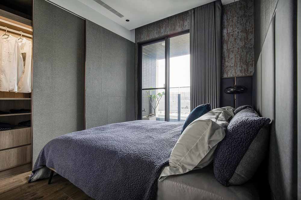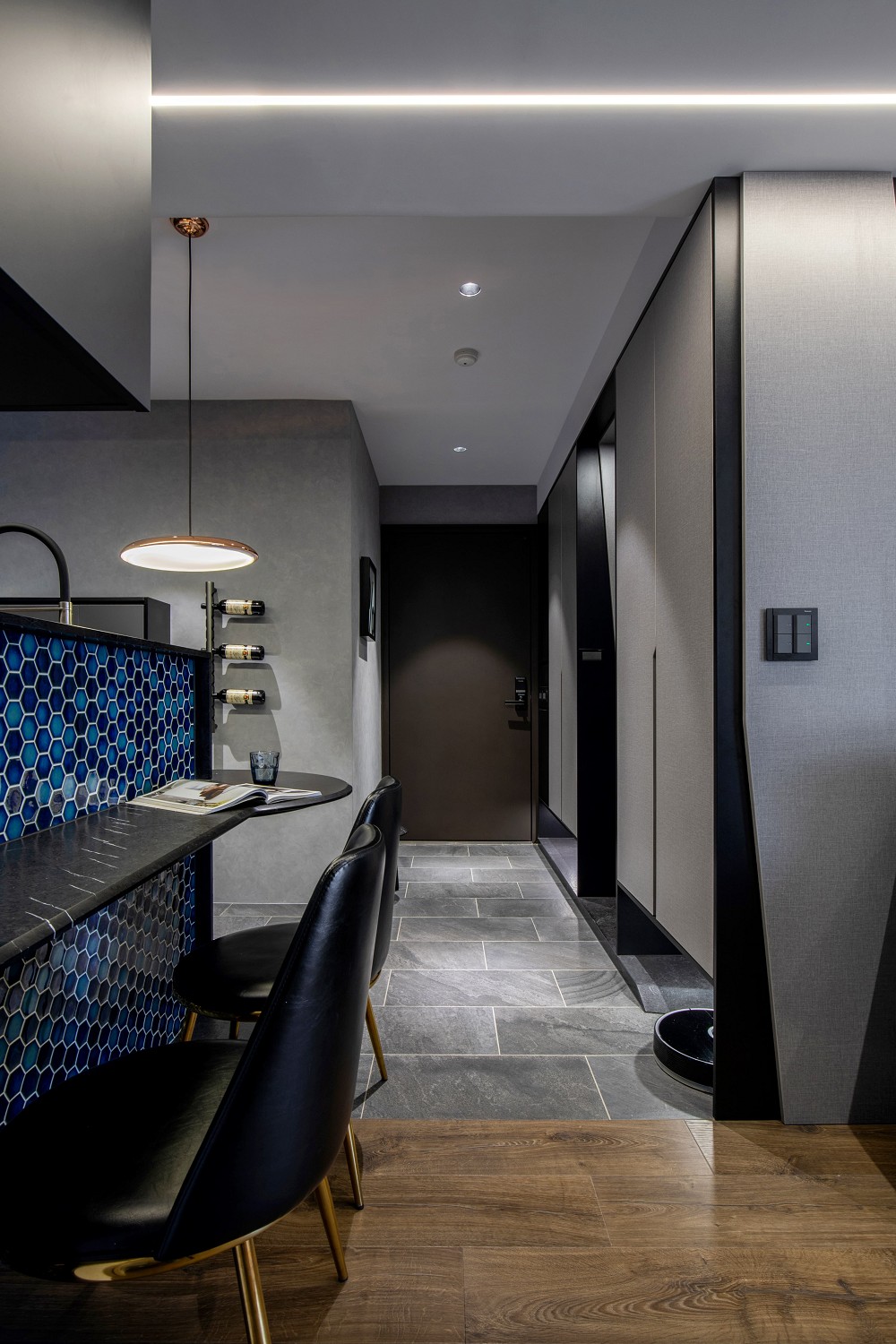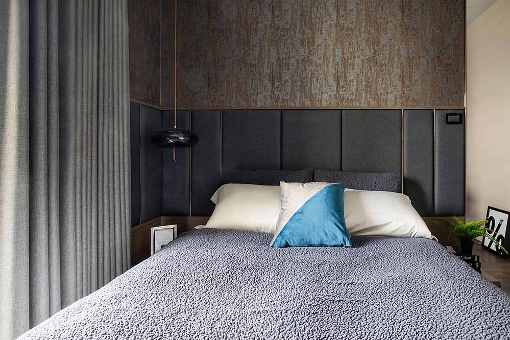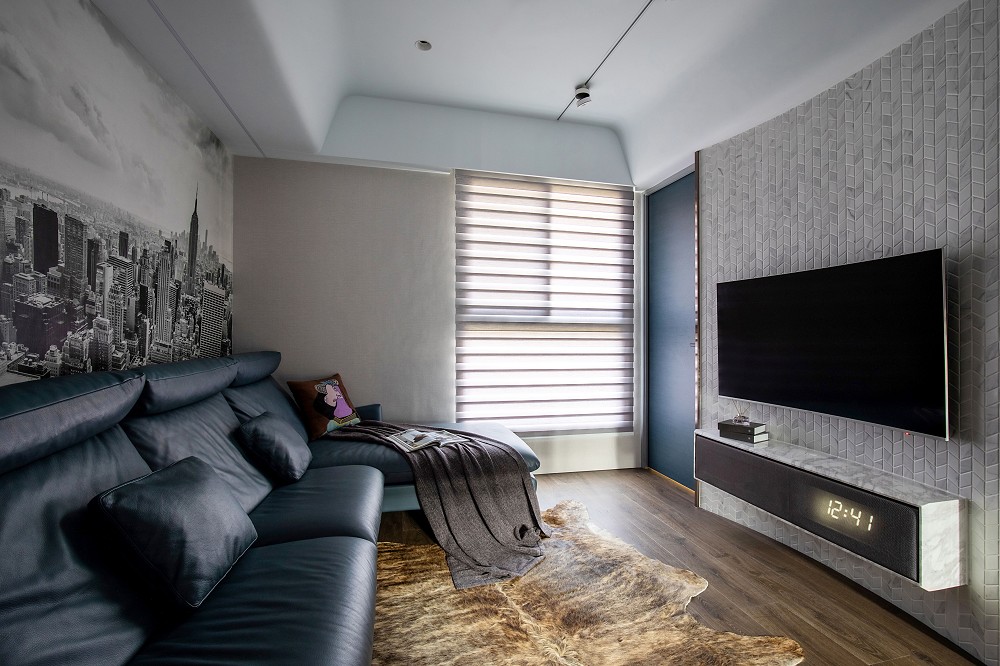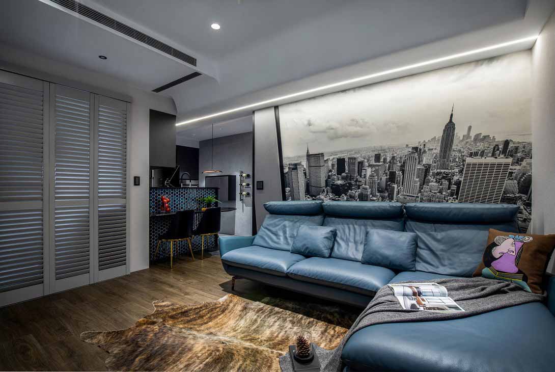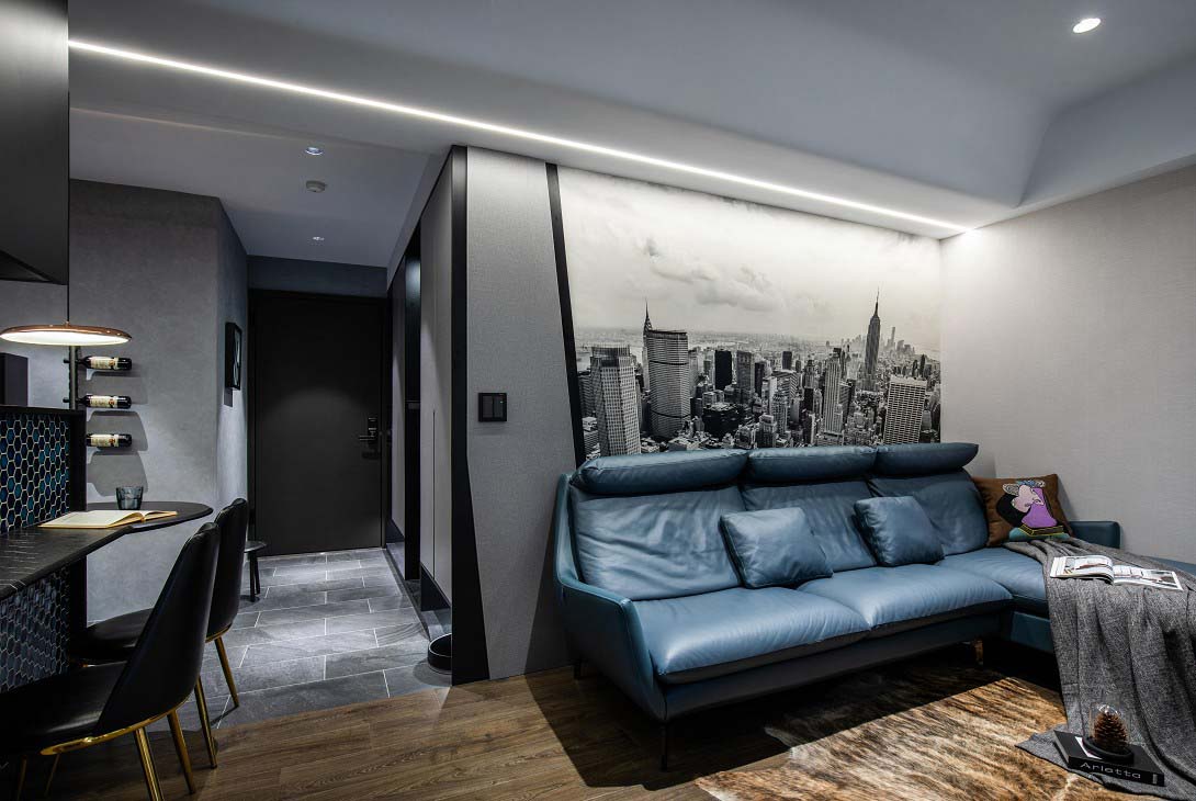 熱愛旅行的夫妻,有著征服世界的美夢,在異國的時間待久了,對家的眷戀便悄然而生,因此累積了許多住宿體驗,重新定義新家。設計手法依夫妻倆喜愛的時尚飯店風格為訴求,以冷/灰色調打底,並與各種異材質相互呼應,打造一間精品小宅,沙發背牆選擇紐約曼哈頓天際線大圖,讓原本的小客廳有視覺延伸的開闊感,並強調旅人的生活態度!主臥睡眠區以灰色系的布皮沉穩配色,加上局部光源,塑造空間的安定感。