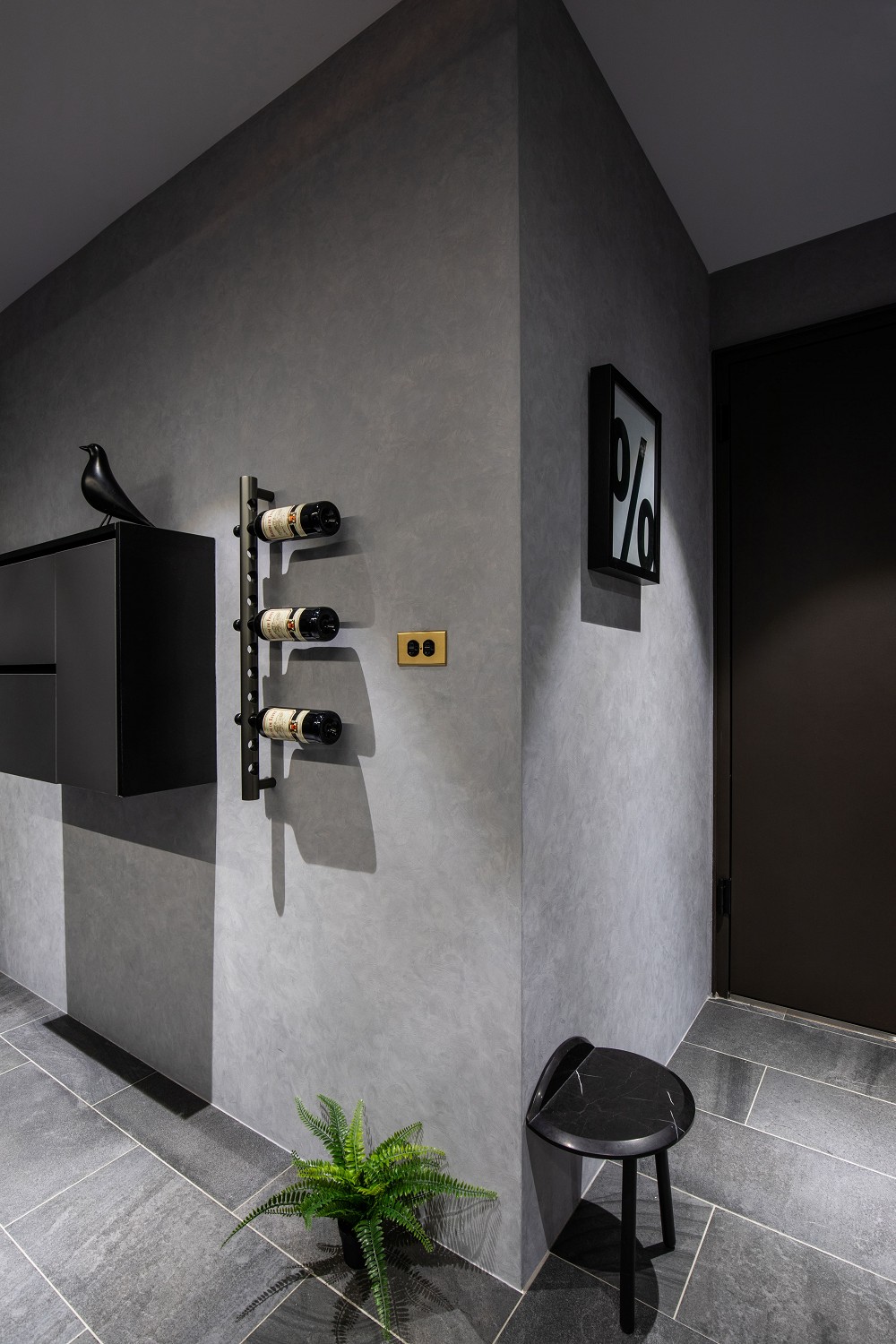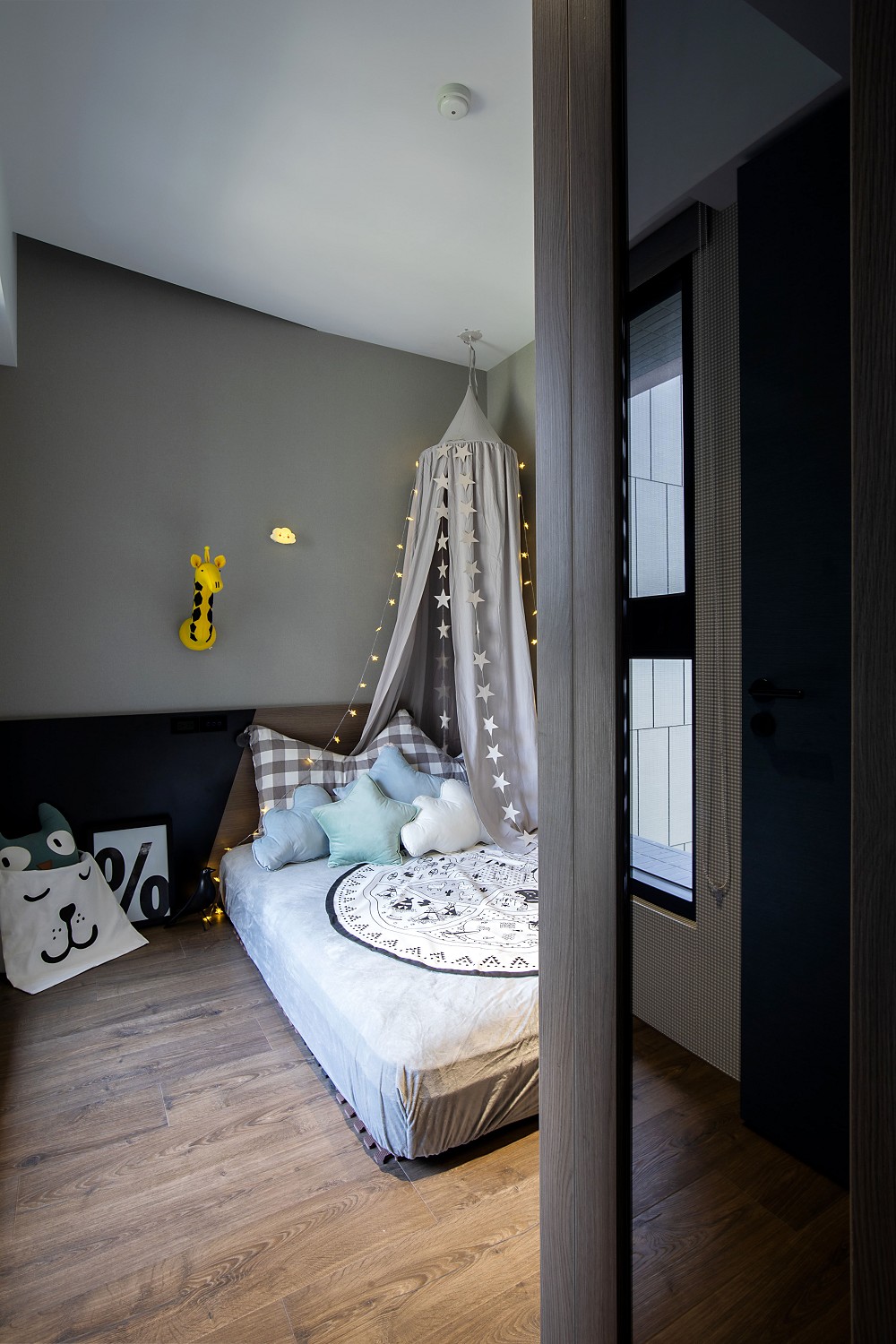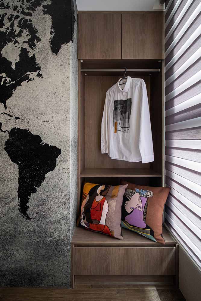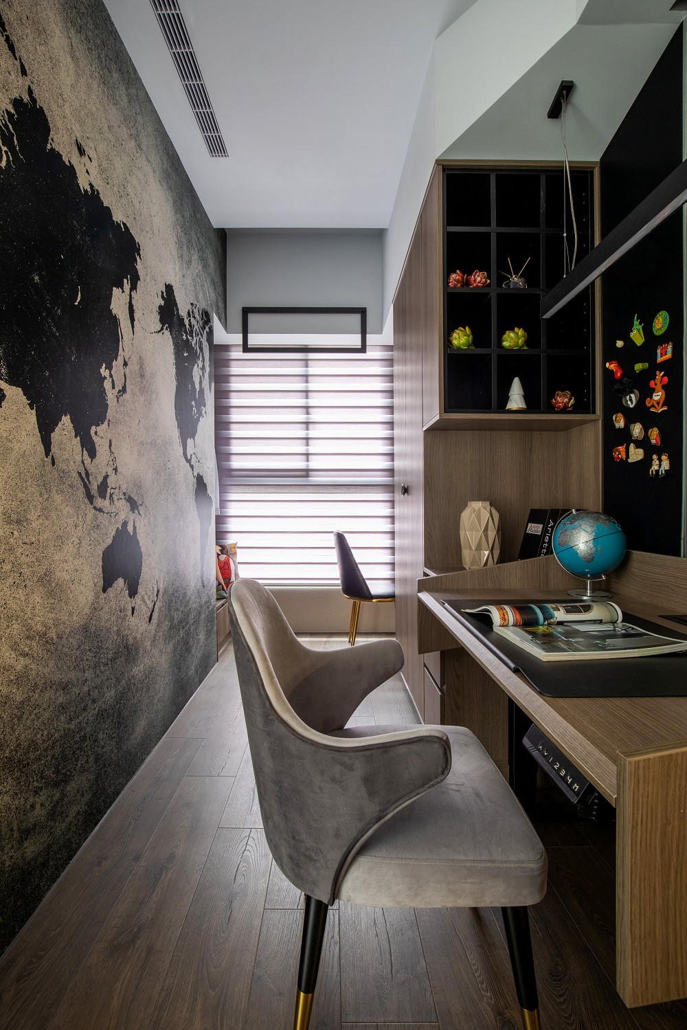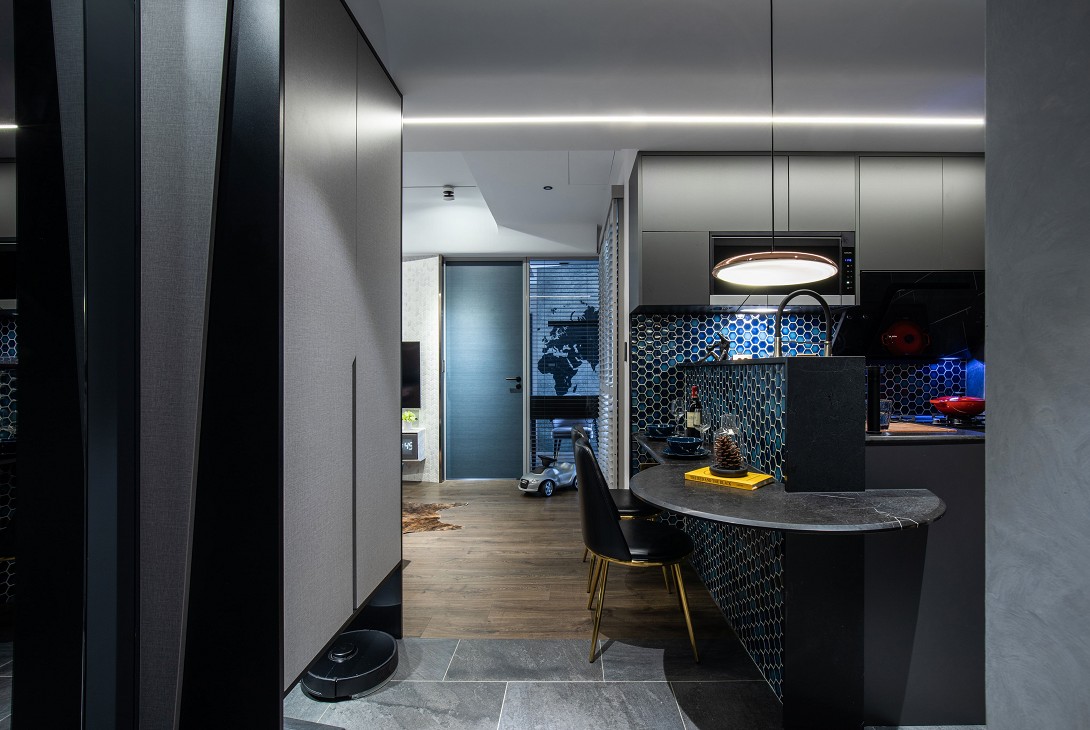 熱愛旅行的夫妻,有著征服世界的美夢,在異國的時間待久了,對家的眷戀便悄然而生,因此累積了許多住宿體驗,重新定義新家。設計手法依夫妻倆喜愛的時尚飯店風格為訴求,以冷/灰色調打底,並與各種異材質相互呼應,打造一間精品小宅,沙發背牆選擇紐約曼哈頓天際線大圖,讓原本的小客廳有視覺延伸的開闊感,並強調旅人的生活態度!主臥睡眠區以灰色系的布皮沉穩配色,加上局部光源,塑造空間的安定感。