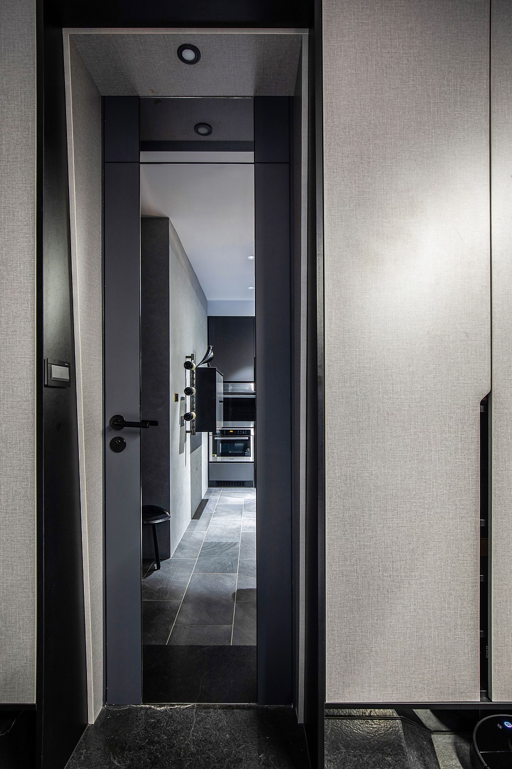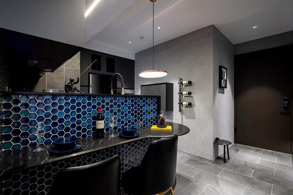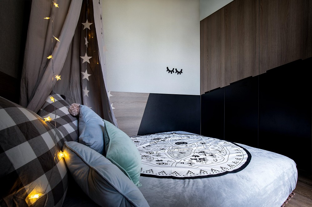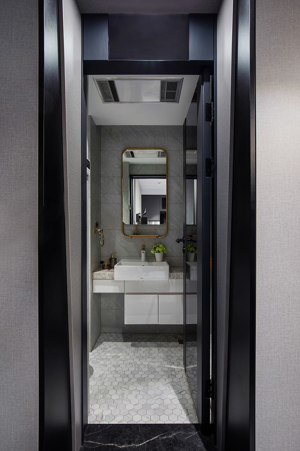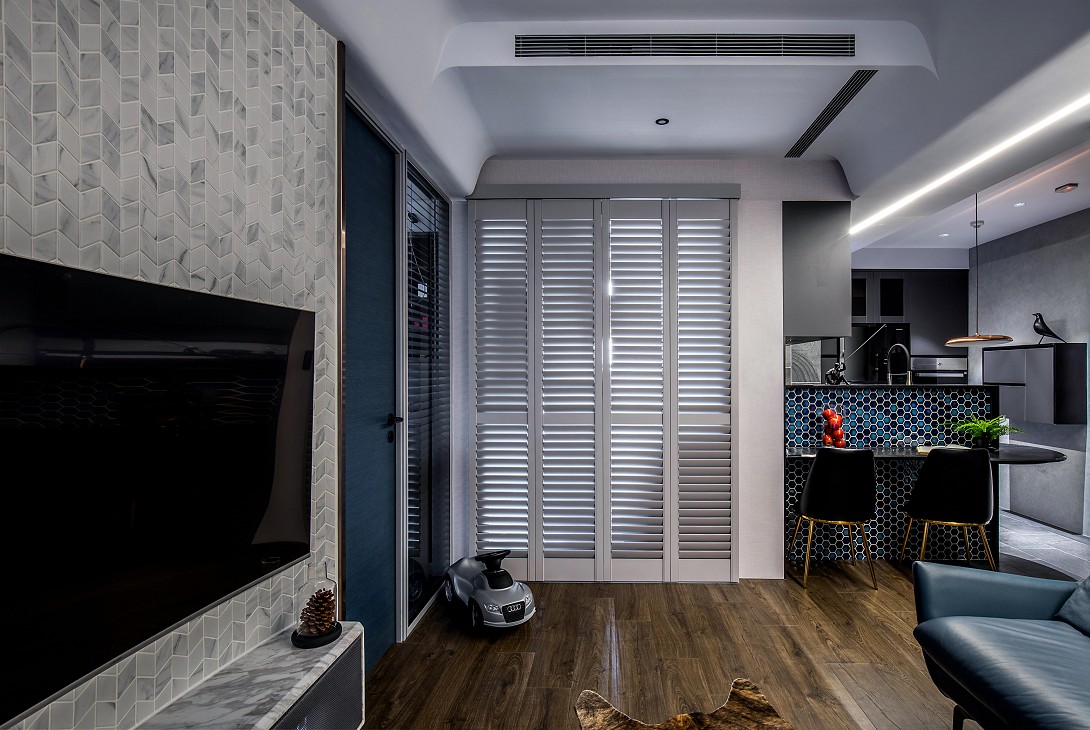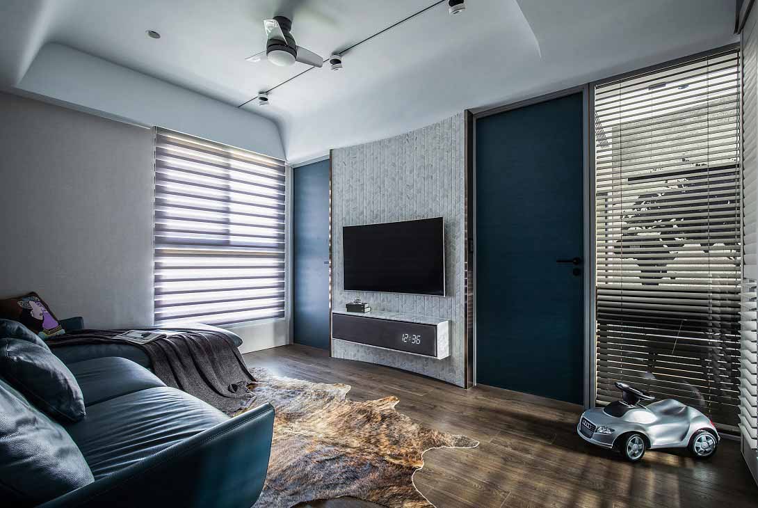 熱愛旅行的夫妻,有著征服世界的美夢,在異國的時間待久了,對家的眷戀便悄然而生,因此累積了許多住宿體驗,重新定義新家。設計手法依夫妻倆喜愛的時尚飯店風格為訴求,以冷/灰色調打底,並與各種異材質相互呼應,打造一間精品小宅,沙發背牆選擇紐約曼哈頓天際線大圖,讓原本的小客廳有視覺延伸的開闊感,並強調旅人的生活態度!主臥睡眠區以灰色系的布皮沉穩配色,加上局部光源,塑造空間的安定感。