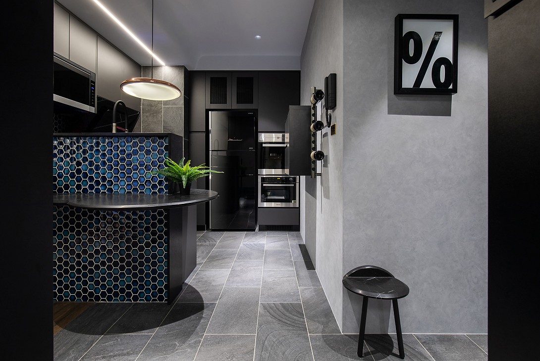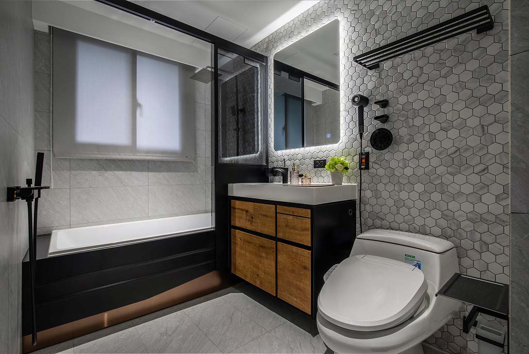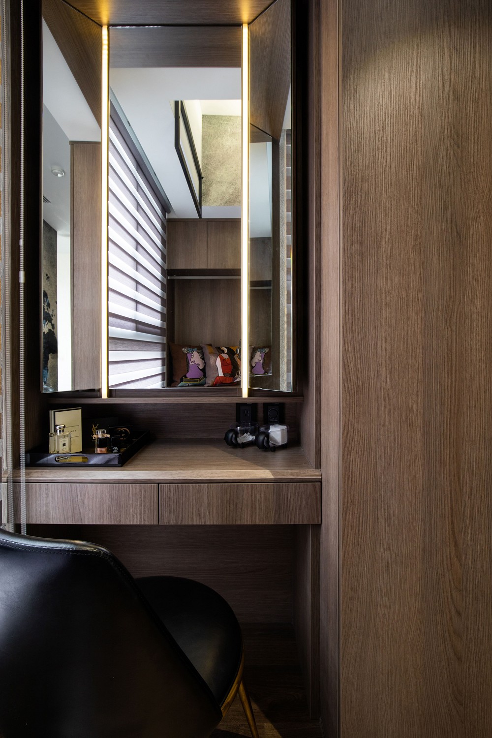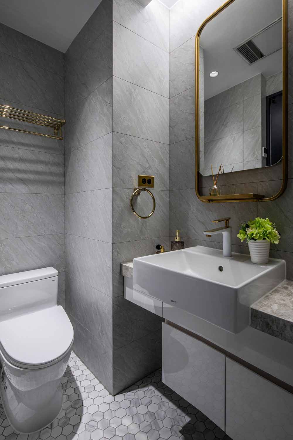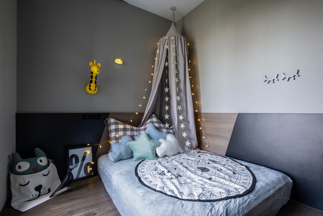 熱愛旅行的夫妻,有著征服世界的美夢,在異國的時間待久了,對家的眷戀便悄然而生,因此累積了許多住宿體驗,重新定義新家。設計手法依夫妻倆喜愛的時尚飯店風格為訴求,以冷/灰色調打底,並與各種異材質相互呼應,打造一間精品小宅,沙發背牆選擇紐約曼哈頓天際線大圖,讓原本的小客廳有視覺延伸的開闊感,並強調旅人的生活態度!主臥睡眠區以灰色系的布皮沉穩配色,加上局部光源,塑造空間的安定感。