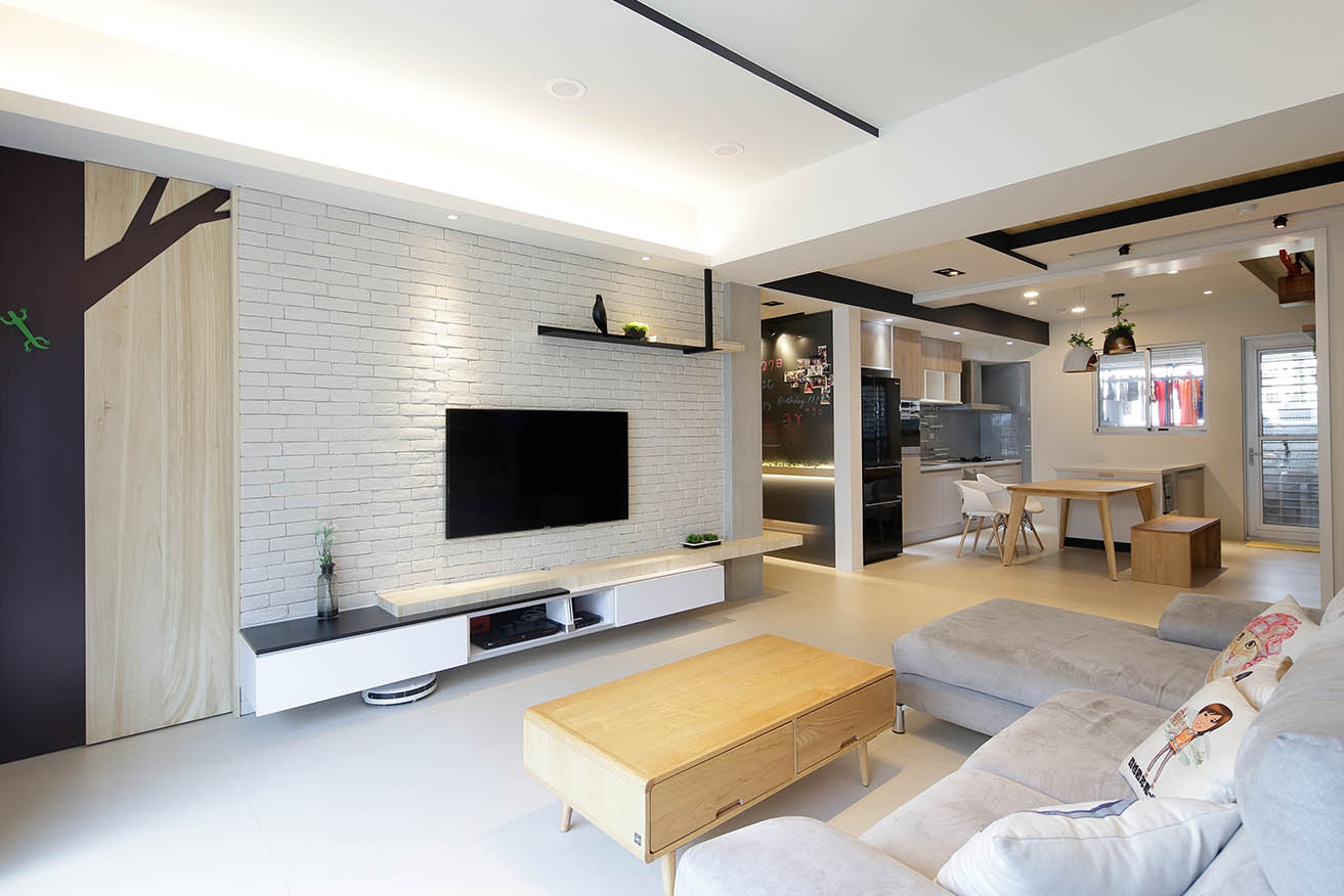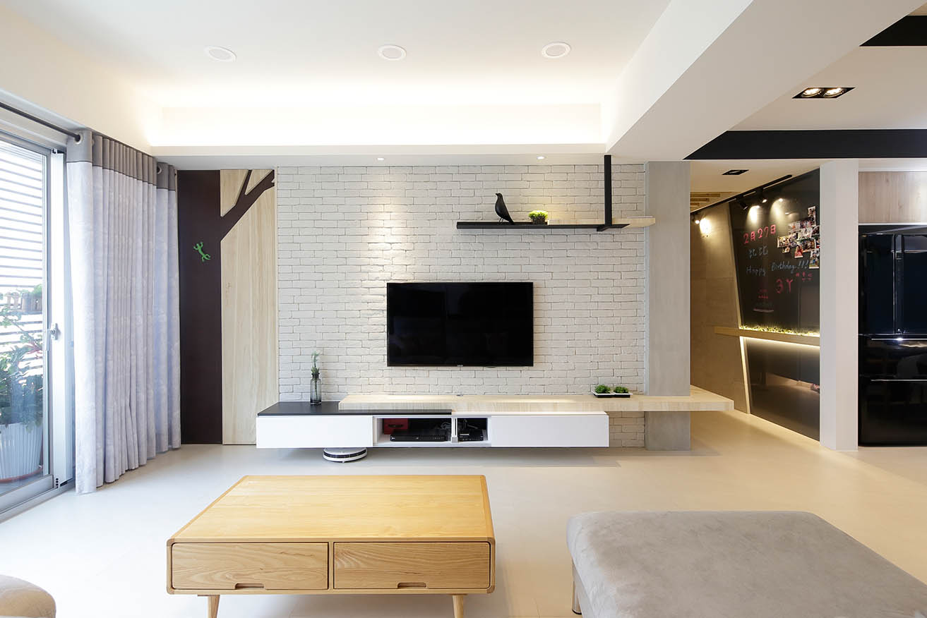 電視牆砌上質樸純白文化石,左側以枝幹狀隱藏拉門設計遊戲室入口,也象徵守護家園的大樹。沙發背後則是太太最嚮往的藏書牆,淺色書架搭配深灰背板,加上錯落有致的書格規劃,立體感十足,為客廳營造最有氣質的背景畫面。