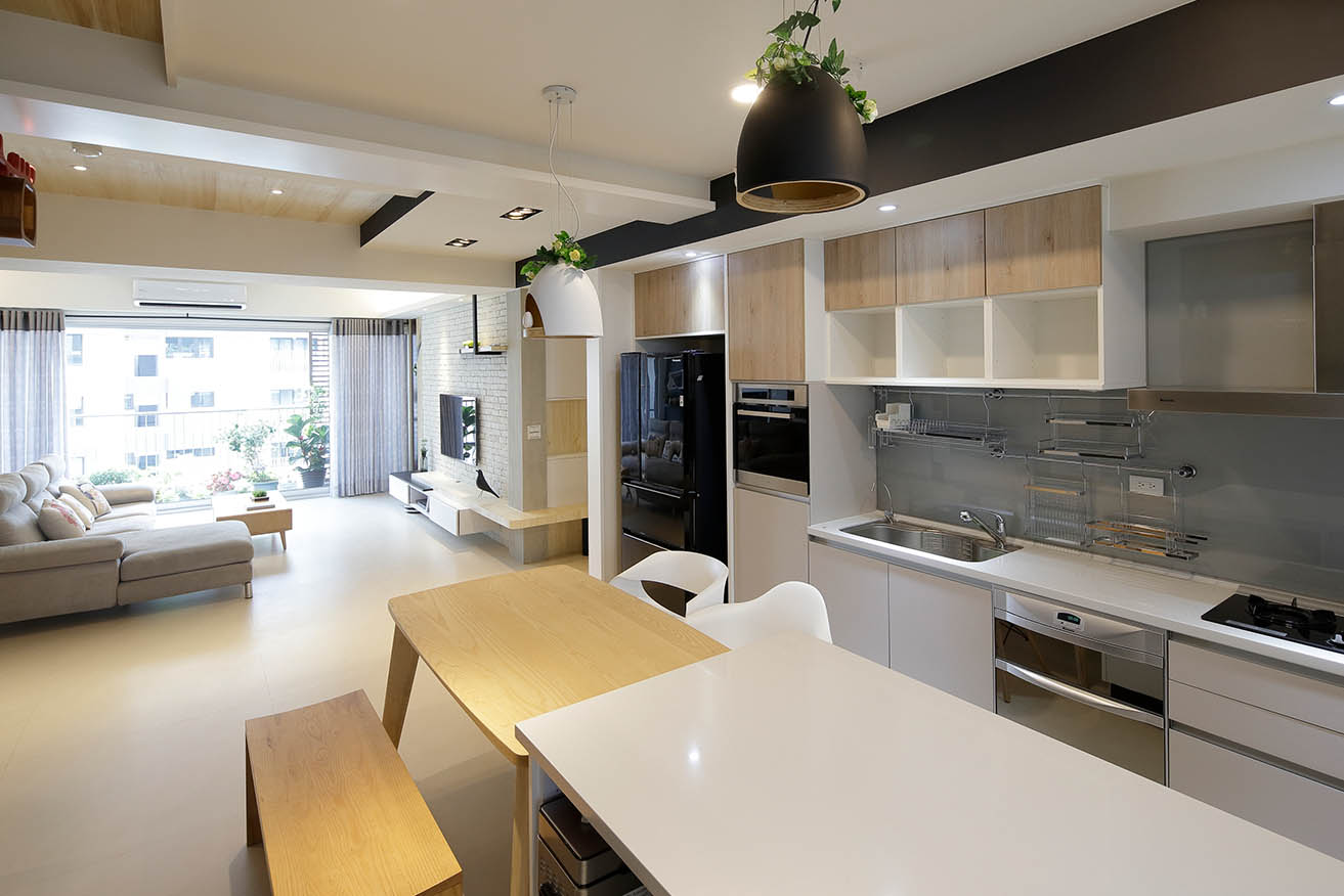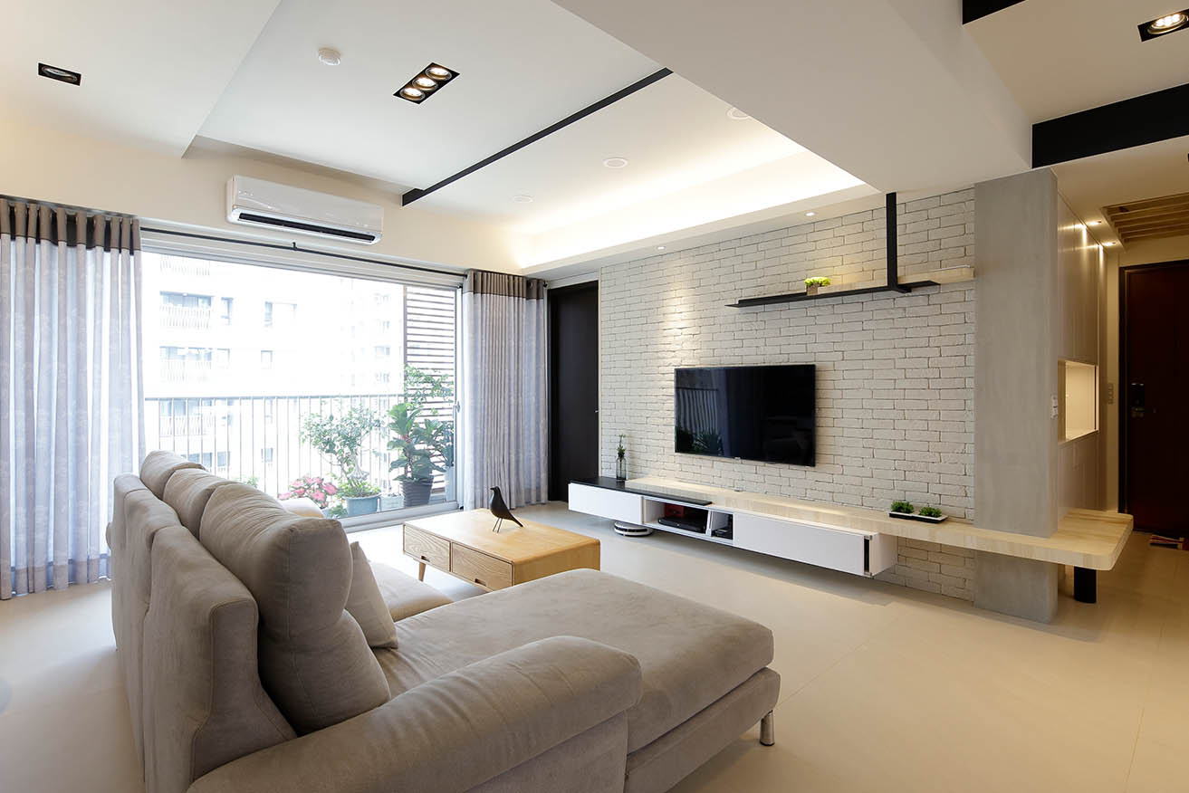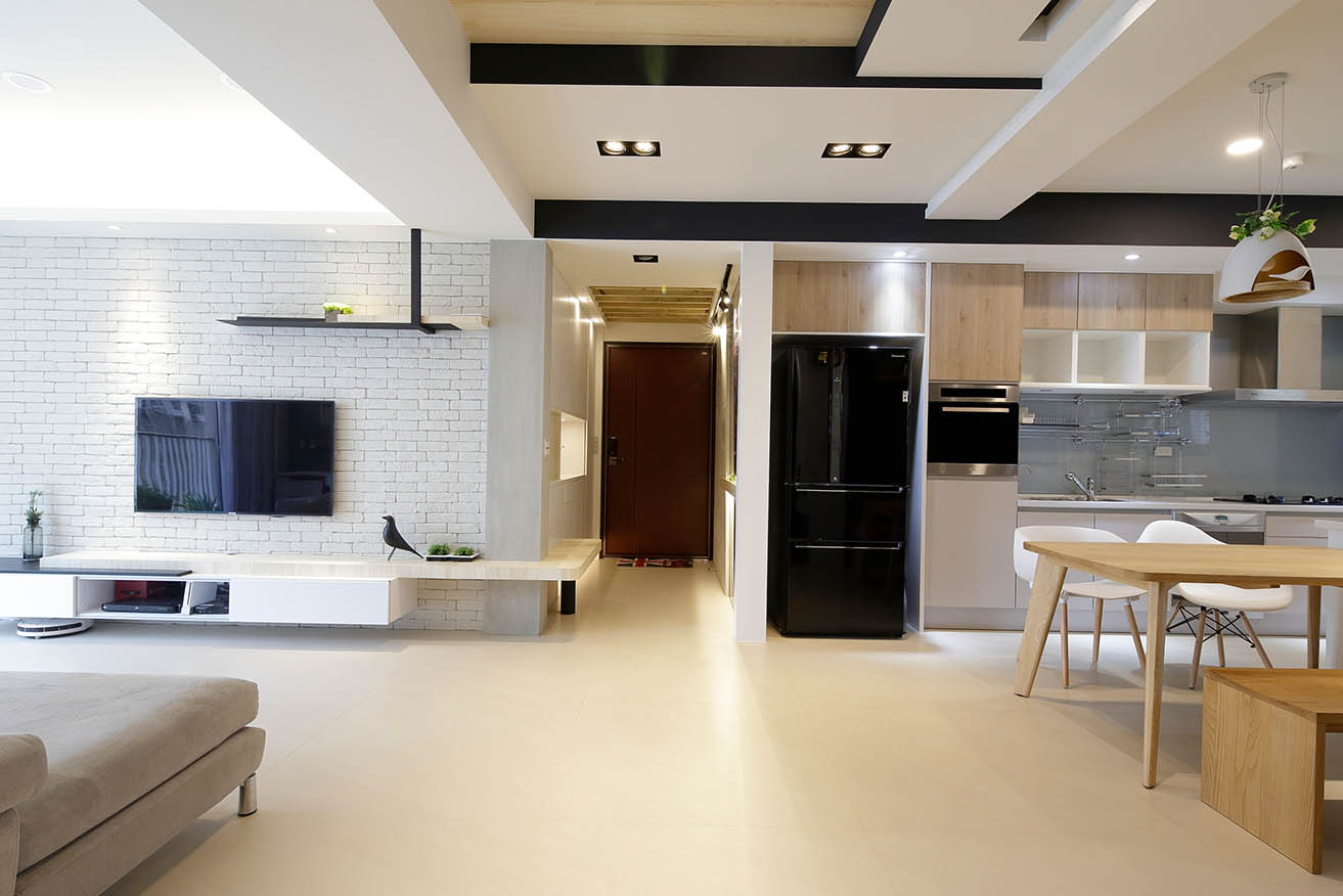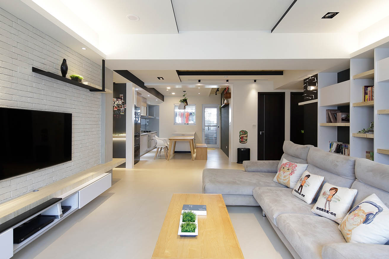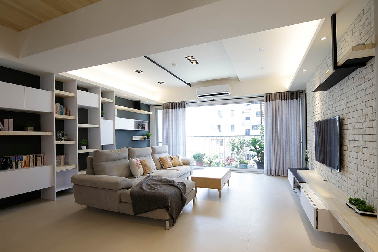 系統櫃、木作天花板造型、文化石、樂土、鐵件、崁燈、間接照明