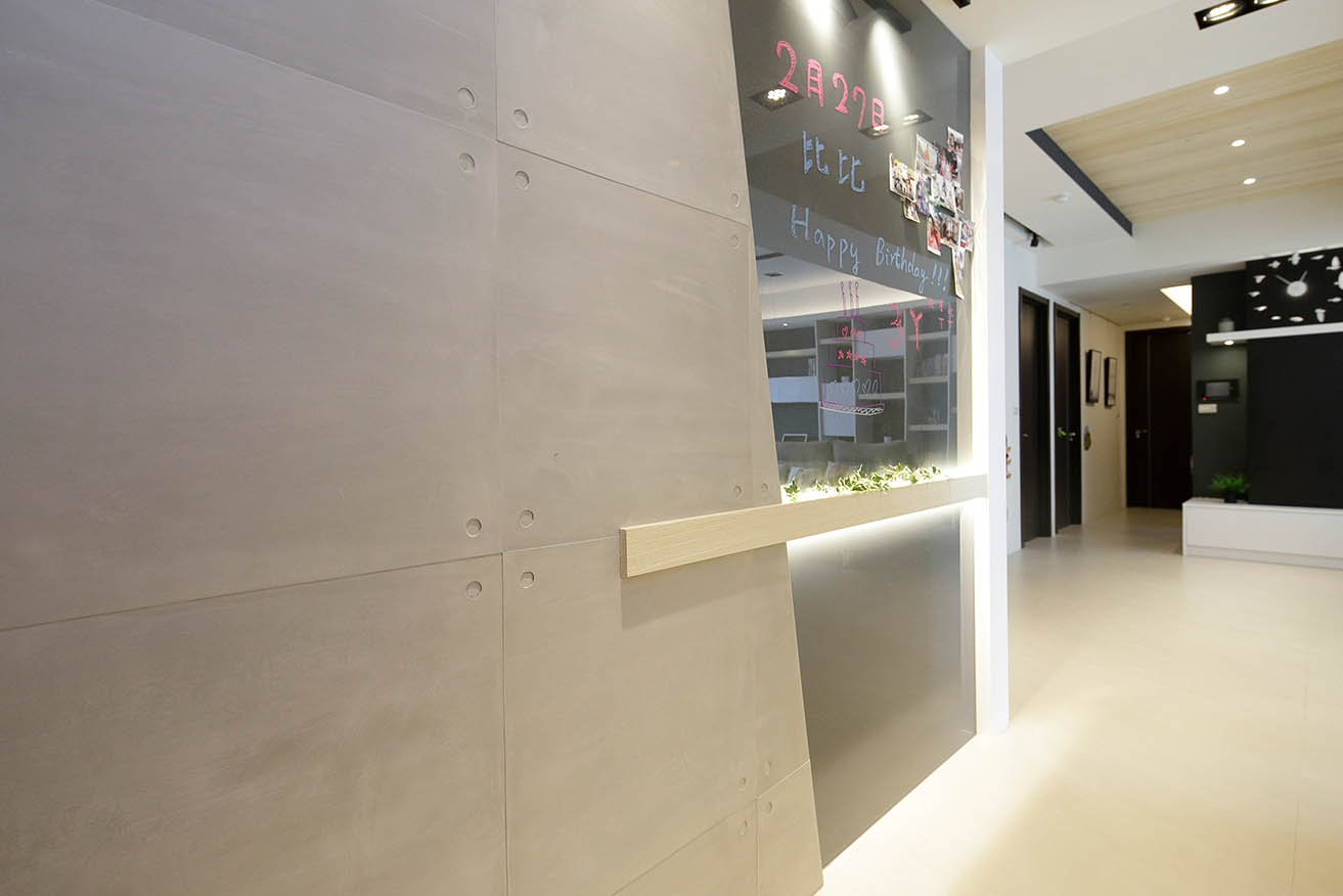 牆邊樑柱以樂土包覆,呼應對側相同材質的清水模質感牆面。鞋櫃內側選用童趣的彩色層板,鼓勵孩子們自己收納鞋子;烤漆玻璃製成的塗鴉牆是家人記錄大小事的好所在,下方木作扶手則是專為爺爺規劃的無障礙設計,搭配天花板隔柵造型,完成一處美觀與功能兼具的生活空間,也徹底展現設計師貼心與專業。