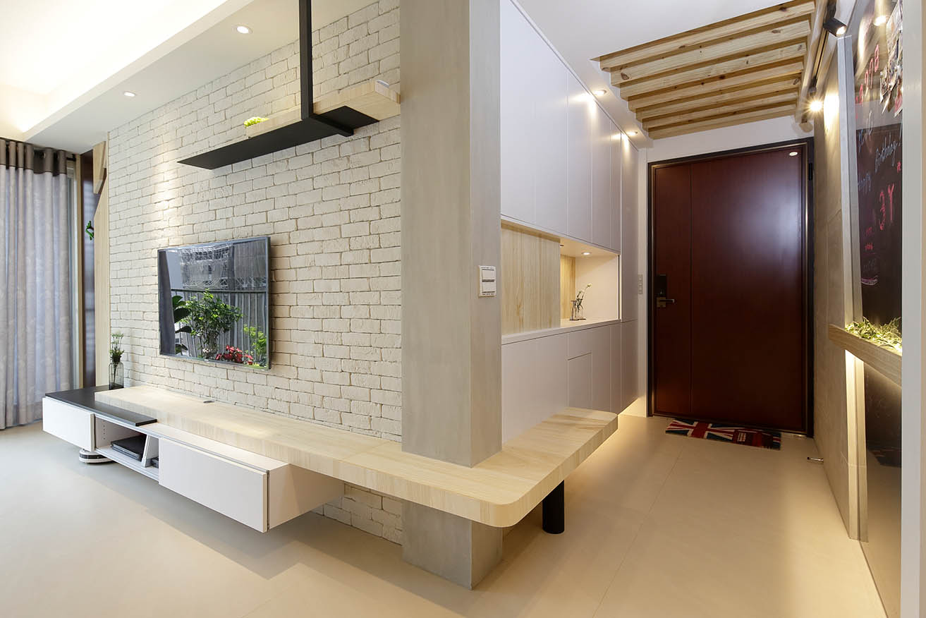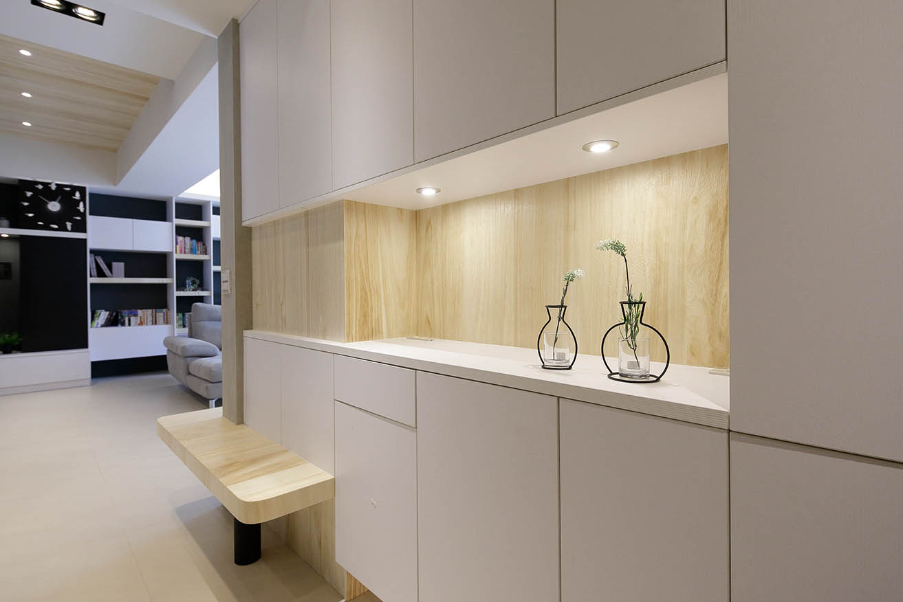 為了將玄關原有內凹空間與電視牆作整合,並考慮到鞋類收納及家中長輩的動線,設計師利用木作設計 L型檯面穿鞋椅,打圓角設計防止孩子碰撞,流暢曲線一路延伸至電視牆,成為展示層架一部分。