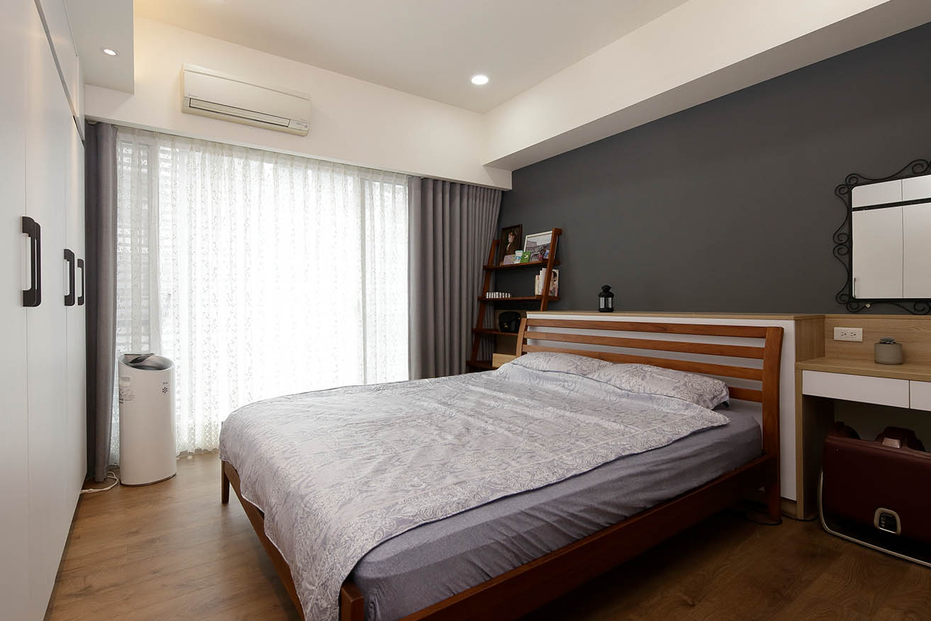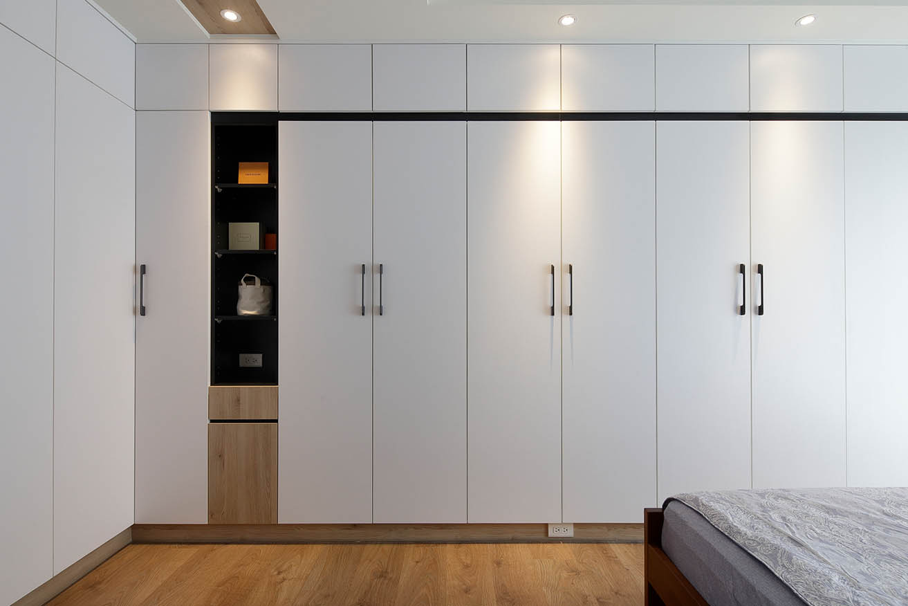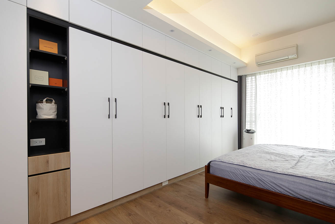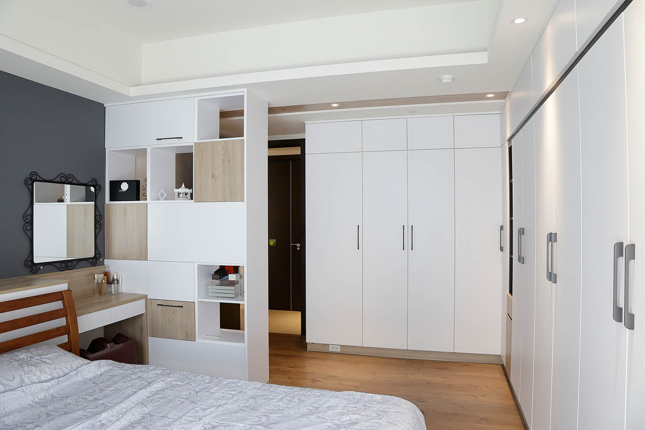 主臥室為附衛浴的套房格局,同時屋主也需要容量充足的衣櫃,採用Order系統家具,以德國進口低甲醛板材打造,讓重視健康的屋主倍感安心。為了延續整片系統櫃的連貫美感,浴室門被藏入衣櫃,整片綿延的純白門板看來整齊劃一,營造清爽視覺。床頭避免壓樑設計了上掀式的大容量收納櫃,梳妝台與多功能屏風櫃則加入淺色鋼刷木紋門板,以木質跳色增添變化。