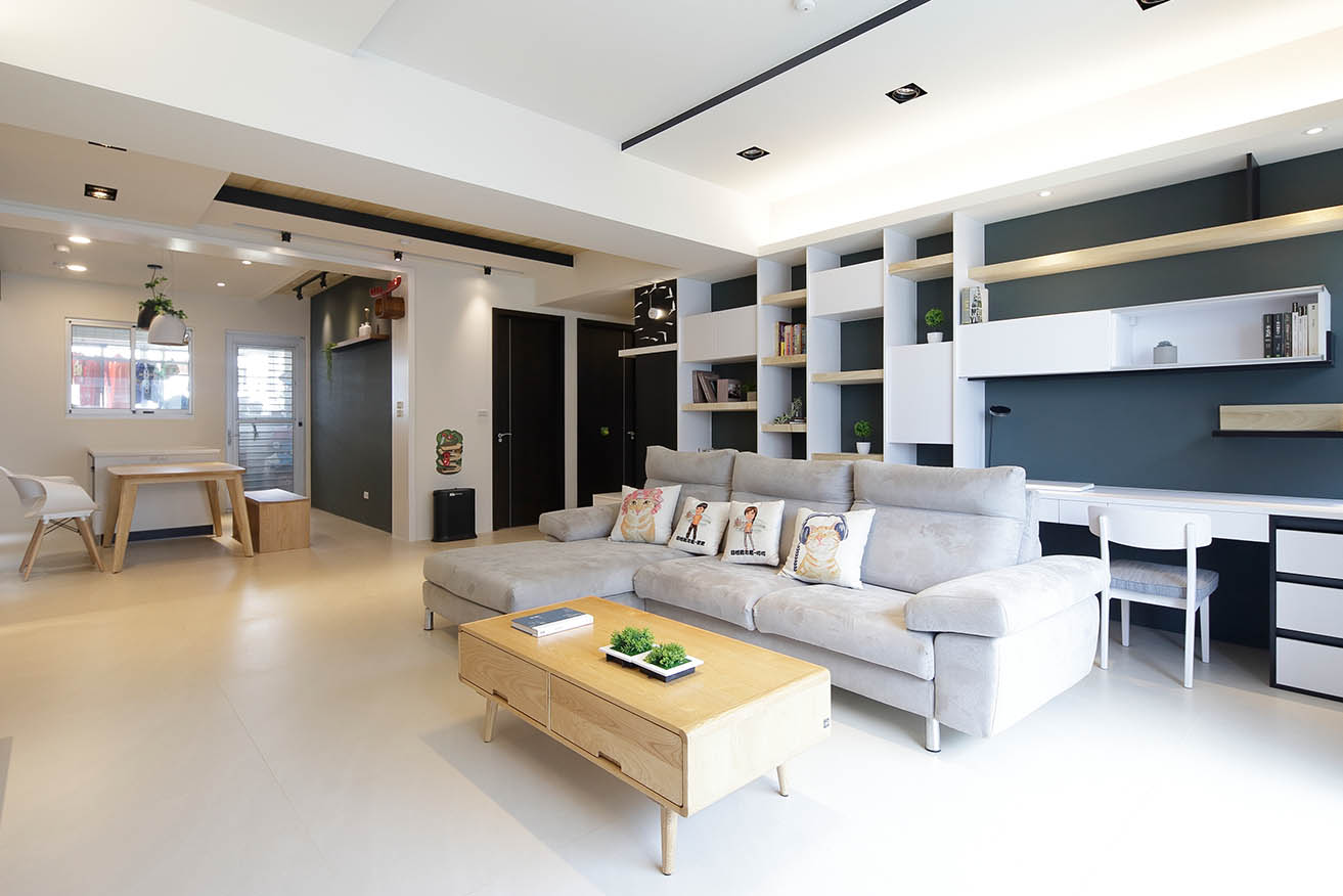 客廳及餐區為相連開放式結構,留出開闊空間讓孩子們自在跑跳。電視牆砌上質樸純白文化石,左側以枝幹狀隱藏拉門設計遊戲室入口,也象徵守護家園的大樹。沙發背後則是太太最嚮往的藏書牆,淺色書架搭配深灰背板,加上錯落有致的書格規劃,立體感十足,為客廳營造最有氣質的背景畫面。