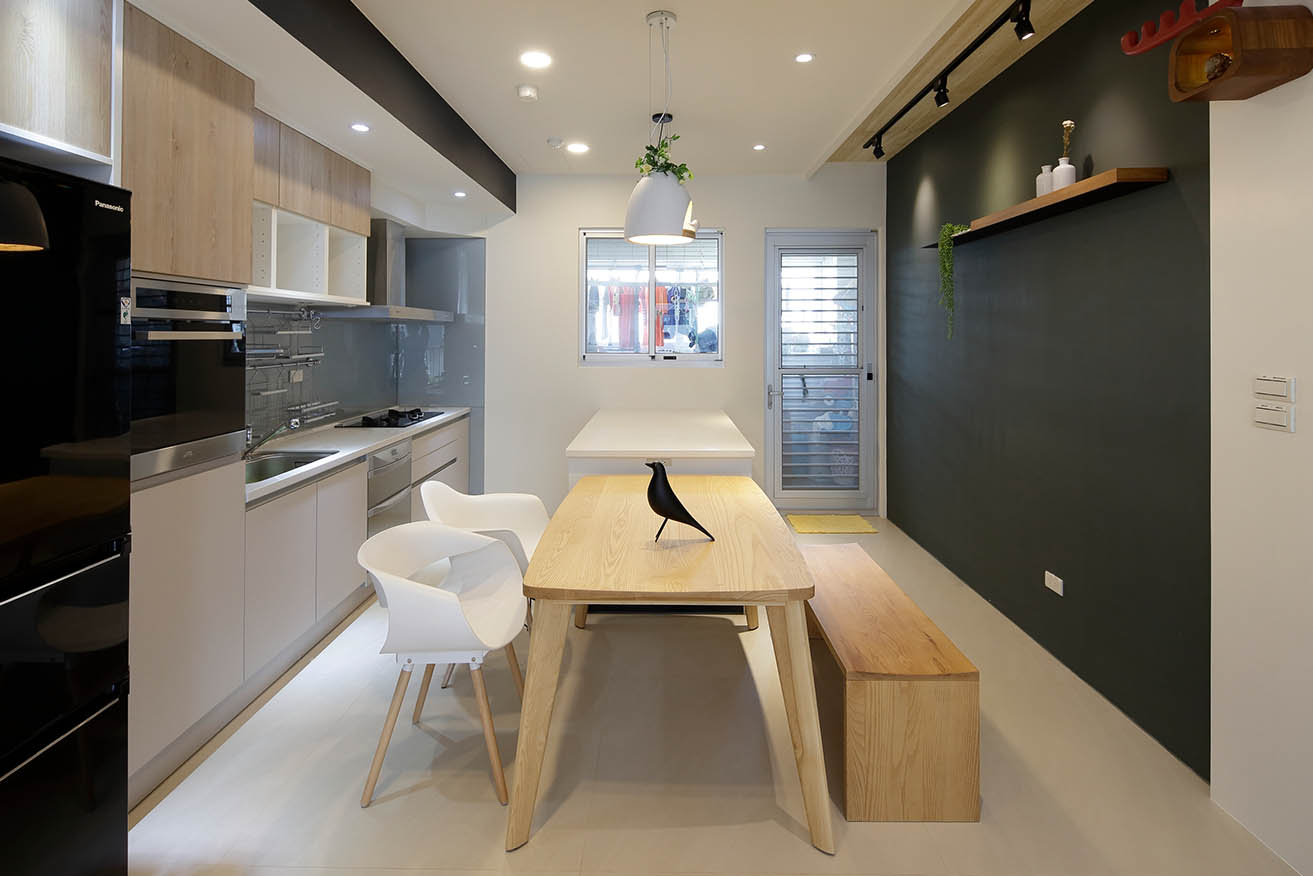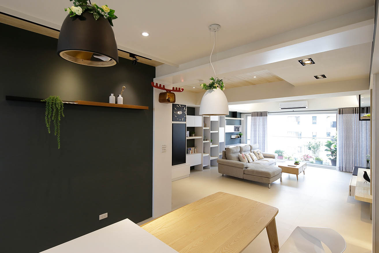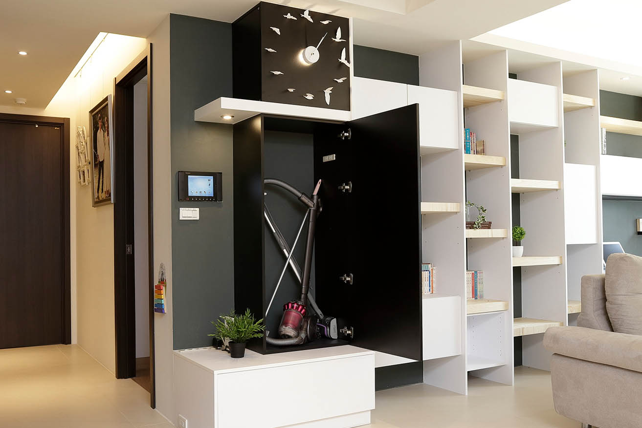 書牆下目前擺放電腦桌,屋主將來希望在此擺放一架直立式鋼琴,設計師貼心以系統板材規劃與鋼琴尺寸相同的書桌,需要時可以迅速拆卸,板材還可重複利用。靠近走廊的位置是整個起居空間的中心,也是一進門就會映入眼簾的端景區,設計師特別請屋主挑選燕子時鐘裝於門板帶有歸巢寓意,並加入情境照明,完成專屬石家的端景裝飾。下方設計吸塵器專屬隱藏式收納櫃及插座,方便隨時充電、取出打掃。