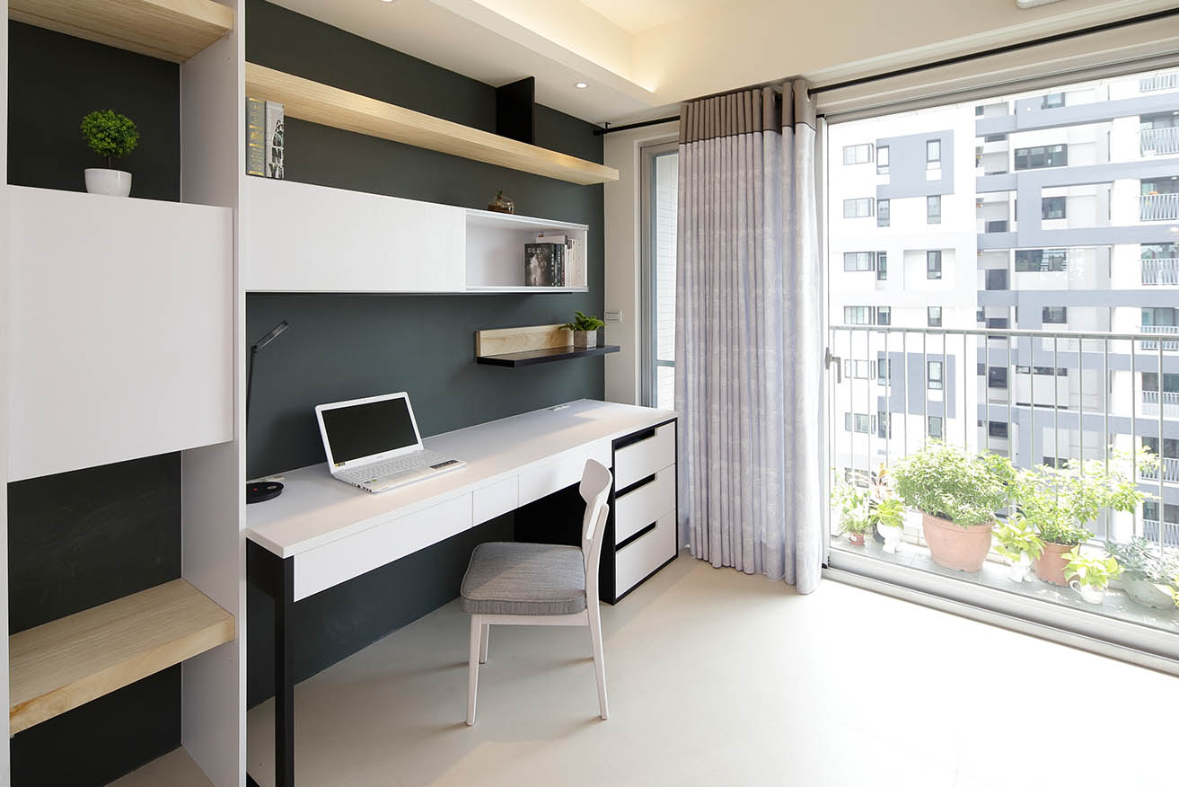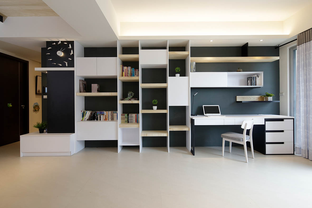 書牆下目前擺放電腦桌,將來希望在此擺放一架直立式鋼琴,設計師貼心以系統板材規劃與鋼琴尺寸相同的書桌,需要時可以迅速拆卸,板材還可重複組裝。