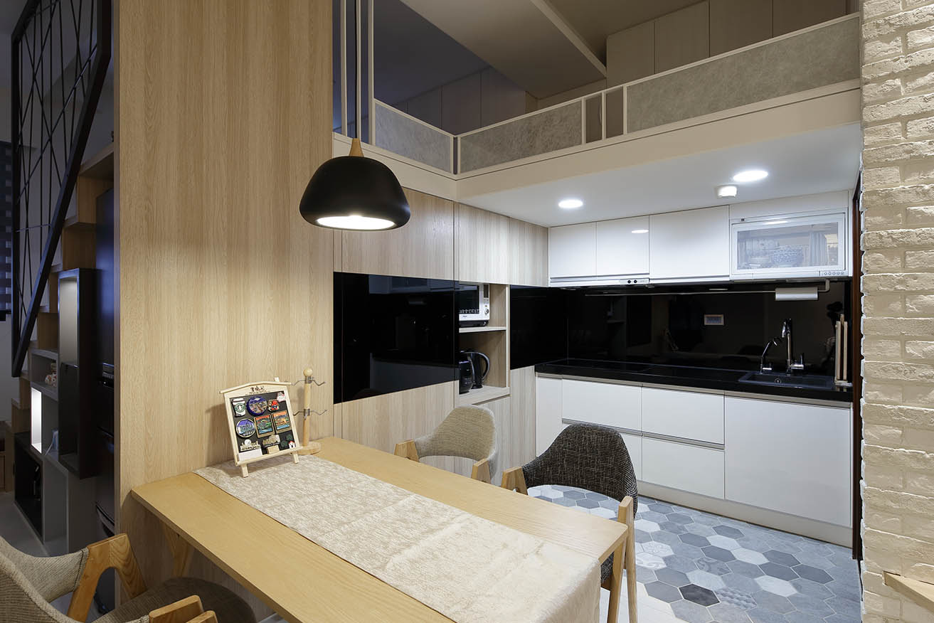 設計師操刀規劃後的北歐風夾層屋,有別於過往的窄長樣貌,透過高挑木板拉抬立面高度、連結夾層設計,使整體空間寬敞舒適,更讓小坪數空間多了獨立小天地,滿足兩人想稍微獨處的時候。而空間亮點之一的廚房,於地面鋪設深淺不一的灰白色花磚,點綴整體色彩的同時,也展現出俐落的層次。