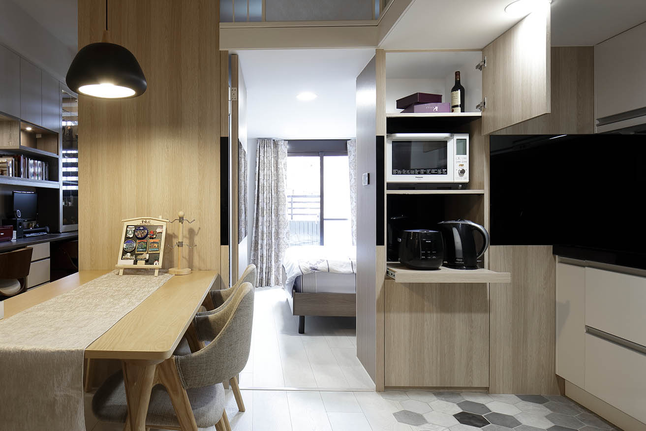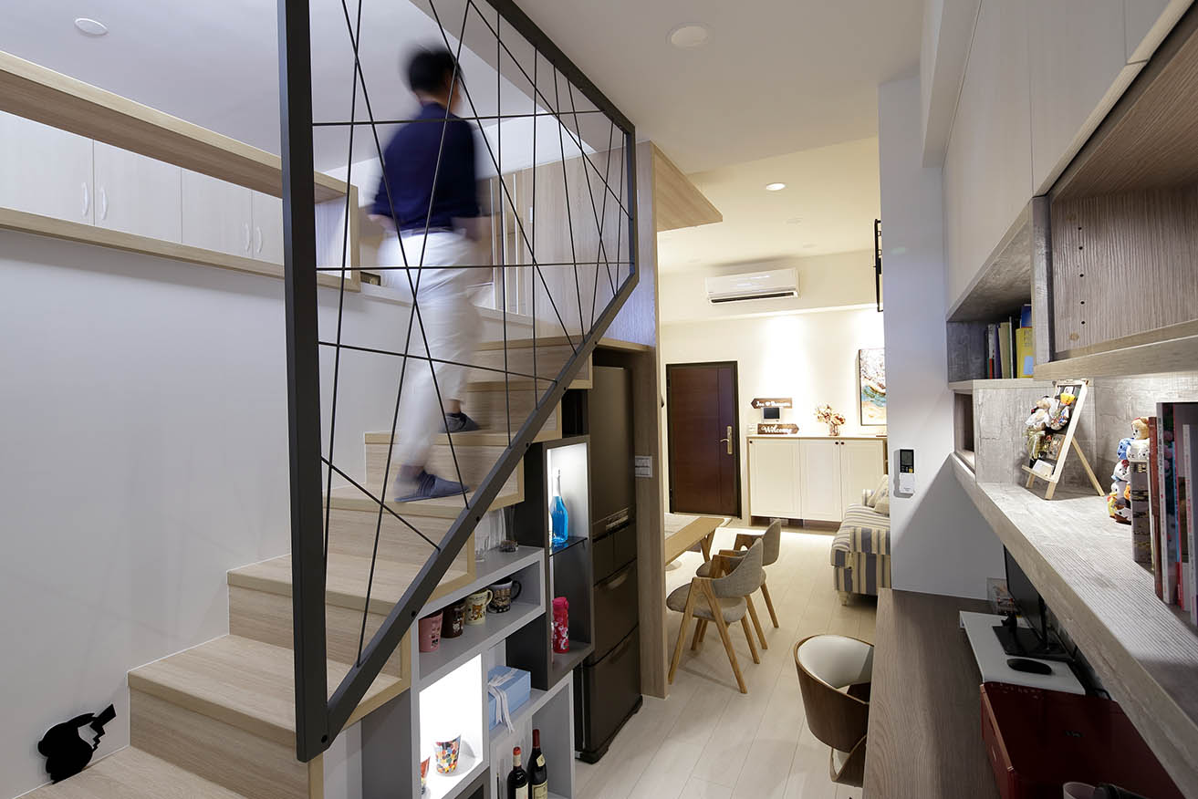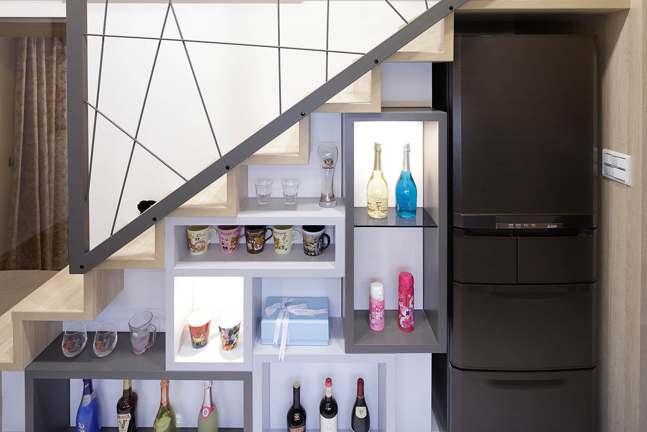 針對小坪數空間,使用面積更得精打細算,別放過家中任何一個角落,特別是樓梯下方的畸零空間,採用依高度漸進的收納櫃體,展現與臥室共通的高功能,可置入大體積的冰箱、與不同灰階色彩櫃子,搭配燈光調節氛圍,表現系統櫃的趣味性格。