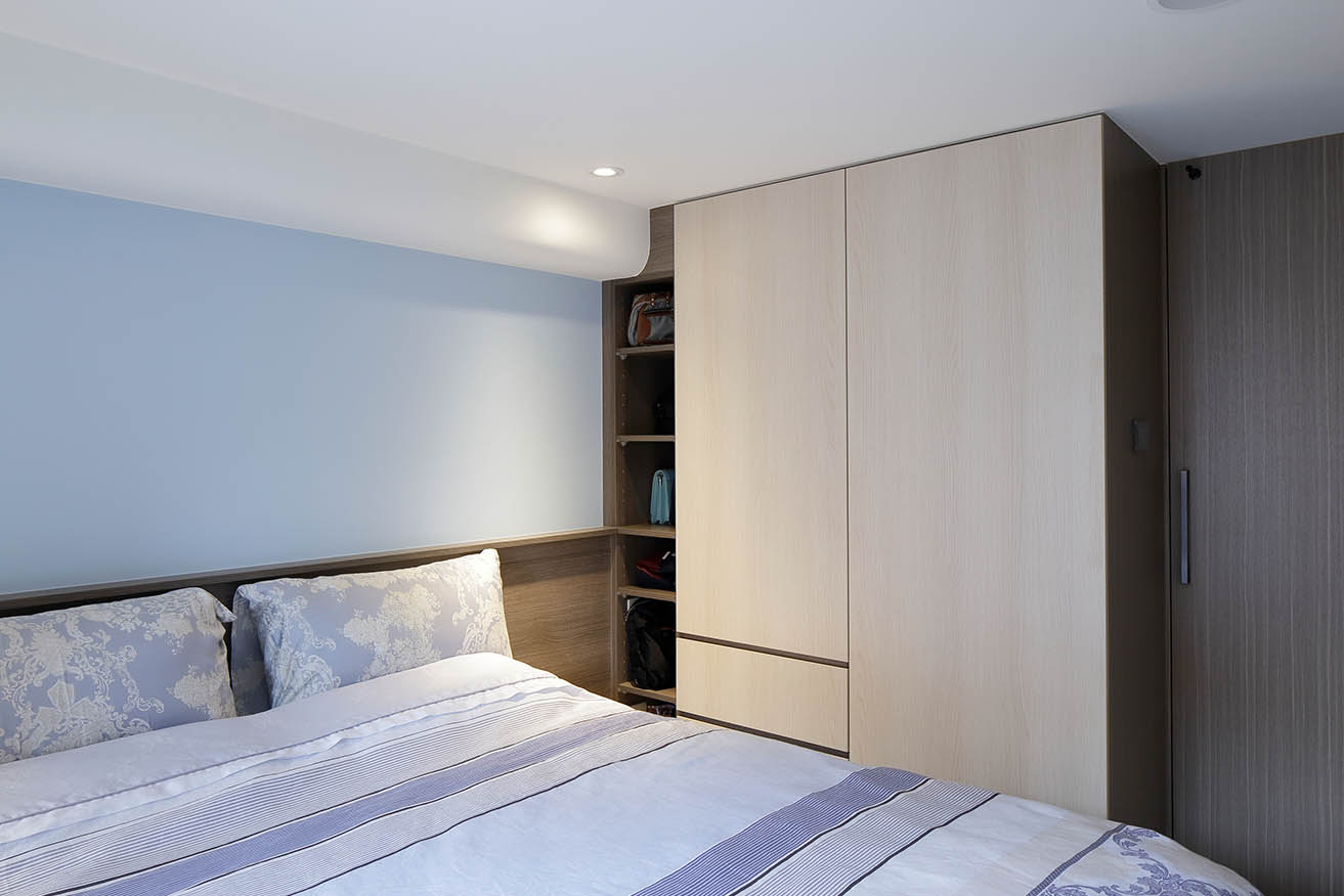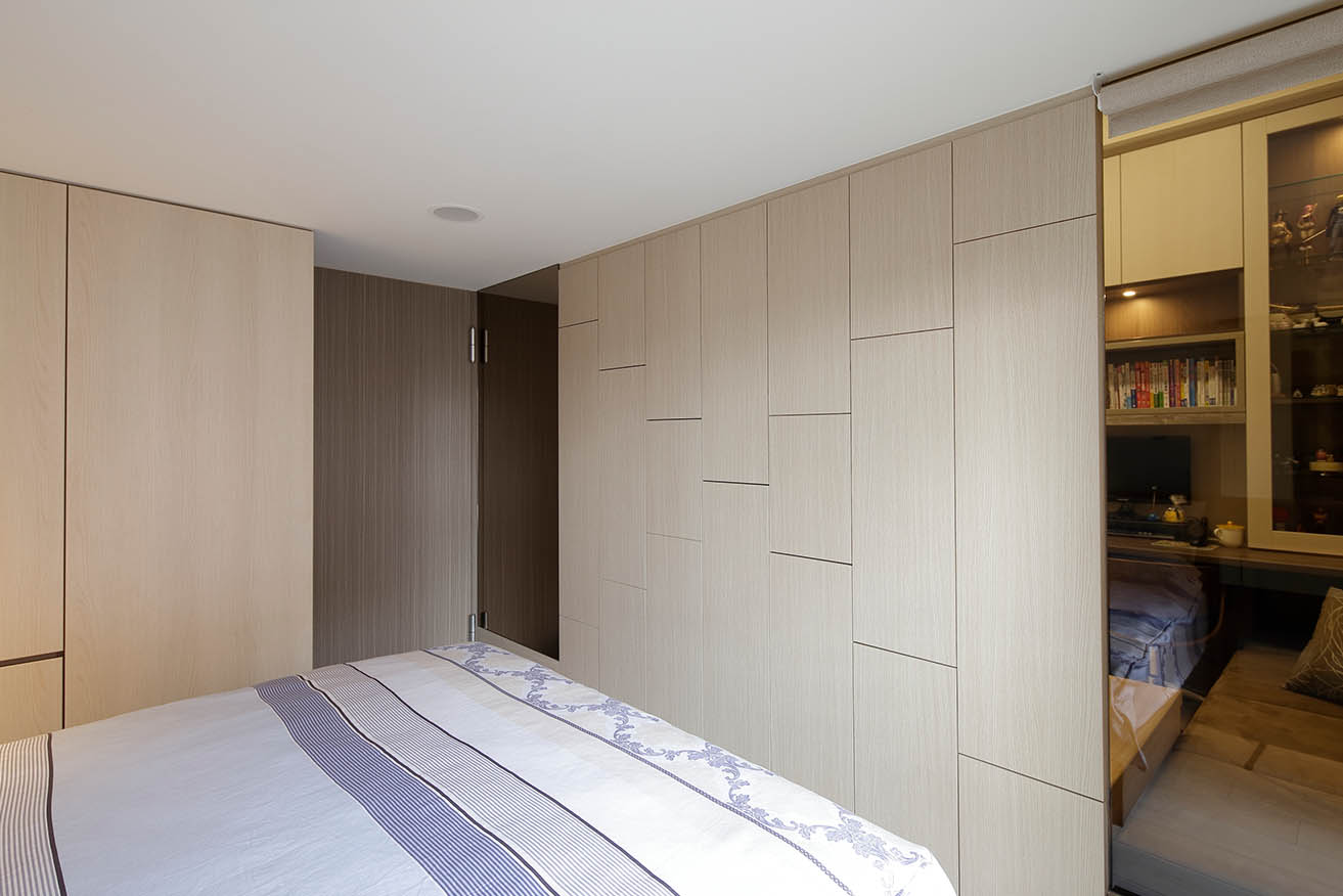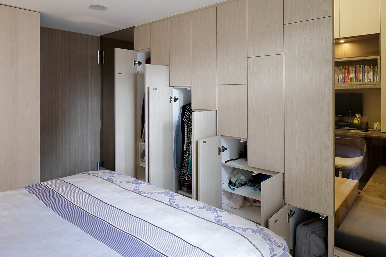 針對小坪數空間,使用面積更得精打細算,別放過家中任何一個角落,特別是樓梯下方的畸零空間,採用依高度漸進的收納櫃體,展現與臥室共通的高功能,可置入大體積的冰箱、與不同灰階色彩櫃子,搭配燈光調節氛圍,表現系統櫃的趣味性格。