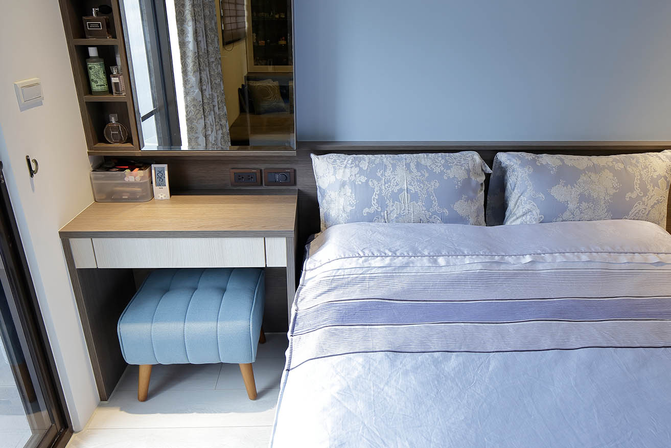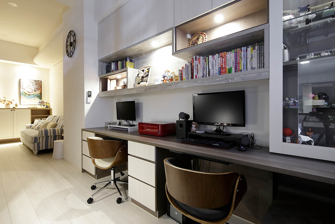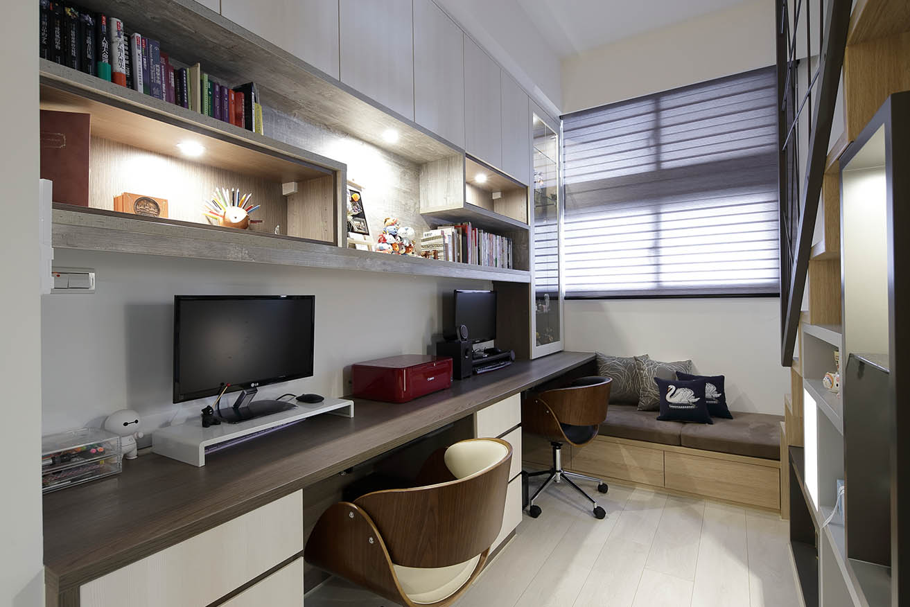 選擇的錯落式長型書櫃,以柔和線條+溫潤木作,結合高度統一的收納空間,能恰到好處的放置書本、相框與模型等物品,同時連結備有插座的長形雙桌面,滿足兩人一同休憩、工作的時候。此外,書櫃造型也呼應一旁樓梯的幾何欄杆,傳遞動感流暢的居家活力。