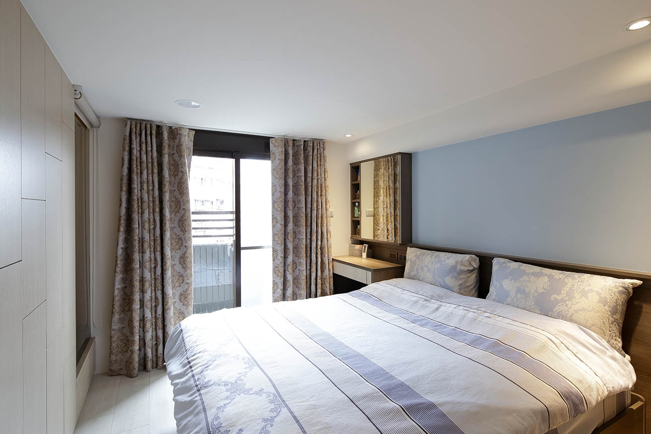 改造樓梯方向、保留原夾層設計結合燈光調節,使挑高3米6的房屋看起來更加寬敞,動線也顯得特別流暢,展現夾層空間的多功性,平時可放置廖太太喜愛的娃娃、若有客人來訪就變身為簡單客臥。以文化石塑造高挑的電視牆面,搭配餐廳旁的造型木板延伸整體高度,廚房則運用六角花磚來區隔場域功用,創造美感與實用兼具的開放空間。