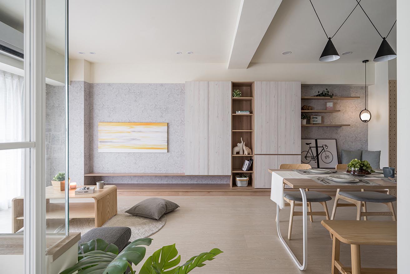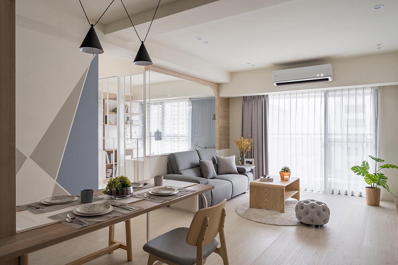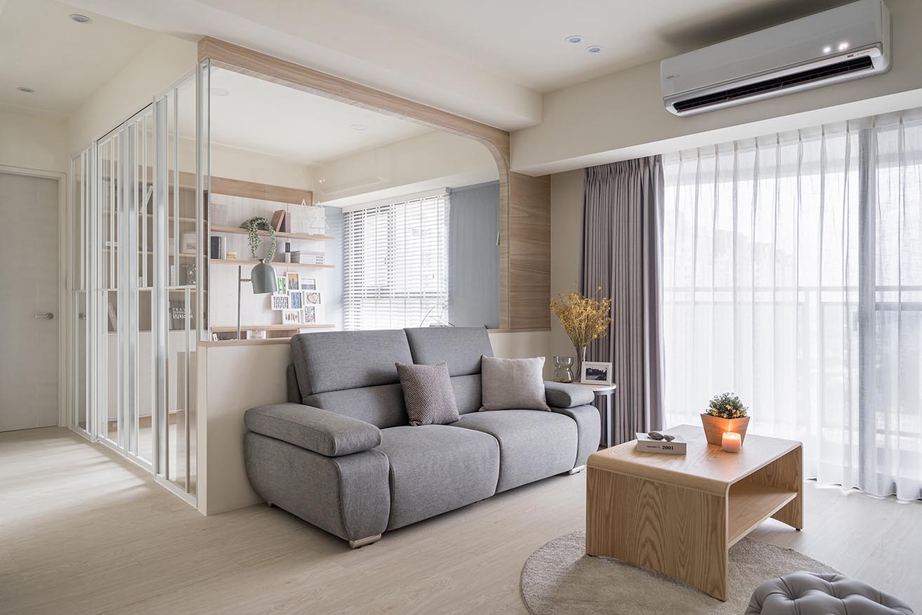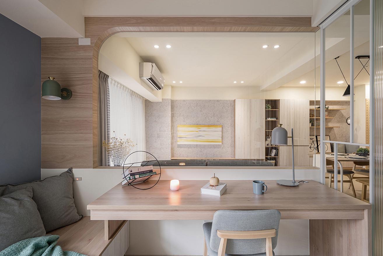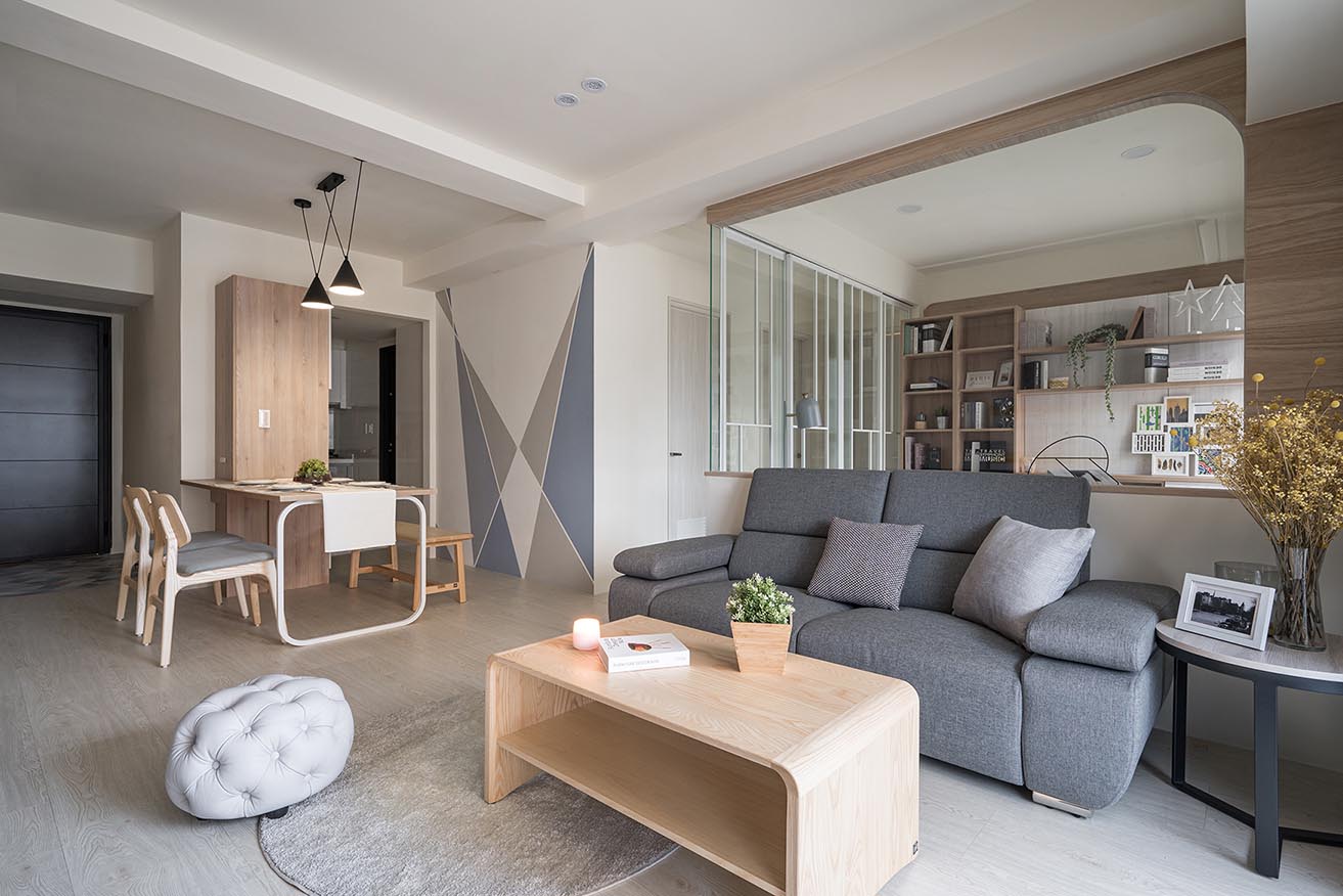 三房兩廳的基礎配置,將原始客廳背牆後的房間打通,作為休閒及閱讀的空間,並使用大片的玻璃嵌在中央,使空間更延伸,視覺空間更為寬廣。