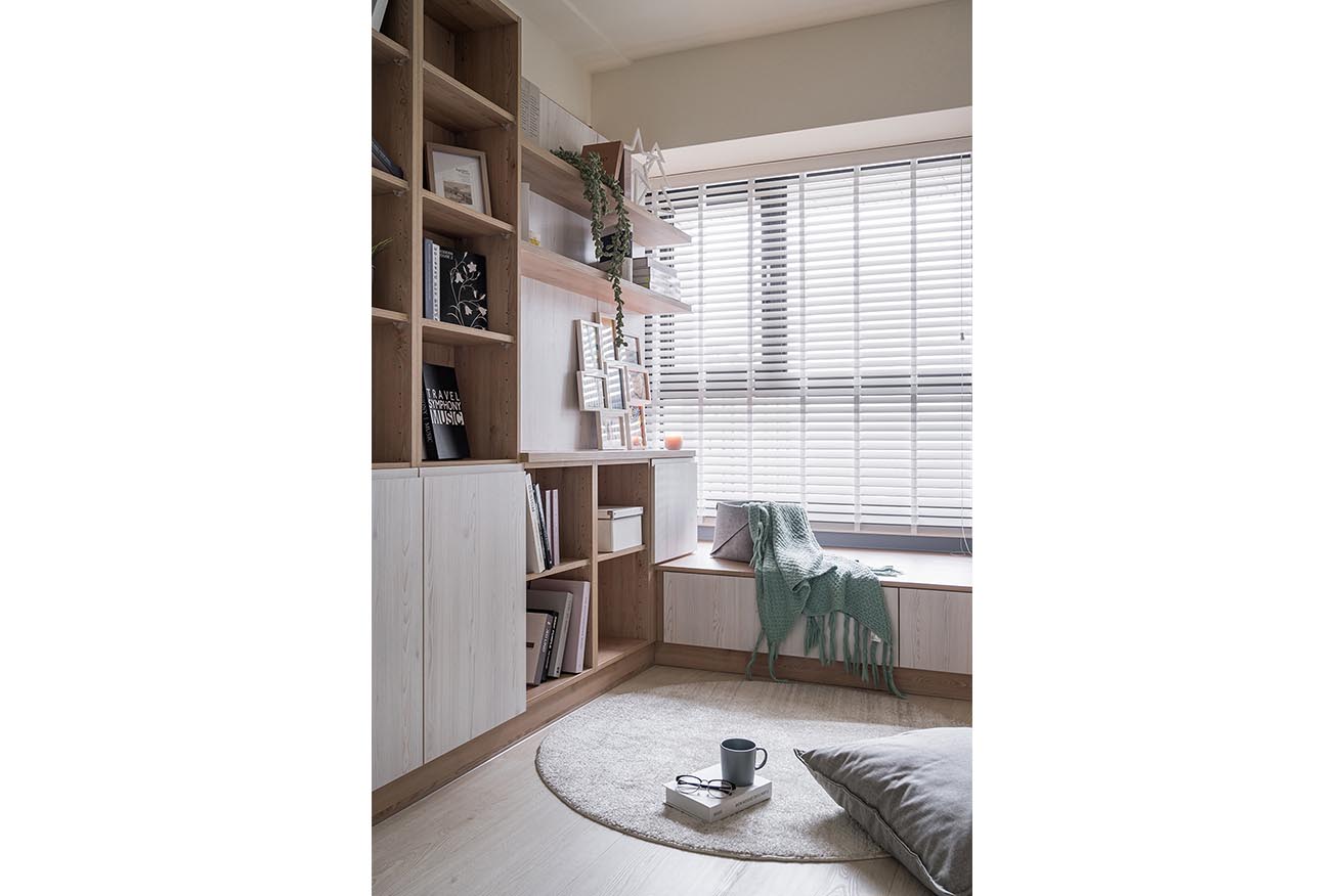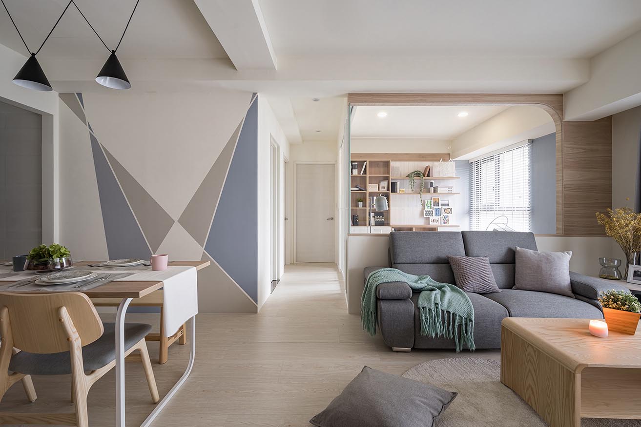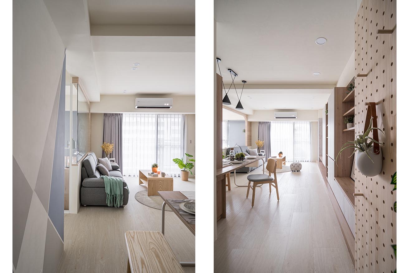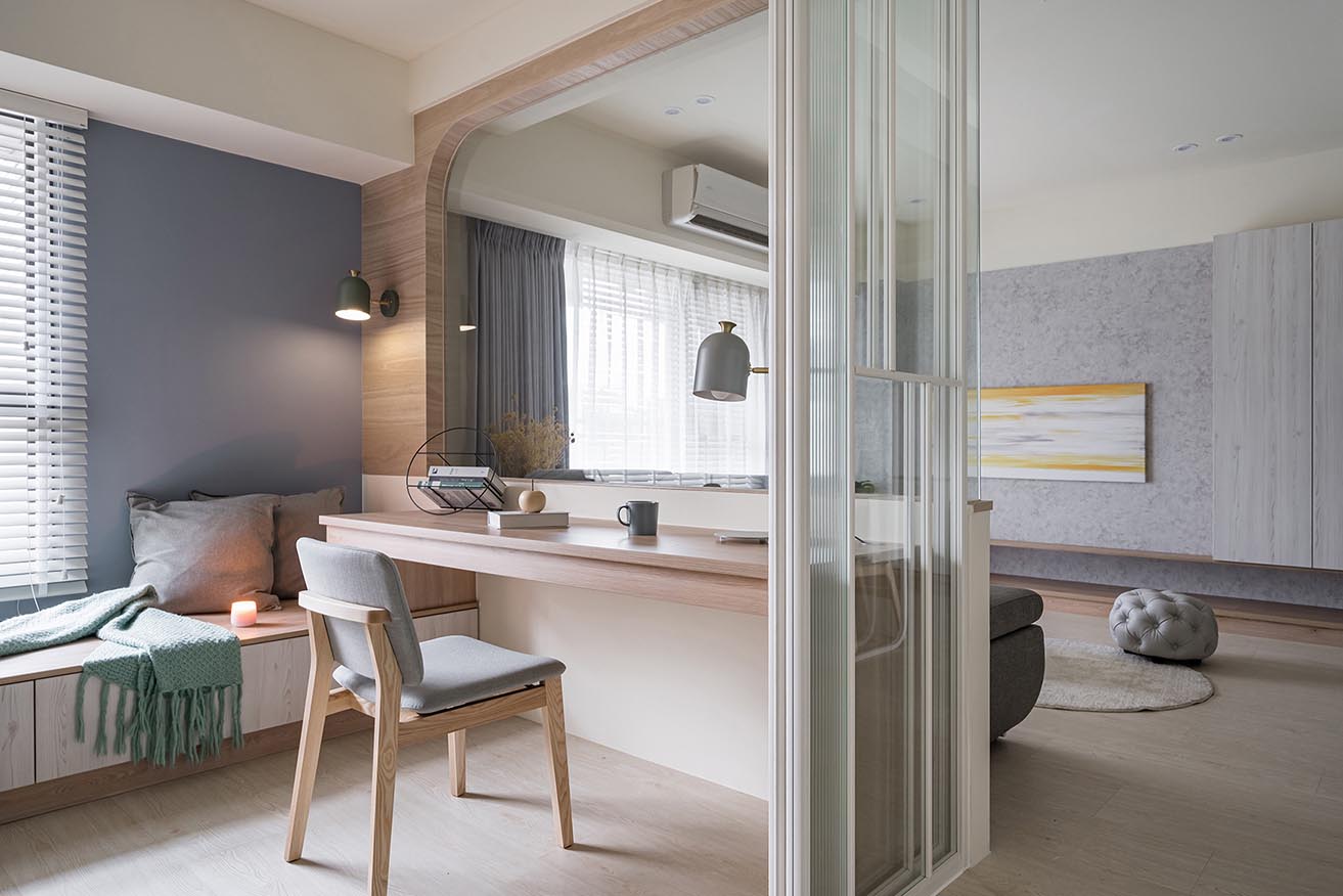三房兩廳的基礎配置,將原始客廳背牆後的房間打通,作為休閒及閱讀的空間,並使用大片的玻璃嵌在中央,使空間更延伸,視覺空間更為寬廣。