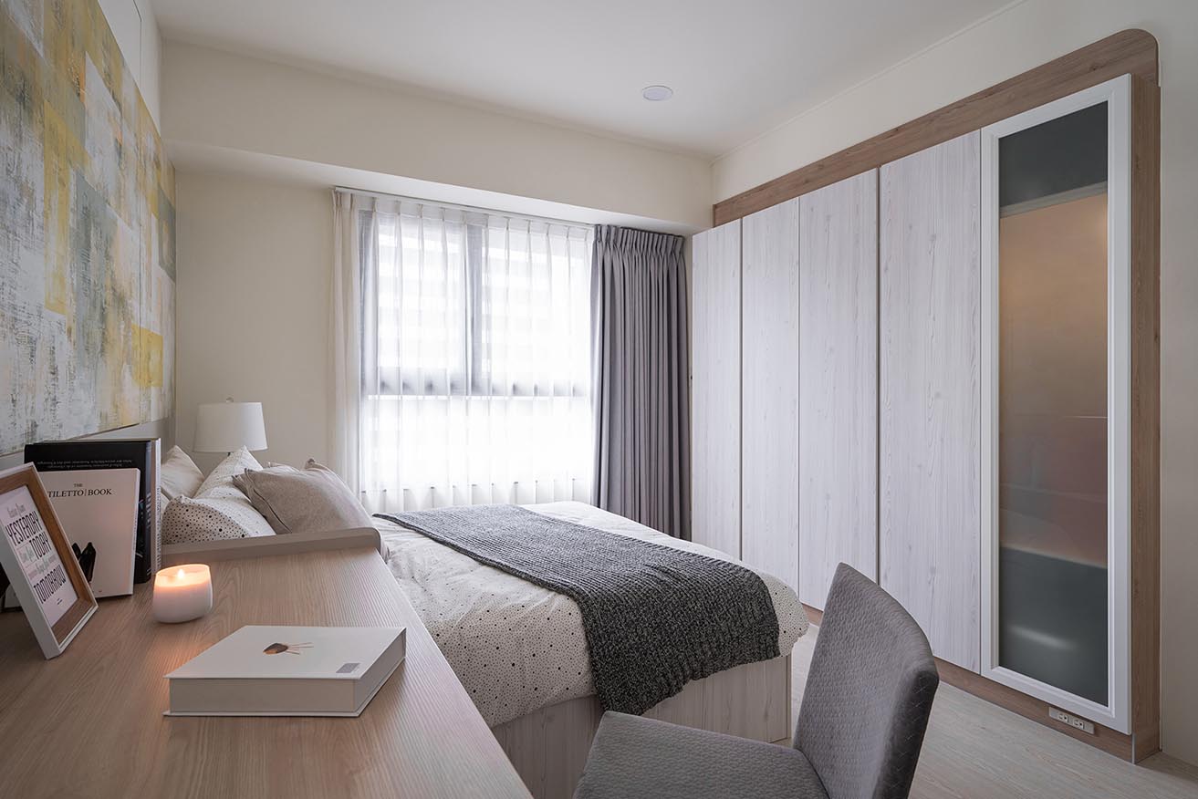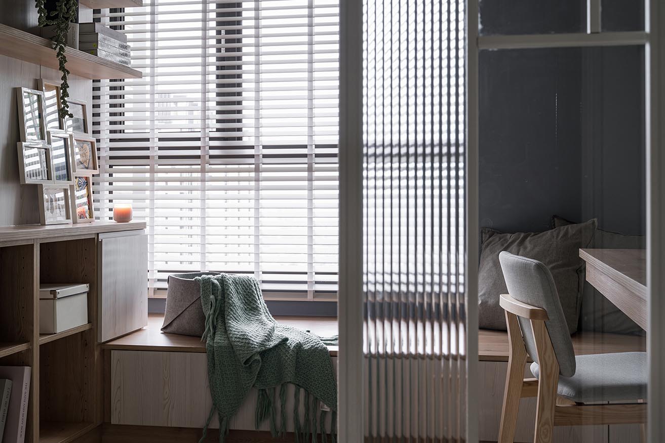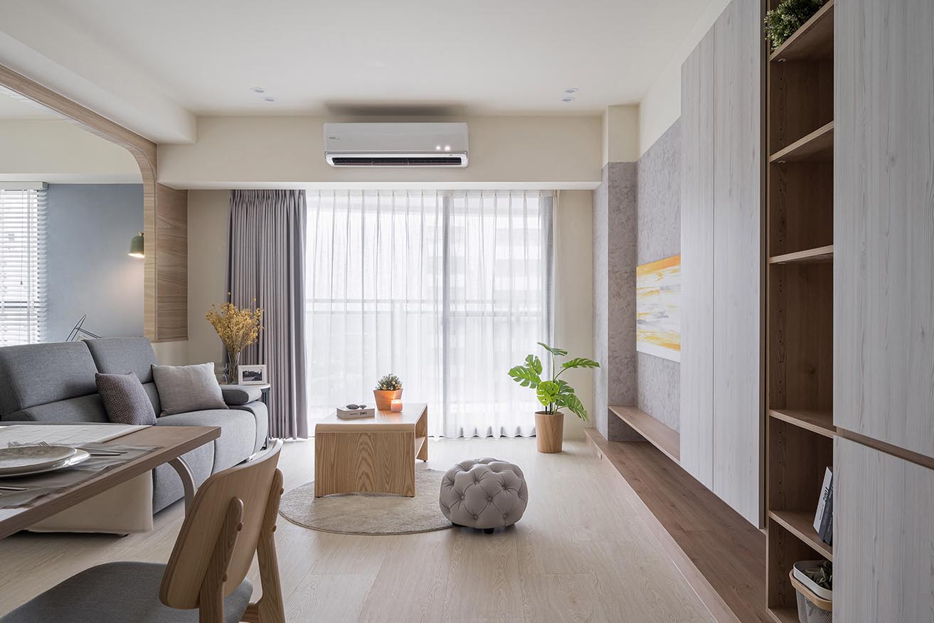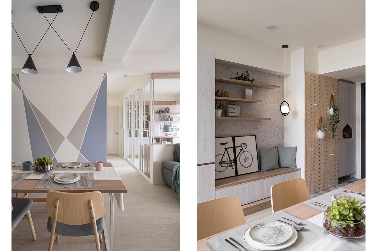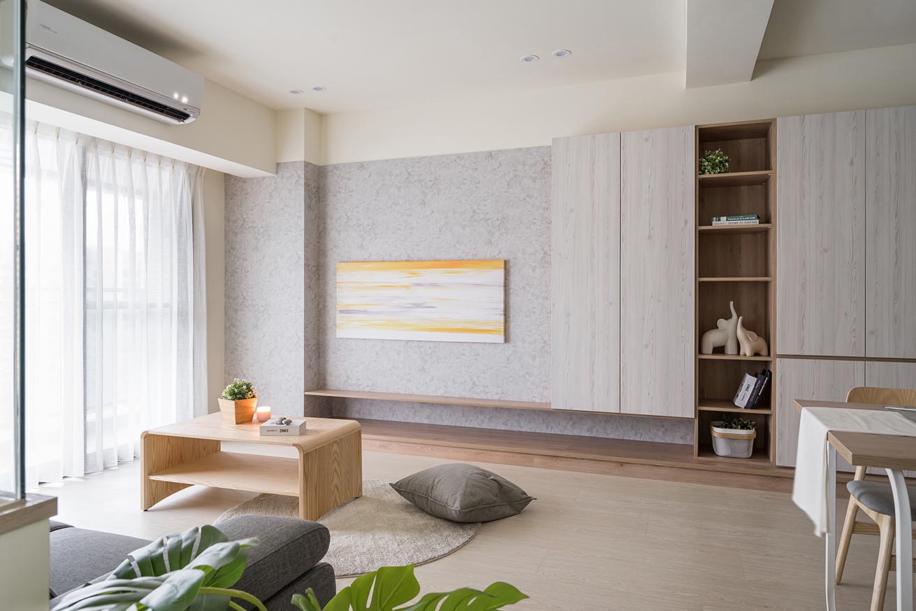 三房兩廳的基礎配置,將原始客廳背牆後的房間打通,作為休閒及閱讀的空間,並使用大片的玻璃嵌在中央,使空間更延伸,視覺空間更為寬廣。