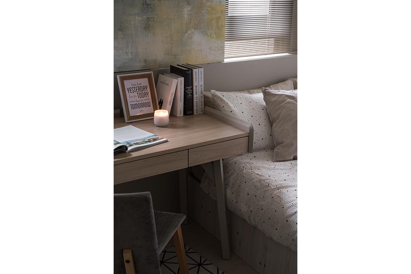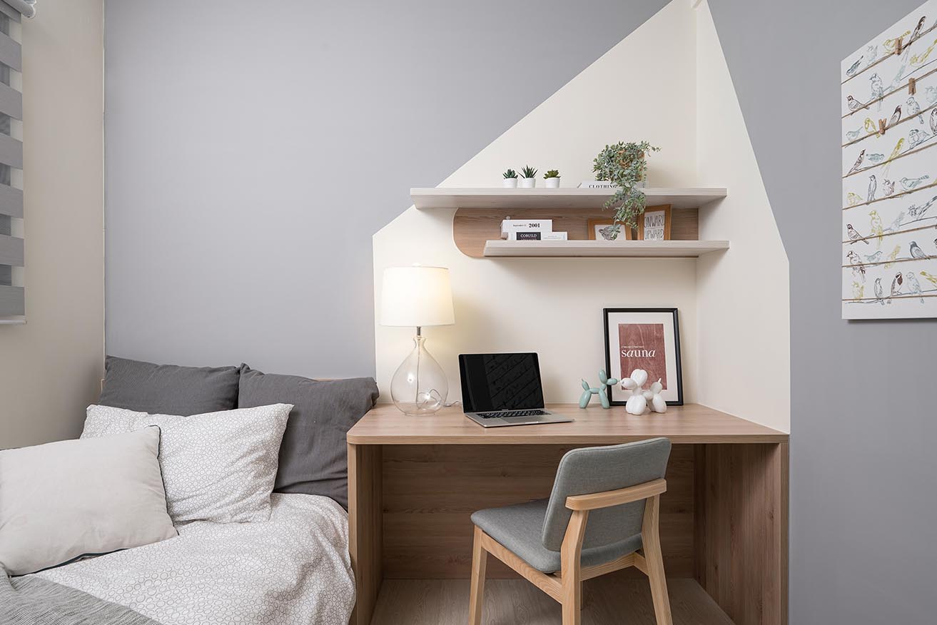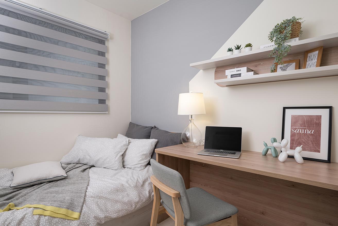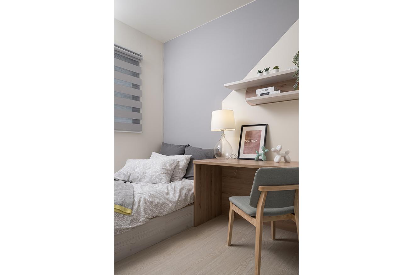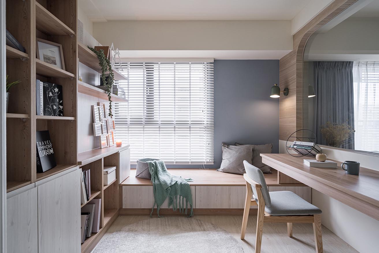 三房兩廳的基礎配置,將原始客廳背牆後的房間打通,作為休閒及閱讀的空間,並使用大片的玻璃嵌在中央,使空間更延伸,視覺空間更為寬廣。