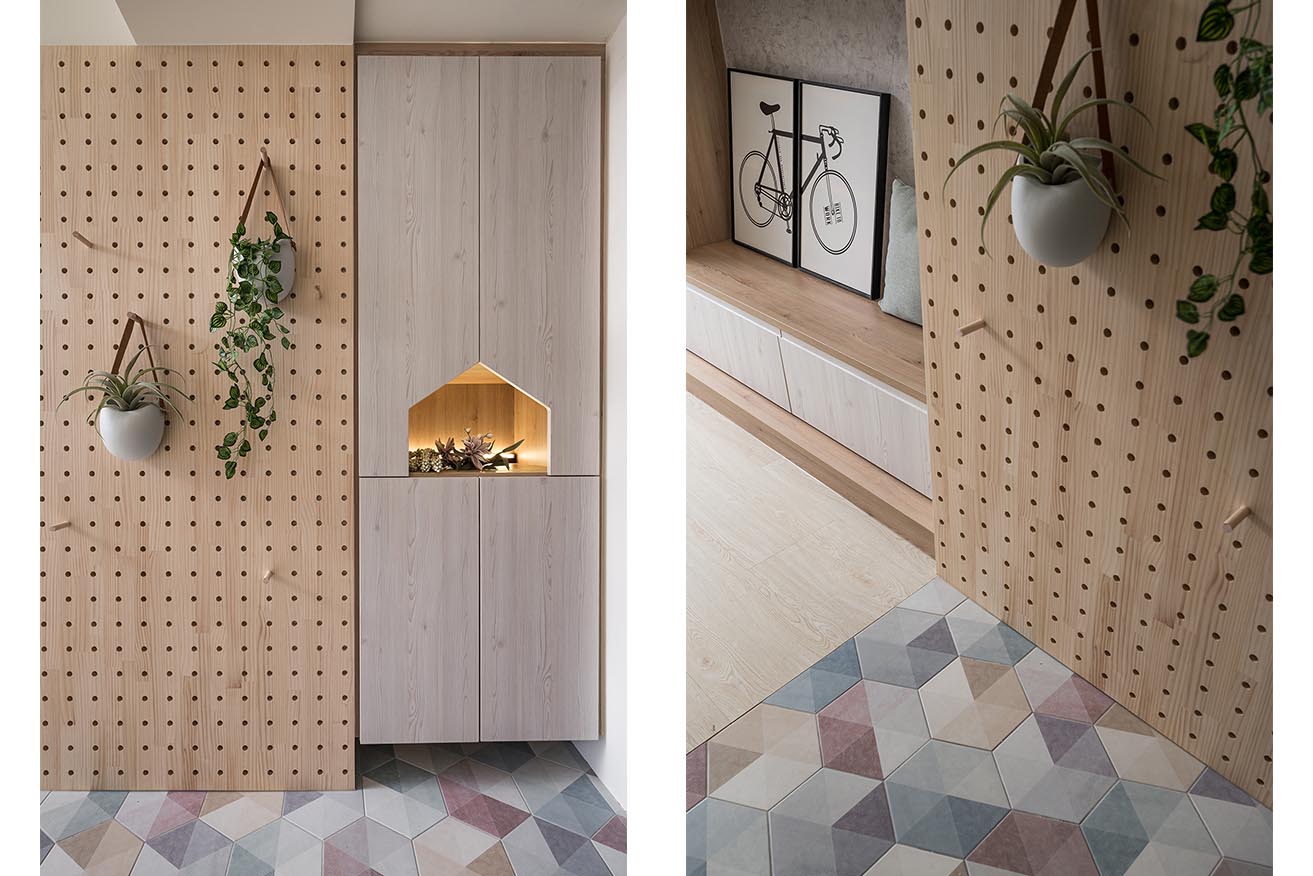 彩色進口六角磚、德國木地板、洞洞板、藝術家手繪推拉門、訂製鐵件、造型玻璃、實木木皮、鋁框拉門、木作天花板、崁燈、歐德系統家具、優渥實木家具