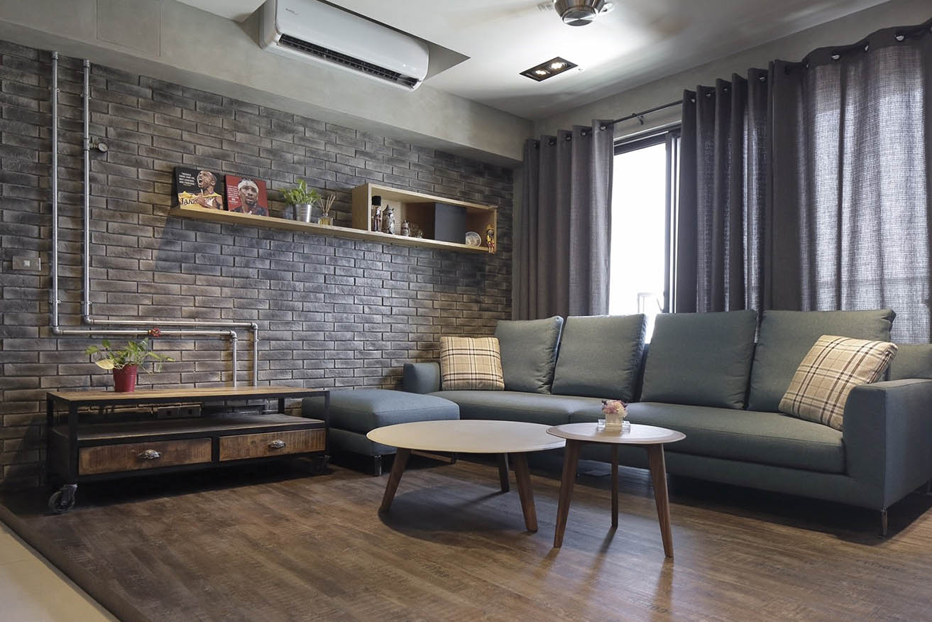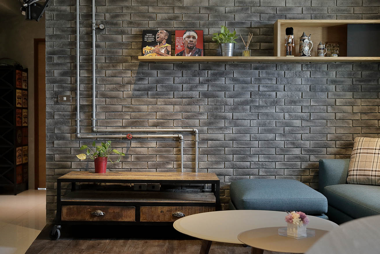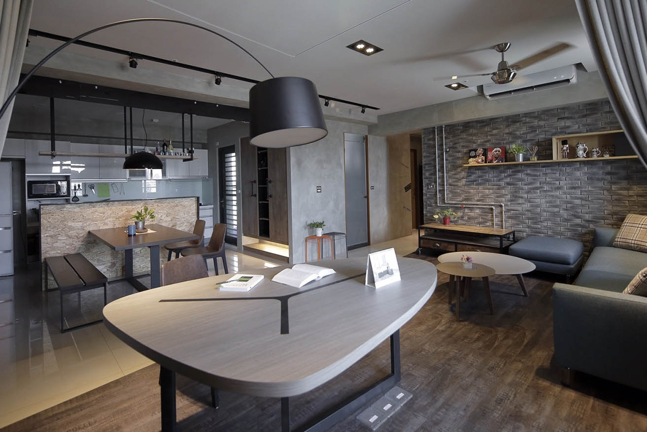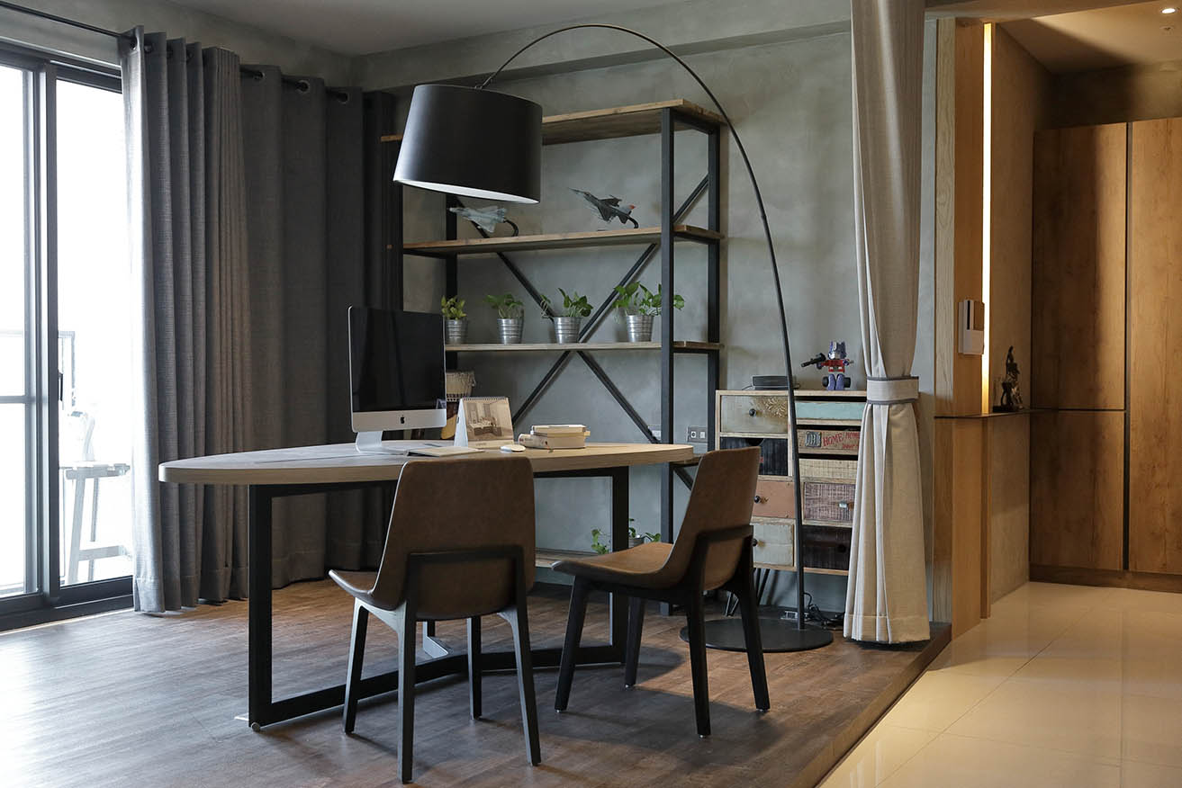 以手染灰色調文化石與仿古超耐磨木地板奠定客廳基調,風格強烈的 EMT 管和電器櫃的工業風水龍頭把手強化風格,其他傢俱以鐵木混合的收納櫃體低調平穩的詮釋客廳書房一體的空間,沈穩深木色系和帶點北歐風格的書桌和沙發,打造不失住宅溫度的工業風居家。