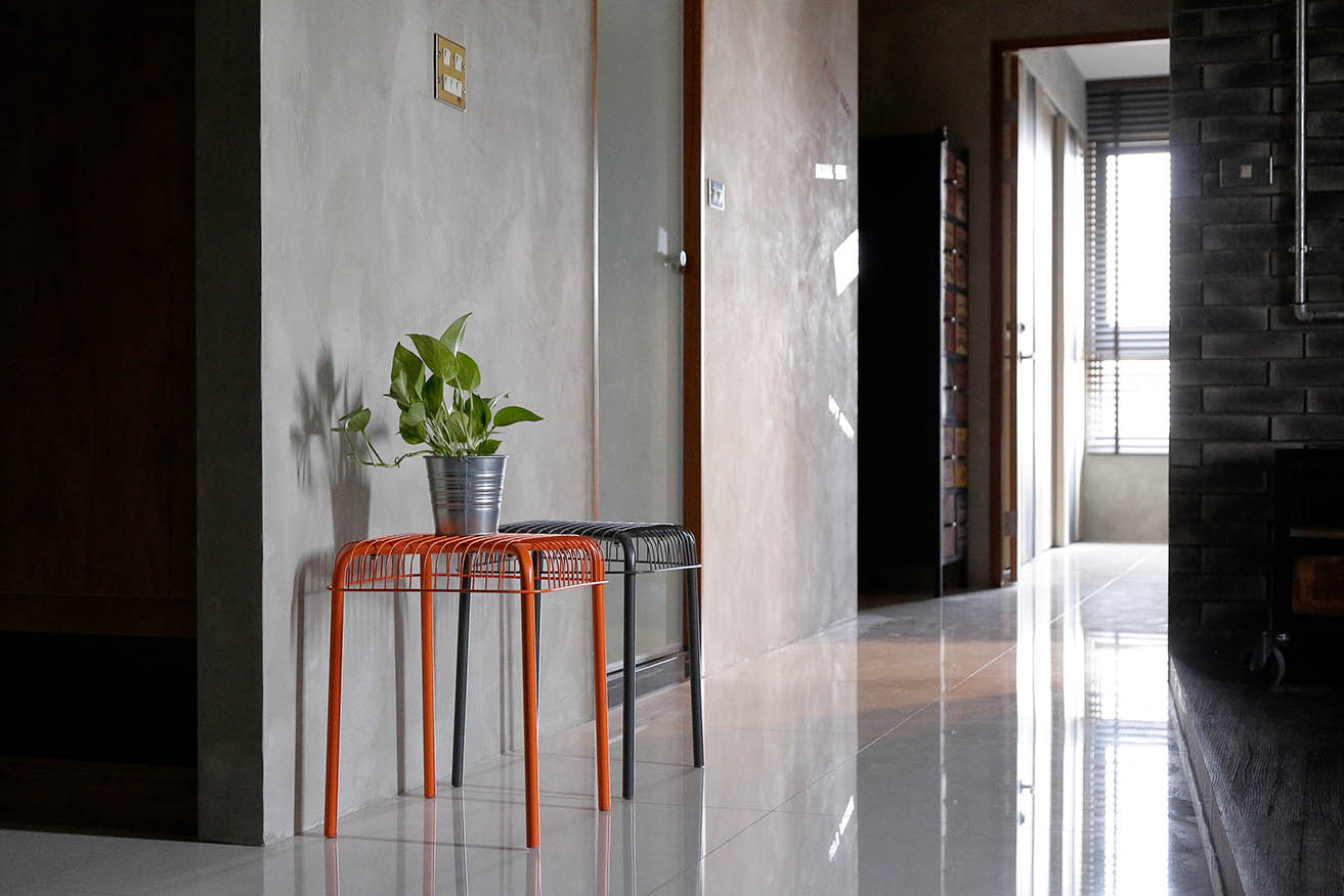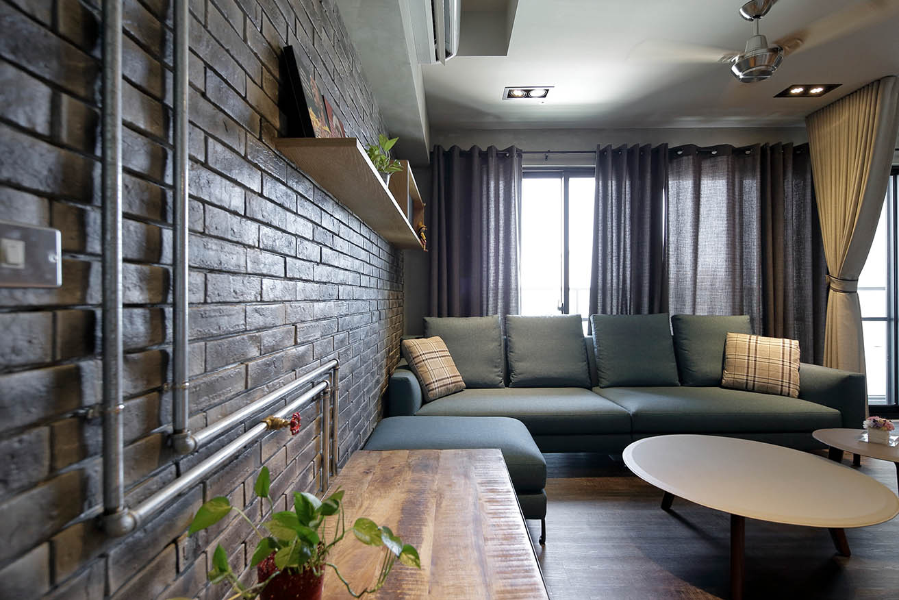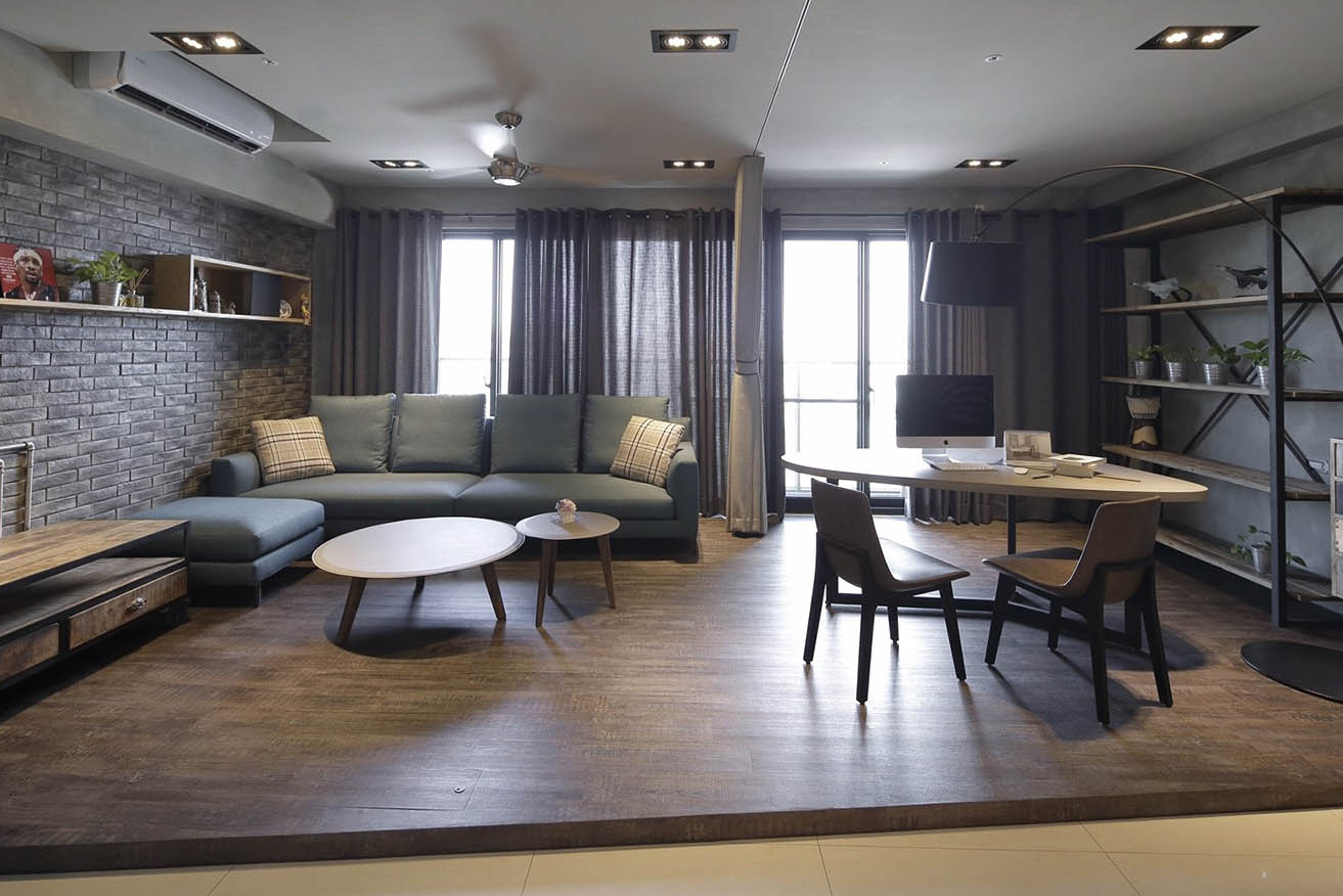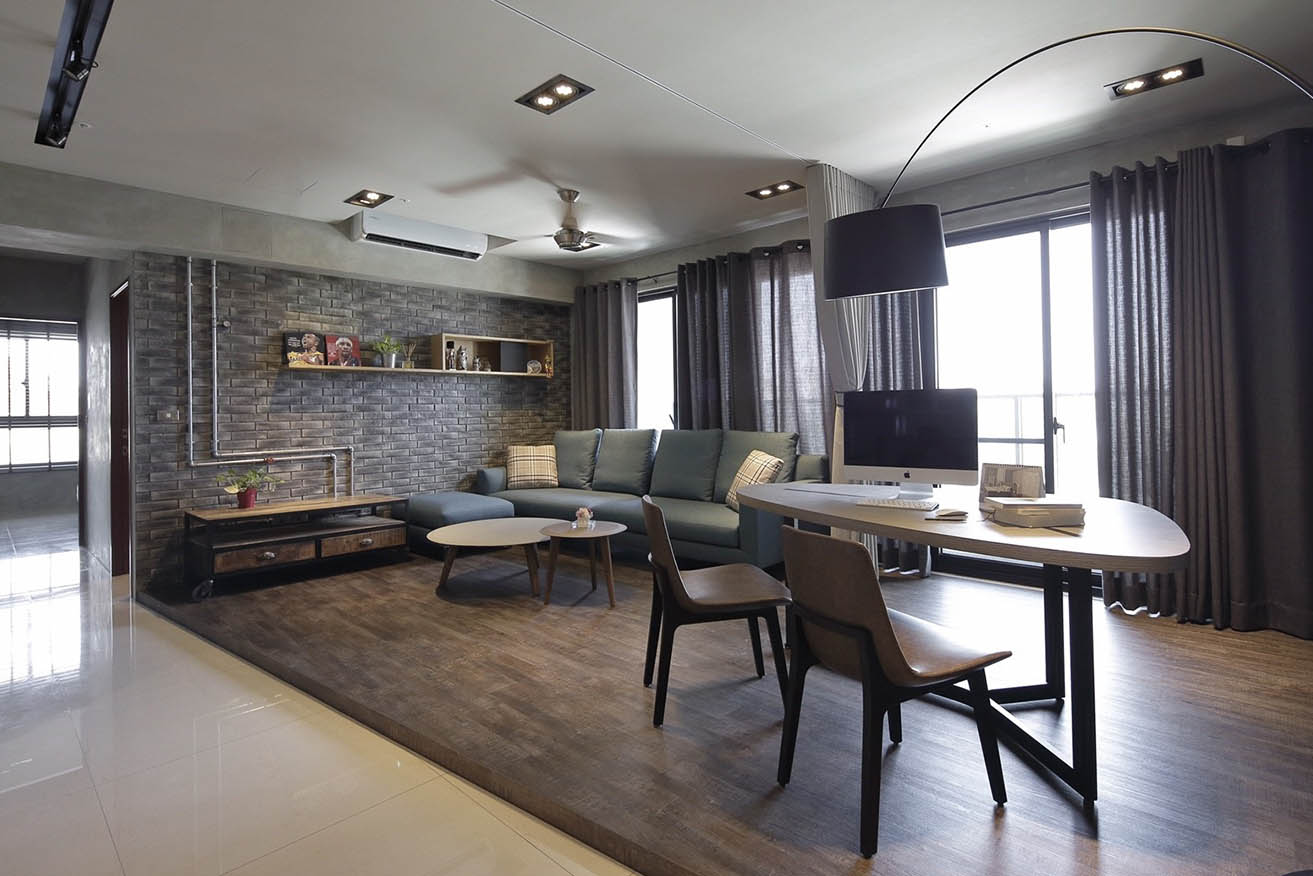 以手染灰色調文化石與仿古超耐磨木地板奠定客廳基調,風格強烈的 EMT 管和電器櫃的工業風水龍頭把手強化風格,其他傢俱以鐵木混合的收納櫃體低調平穩的詮釋客廳書房一體的空間,沈穩深木色系和帶點北歐風格的書桌和沙發,打造不失住宅溫度的工業風居家。