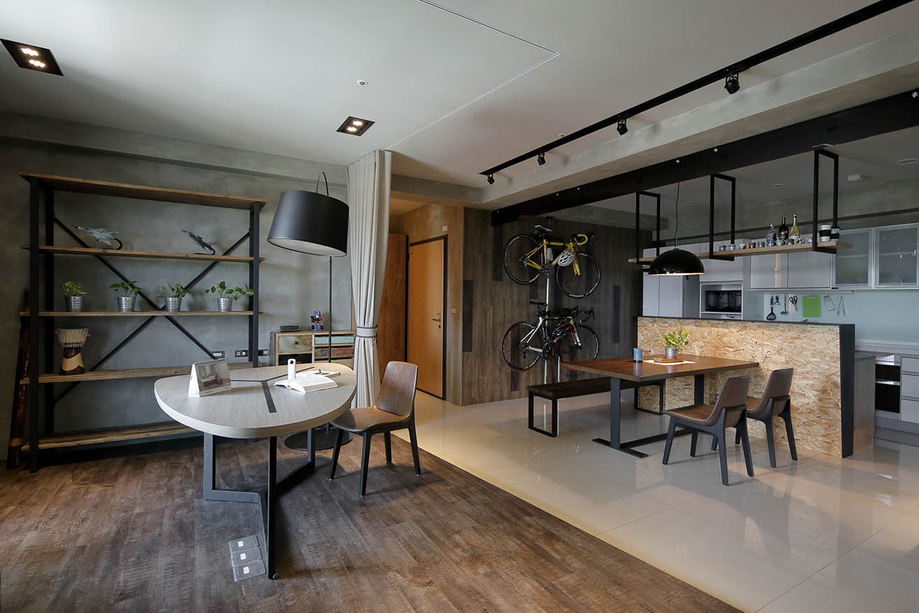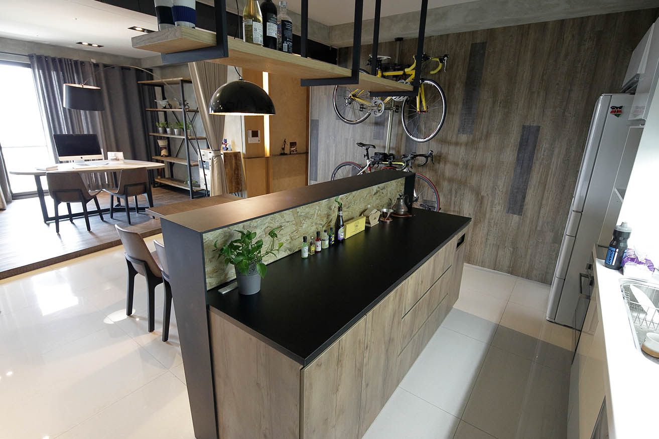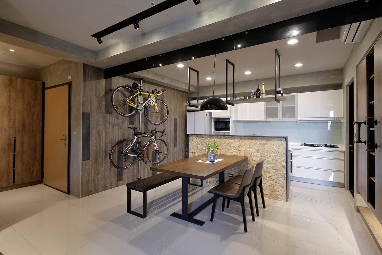 結合屋主騎單車的興趣,設計師運用餐廚區的單面牆裝置腳踏車懸掛架,考量到風格與維護面,不用白牆或樂土礦物塗料,藉由系統板材作為支架背景,成功塑造出機能與風格兼具的單車展示牆,空出地坪空間讓動線更通暢。