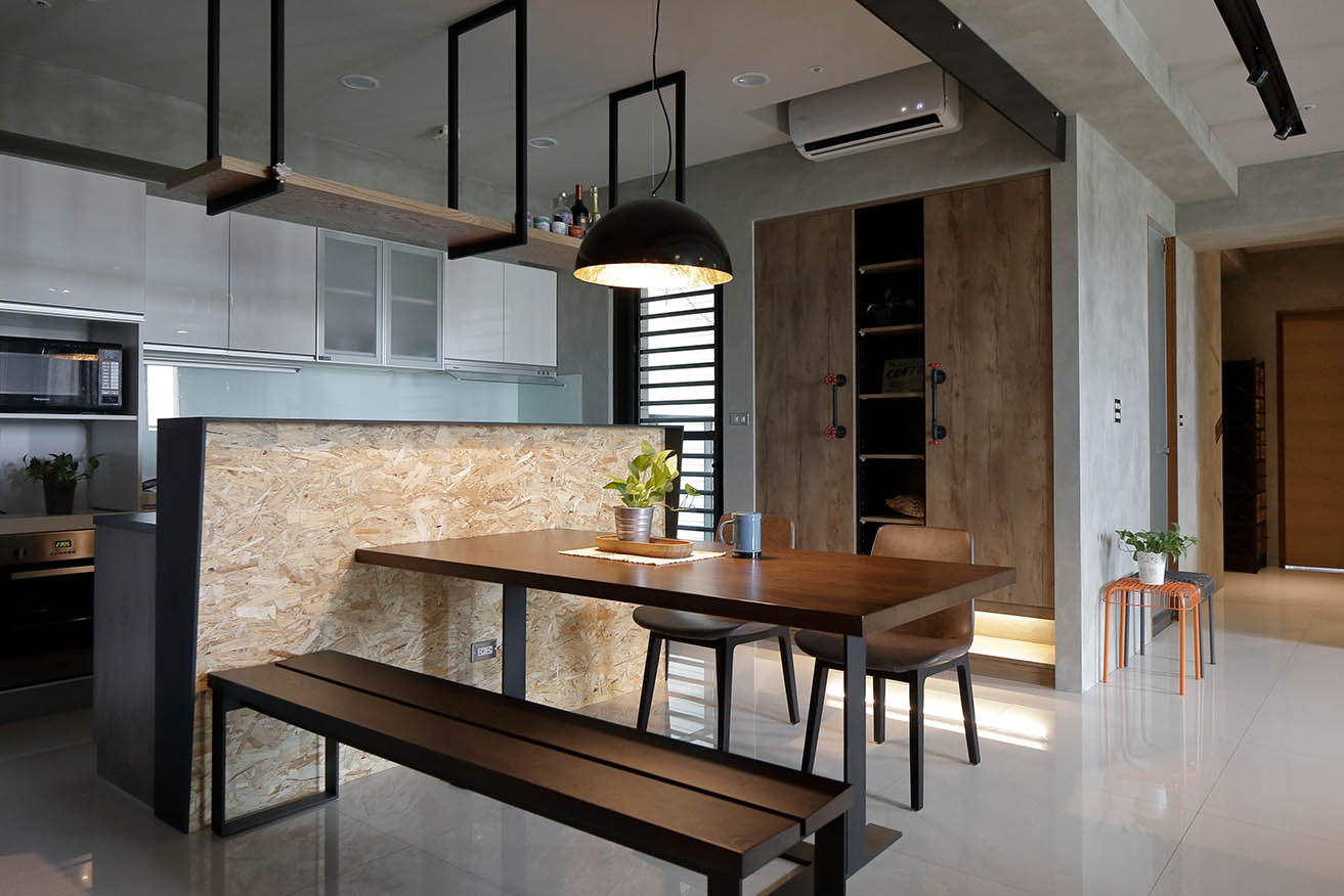 餐廚空間除了沿用咖啡紅豆杉板材製作電器櫃,訂製鐵件與 OBS 板結合的中島吧台提供喜愛手沖咖啡的屋主一個舒適又有風格的料理空間,創造開放式廚房中帶點獨立特質的餐廚區域。