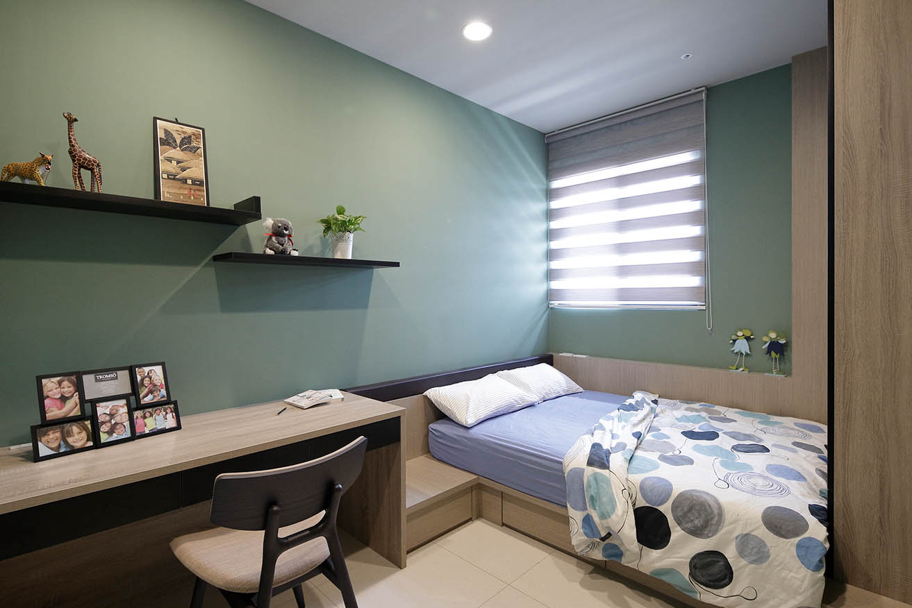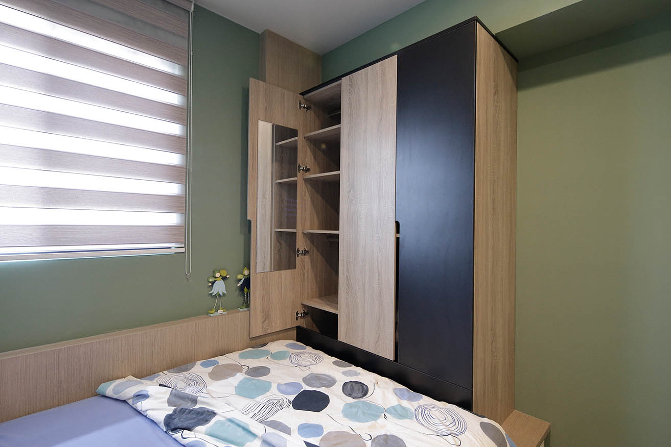 孝親房在有限的空間下,輔以擁有木質肌理的系統門片、牆面漆上北歐風草綠色帶出設計感,不僅輕鬆解決小空間的收納問題,更完美串連清爽的北歐工業風格。