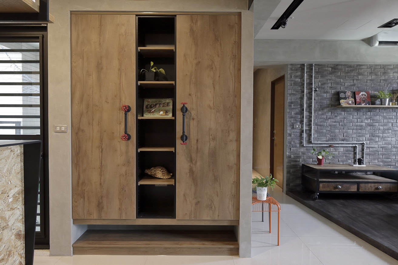室內設計師選擇有著烘培過後紋理明顯、色澤溫潤的咖啡紅豆杉系統板材,用來製作玄關收納櫃,以暖調色系銜接玄關到室內空間,高身櫃體設計具備全面的收納機能,透過靈活運用系統傢俱,風格與機能都能全盤兼顧!