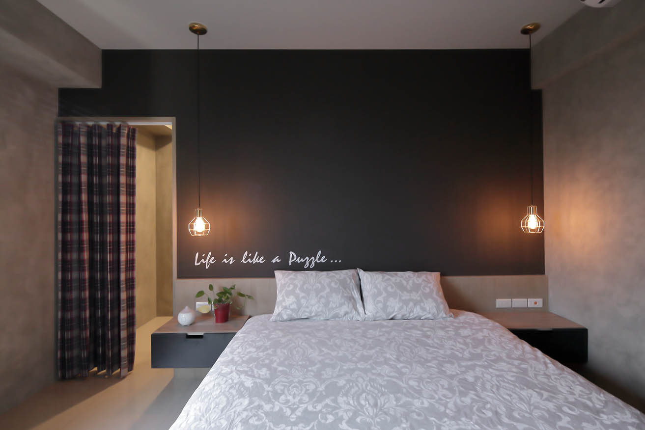 主臥房延續廊道的設計,利用樂土礦物塗料取代水泥,不但擁有同樣的視覺感受,樂土細緻的質地和無沙塵特性讓居家維護更便利。