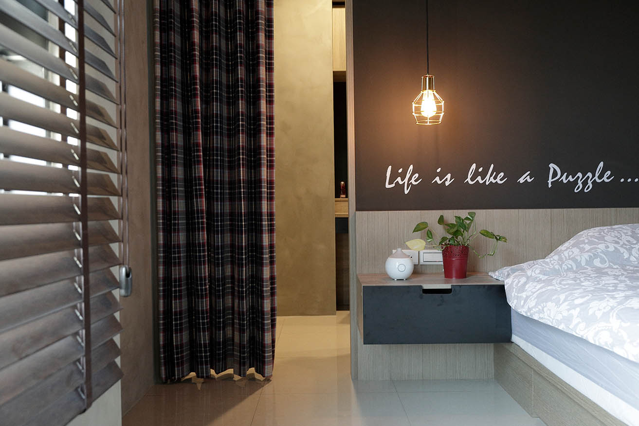 樂土礦物塗料一路從主臥牆面延伸到後方的長型更衣室,塑造整體工業風格,不落地的床頭櫃設計讓主臥看起來更寬敞俐落;配置於床尾的整面式衣櫥,系統櫃結合木作,內部有層板與伸縮吊衣架設計提供屋主方便實用的收納空間。
