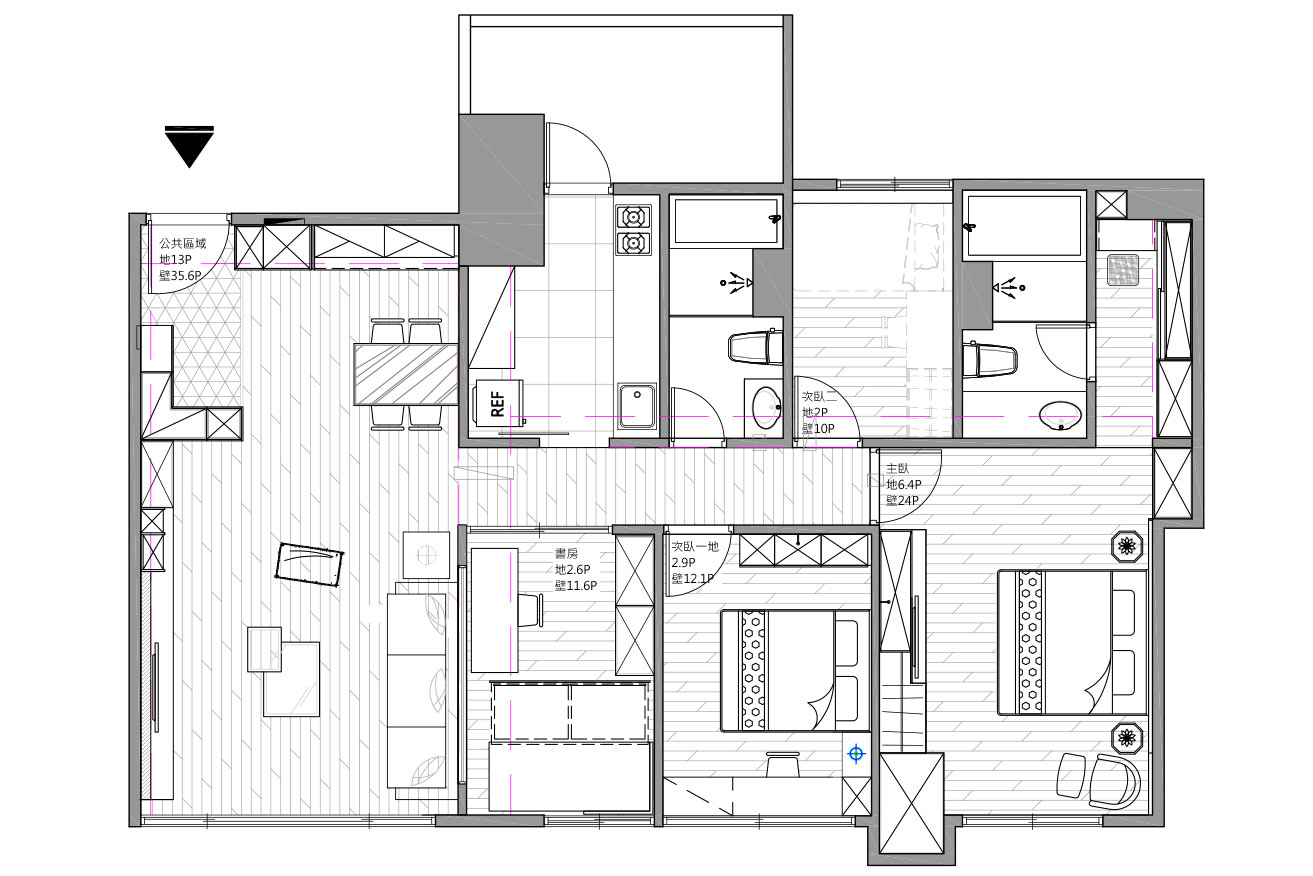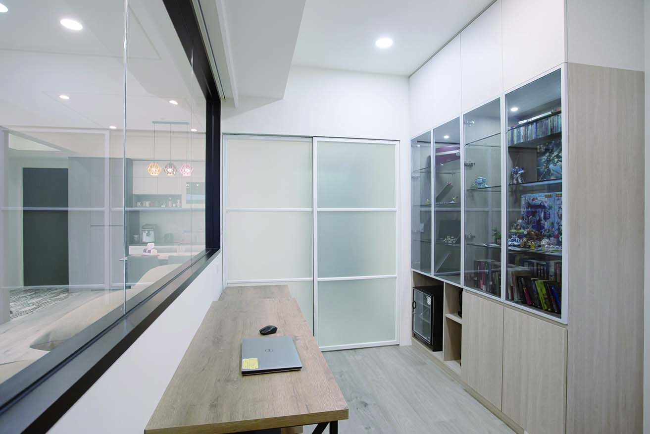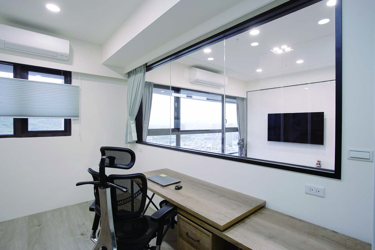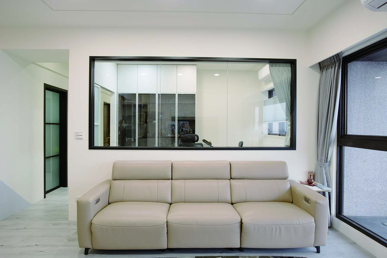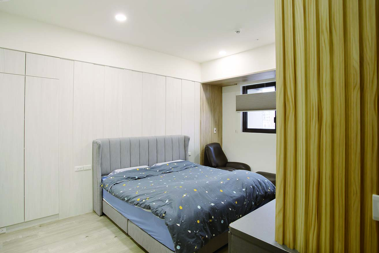 房大面積開窗增加空間穿透感,並配上霧面玻璃拉門與外掛窗簾,增添空間變化性。
