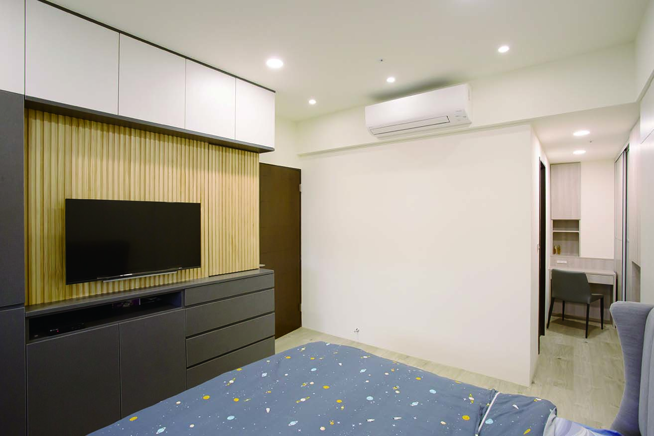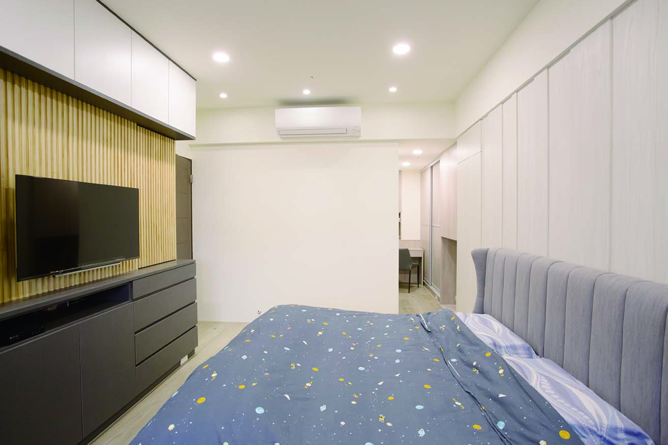 主臥有許多畸零空間,設計師兼具美觀與收納功能,打造了許多隱形收納空間,除了規劃出步入式的更衣走道外,在主臥格柵電視牆的背後,設計了隱藏式衣櫃。