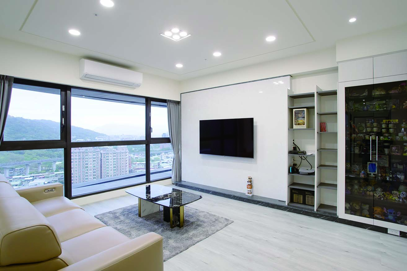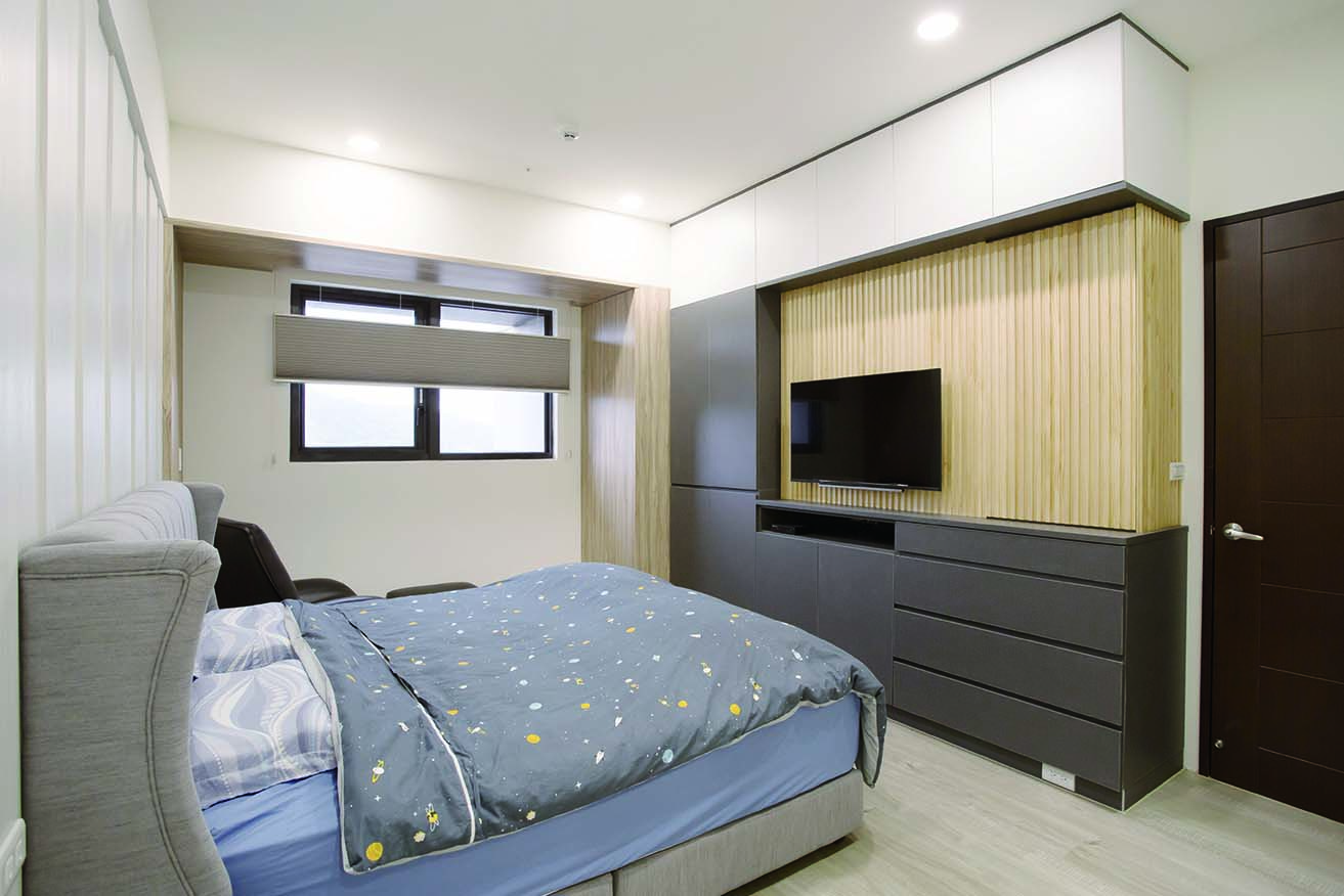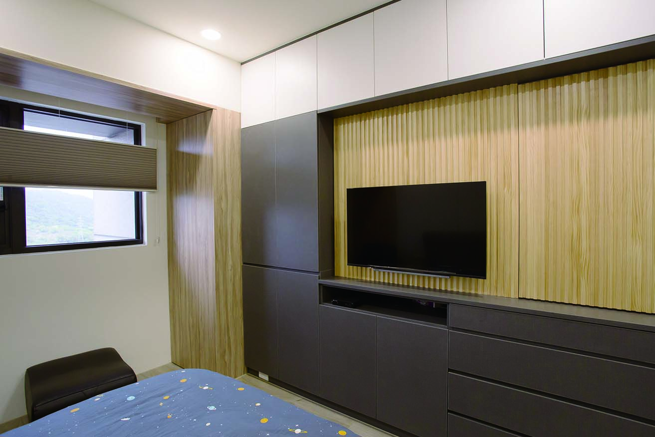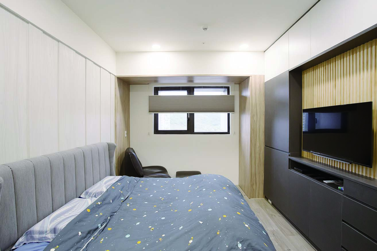 而儲藏室設計在窗邊的假住,結合了電視牆面,美觀更增加了收納功能,將收納隱藏於無形。