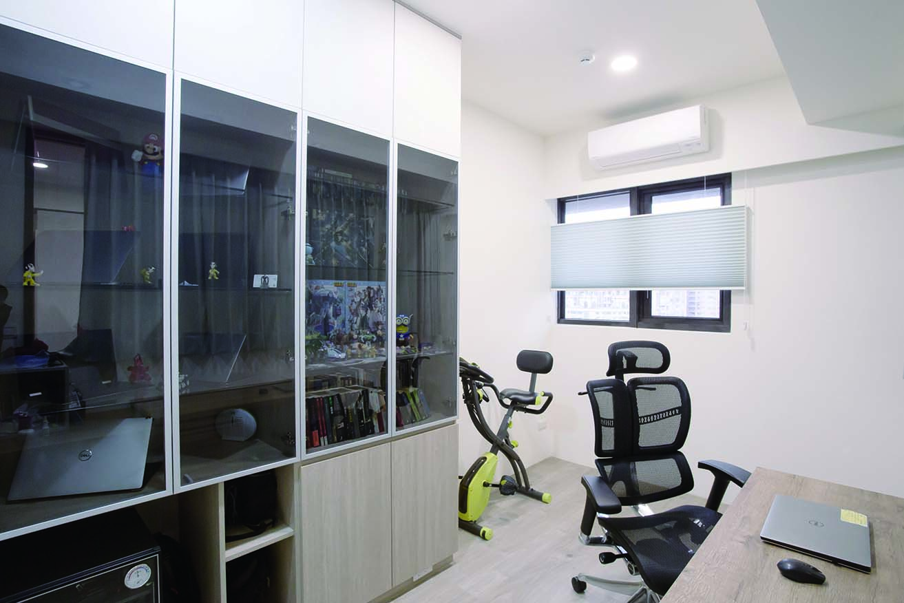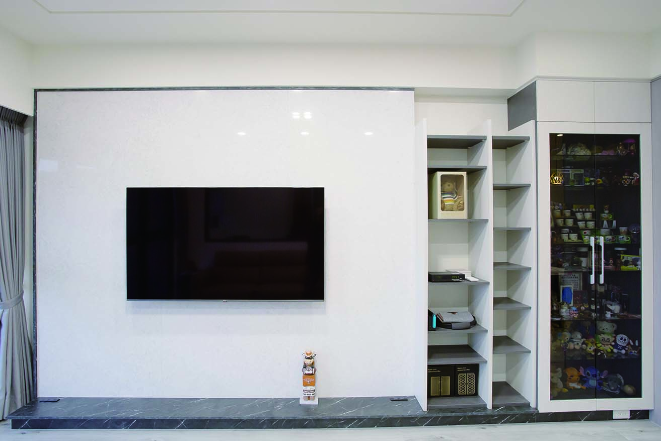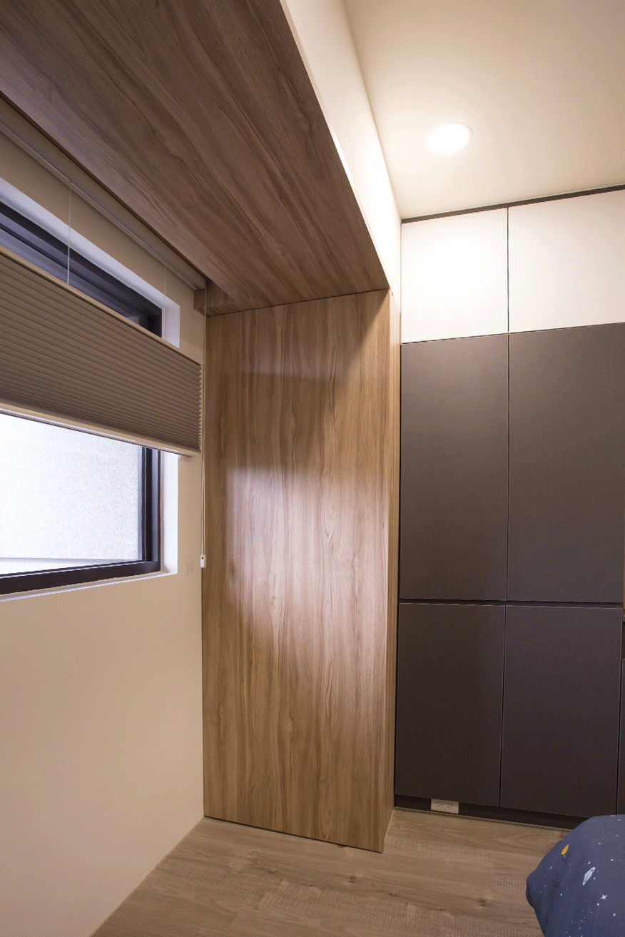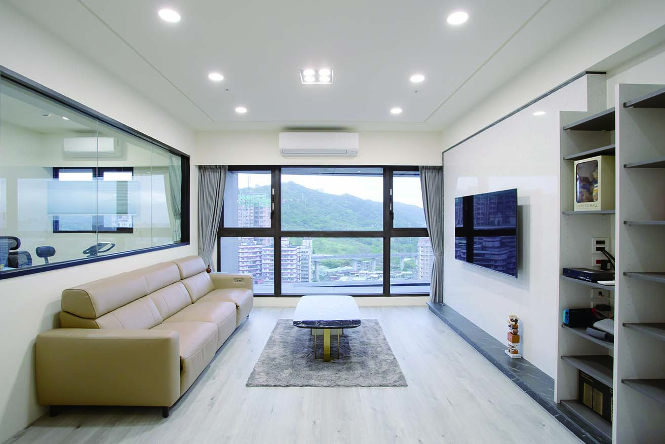 而儲藏室設計在窗邊的假住,結合了電視牆面,美觀更增加了收納功能,將收納隱藏於無形。