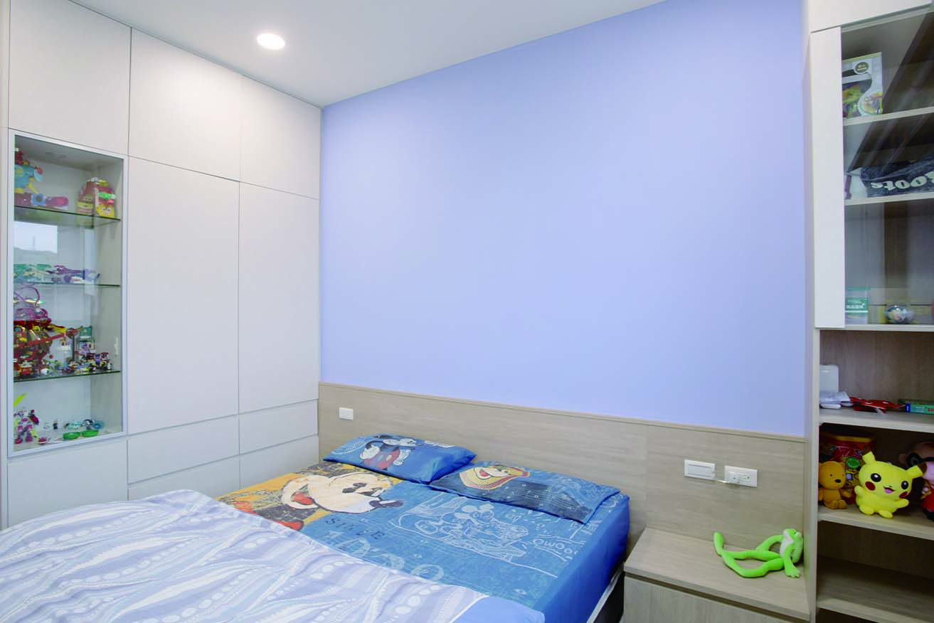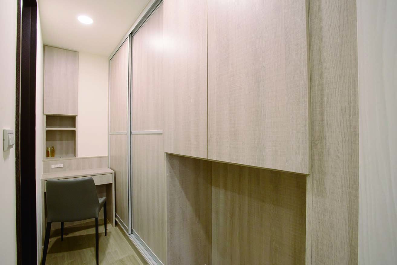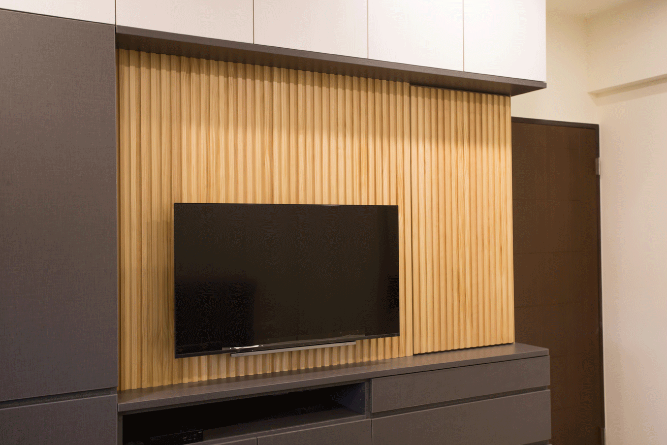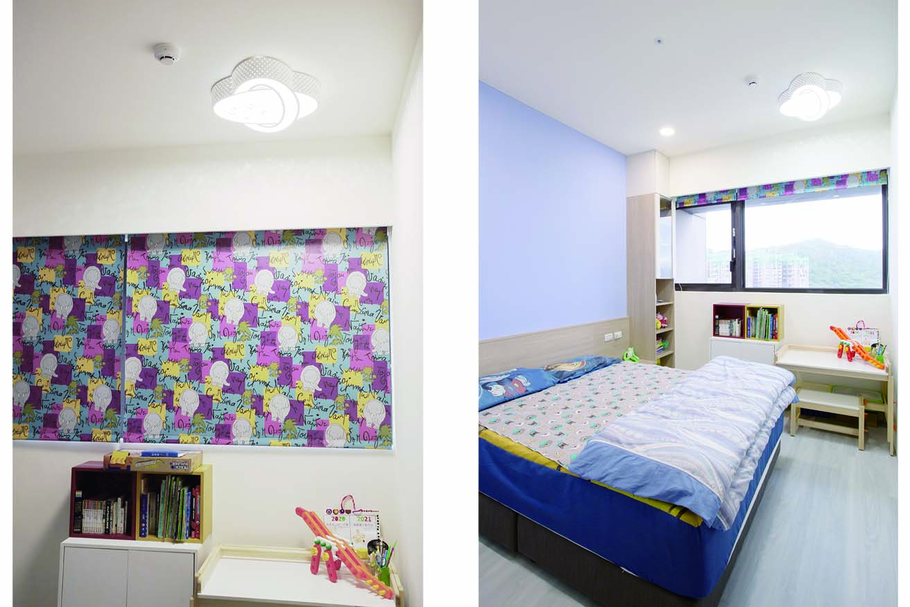 而儲藏室設計在窗邊的假住,結合了電視牆面,美觀更增加了收納功能,將收納隱藏於無形。
