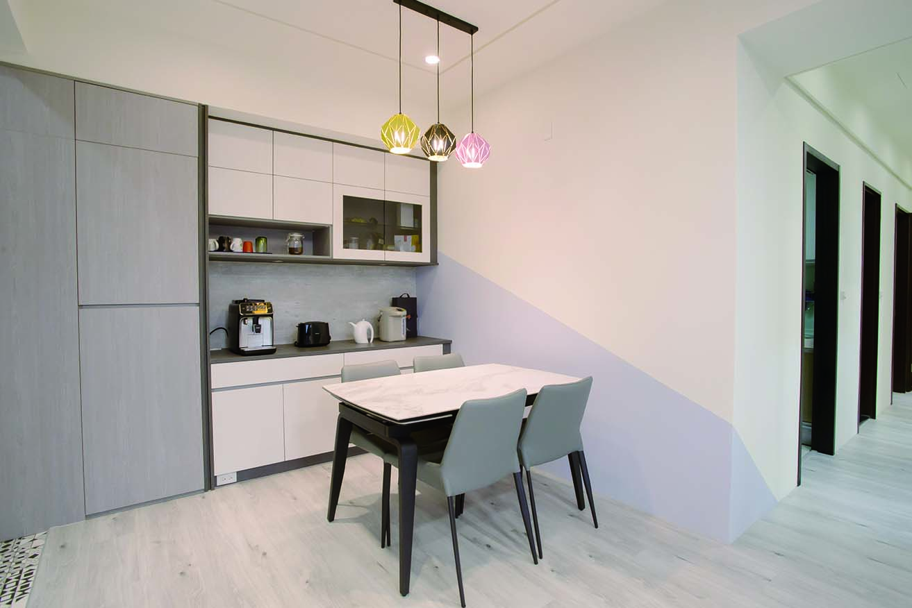 餐廳區域以牆面油漆跳色,營造出空間區隔,並轉角延伸至走道內,賦予牆面放大延展效果。更規劃了餐邊櫃,新增插座讓咖啡機、熱水壺、土司機等小家電能方便操作。