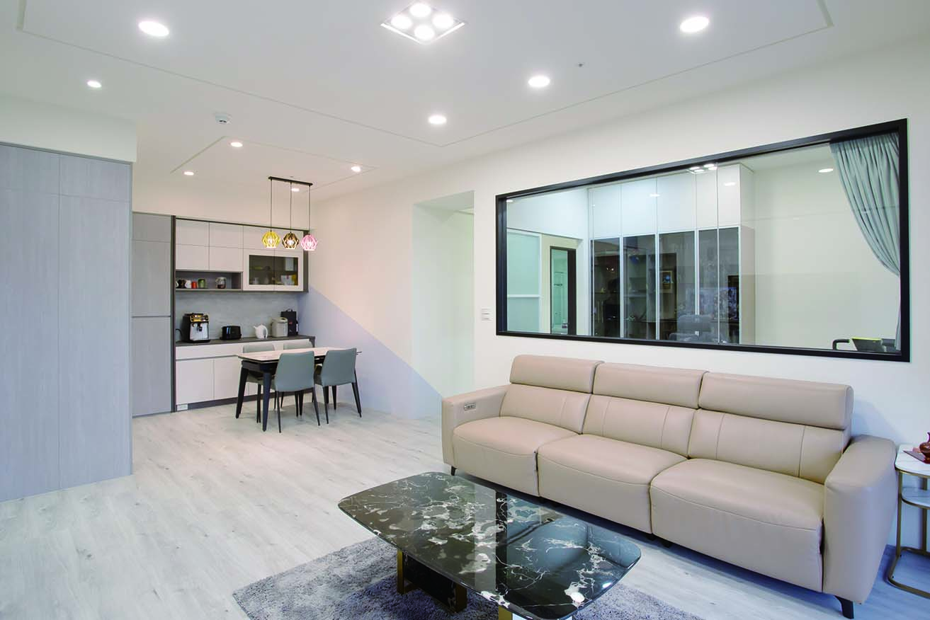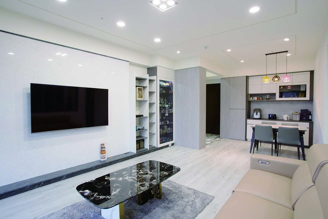 將客廳與餐廳規劃在同一平面上,串聯生活動線,客廳電視牆面以整面仿大理石牆面,避免過多的櫃體干擾視覺,而電視牆面建材經過特殊加工,具有高度耐磨、耐髒汙、耐高溫的特性,清潔不費力。