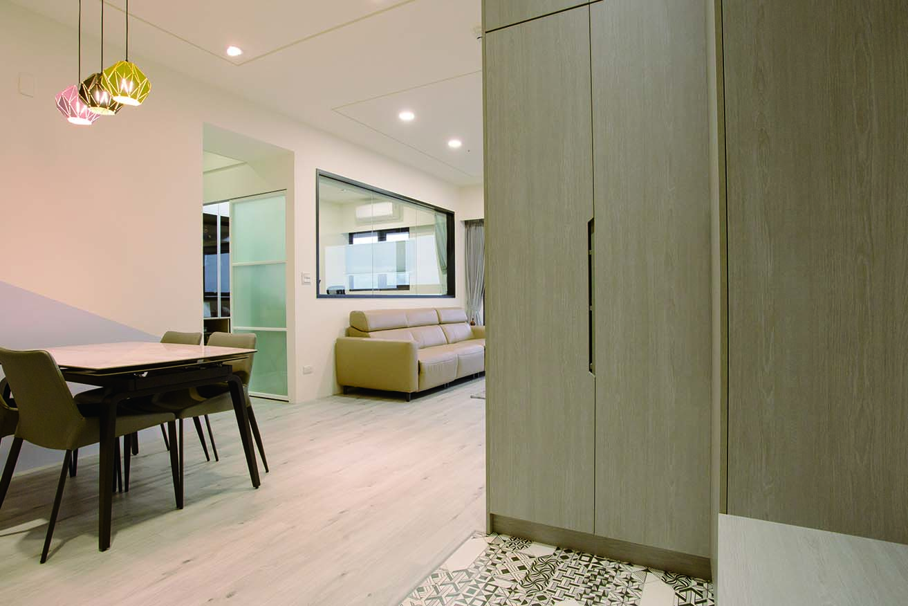玄關入口處設計花磚落塵區,設計鞋櫃收納與矮櫃,方便穿、脫鞋,更化解穿堂煞風水,利用櫃體與天花板降板設計,區劃出玄關區。