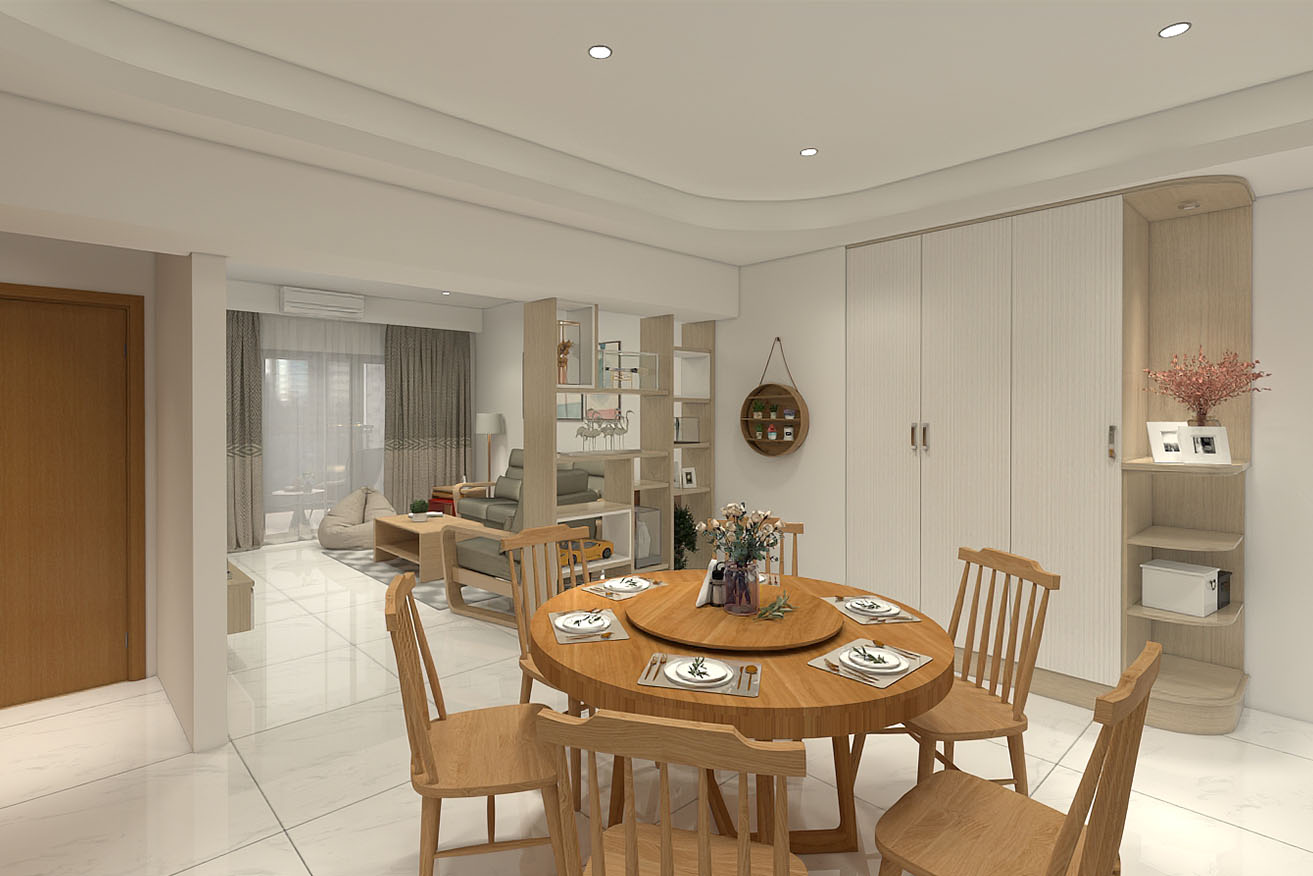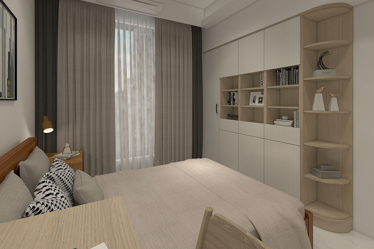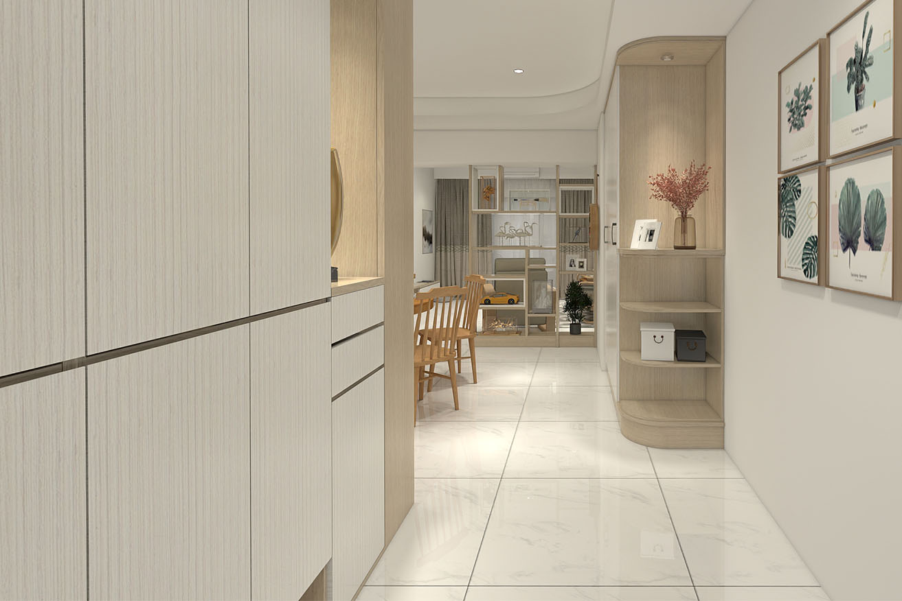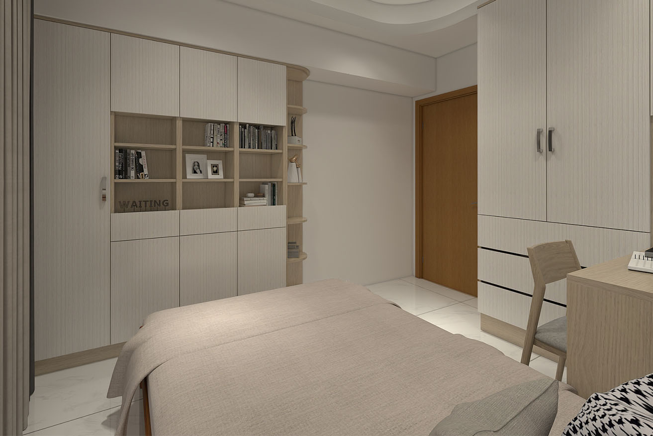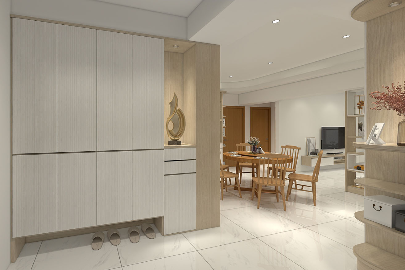 楊育樺設計師與屋主洽談的過程中,了解到屋主有著許多的收藏,喜歡實木家具帶來的溫馨感,設計師以簡約風出發,在玄關進門處,設計了開放式展示收納櫃,化解風水的同時也滿足展示品收納的需求。而主臥室方面,在梁下空間設計了系統收納衣櫃,並將整合梳妝台整合在同一面上,動線順暢妥善分配空間。