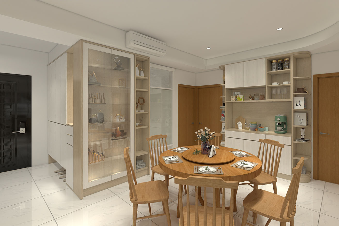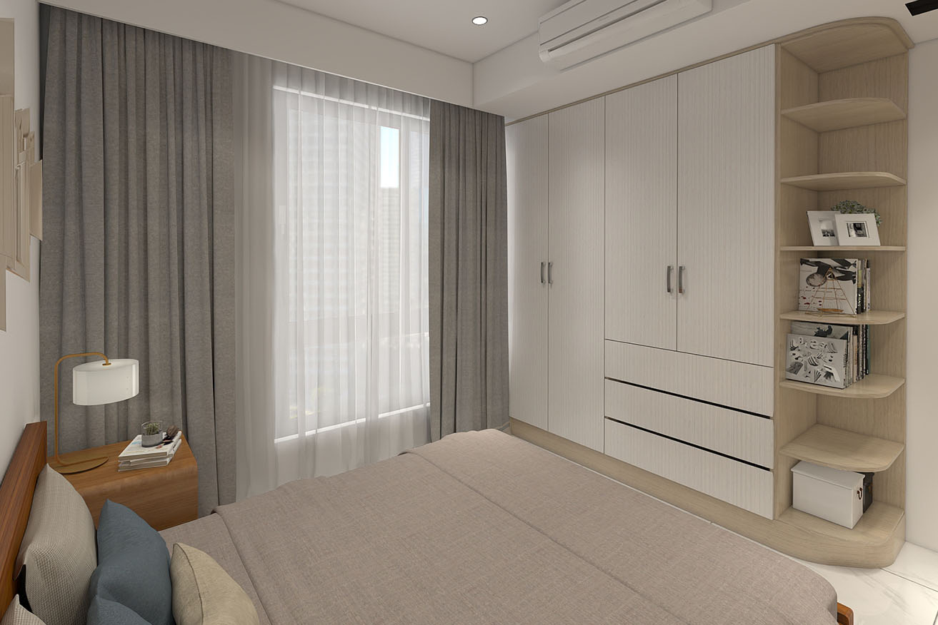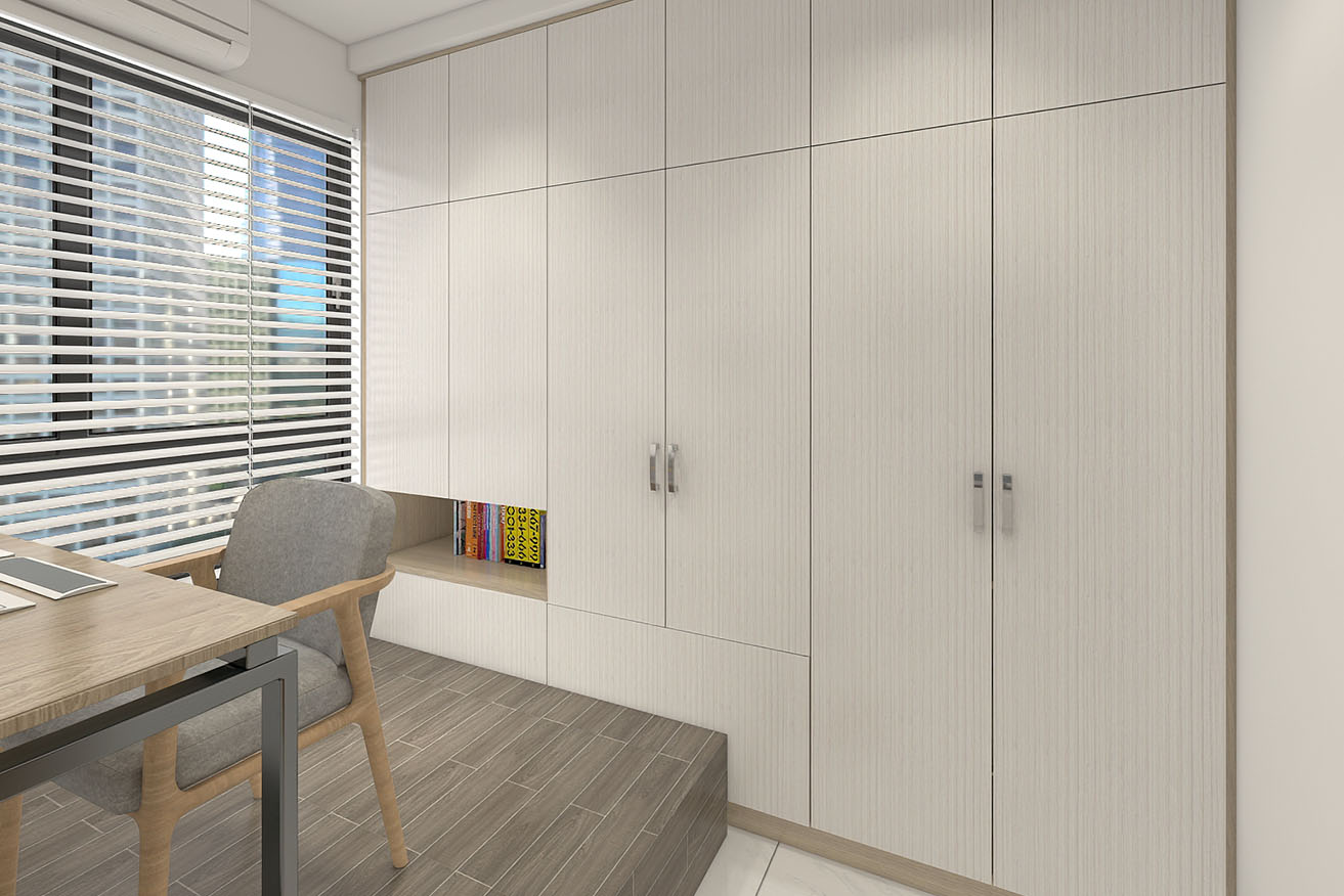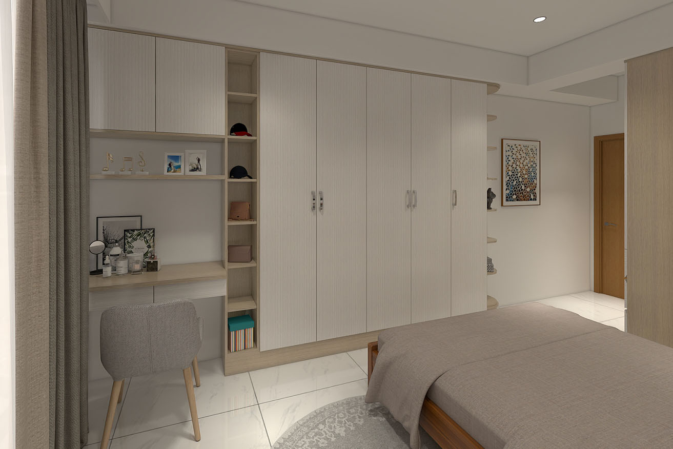 楊育樺設計師與屋主洽談的過程中,了解到屋主有著許多的收藏,喜歡實木家具帶來的溫馨感,設計師以簡約風出發,在玄關進門處,設計了開放式展示收納櫃,化解風水的同時也滿足展示品收納的需求。而主臥室方面,在梁下空間設計了系統收納衣櫃,並將整合梳妝台整合在同一面上,動線順暢妥善分配空間。