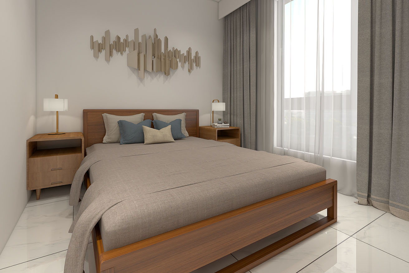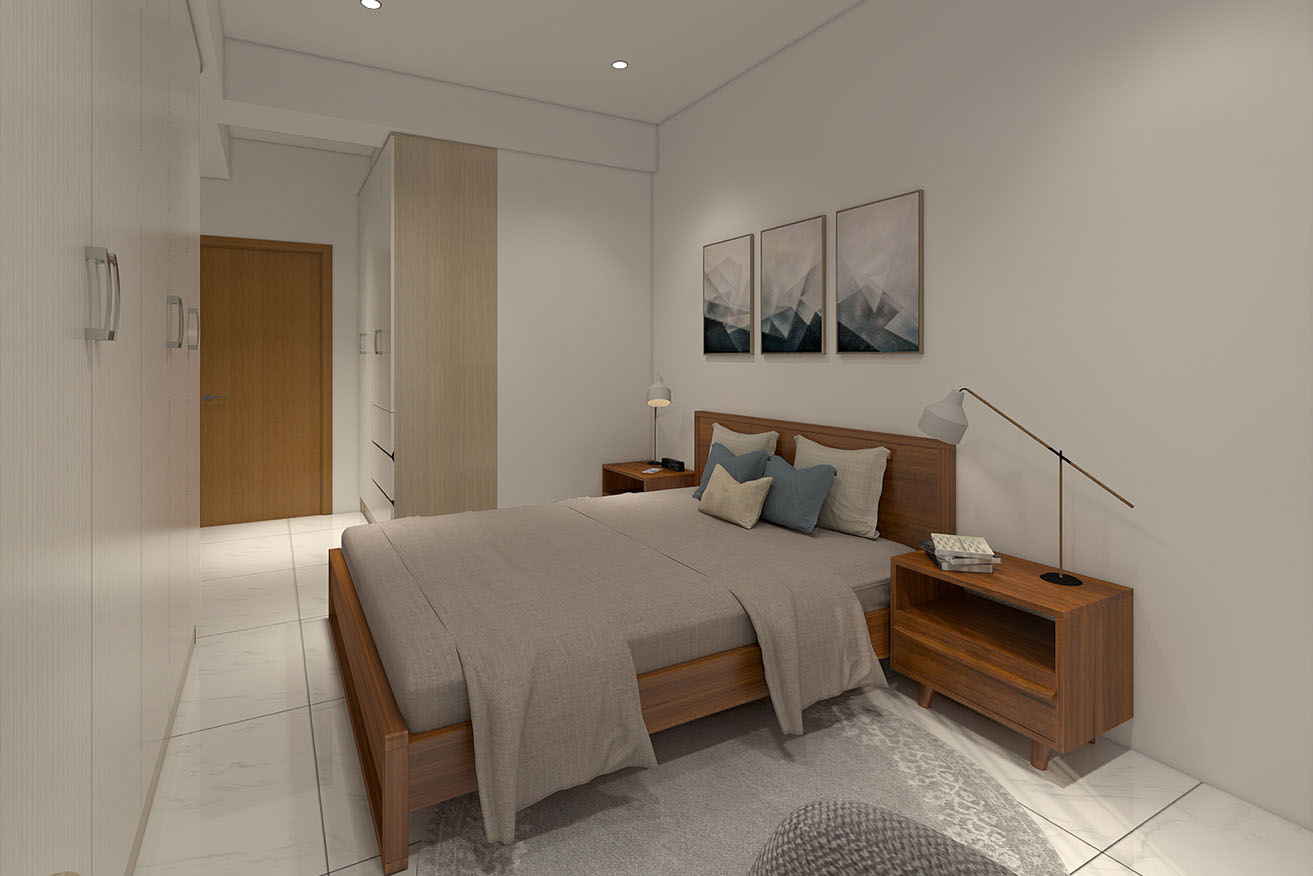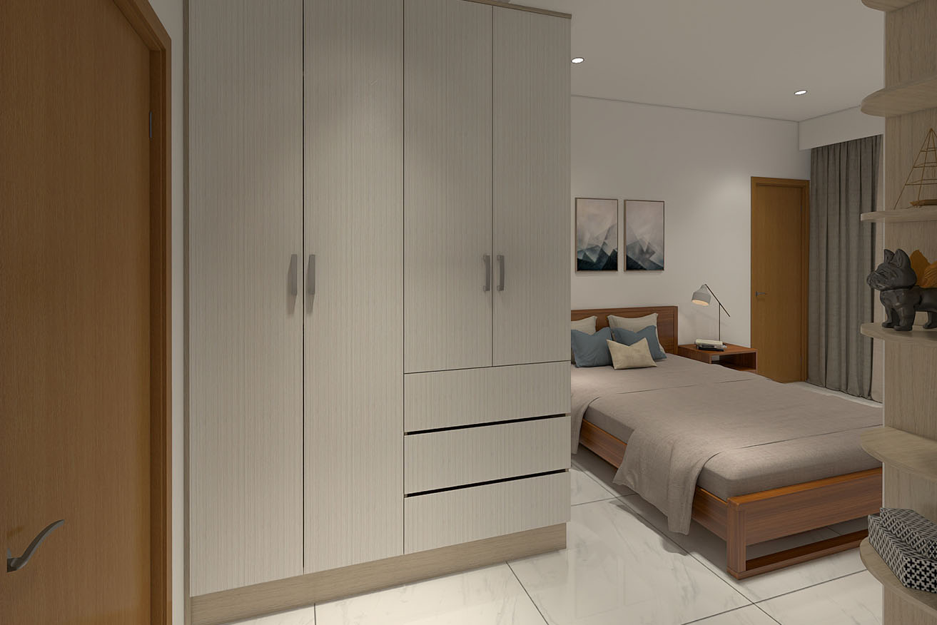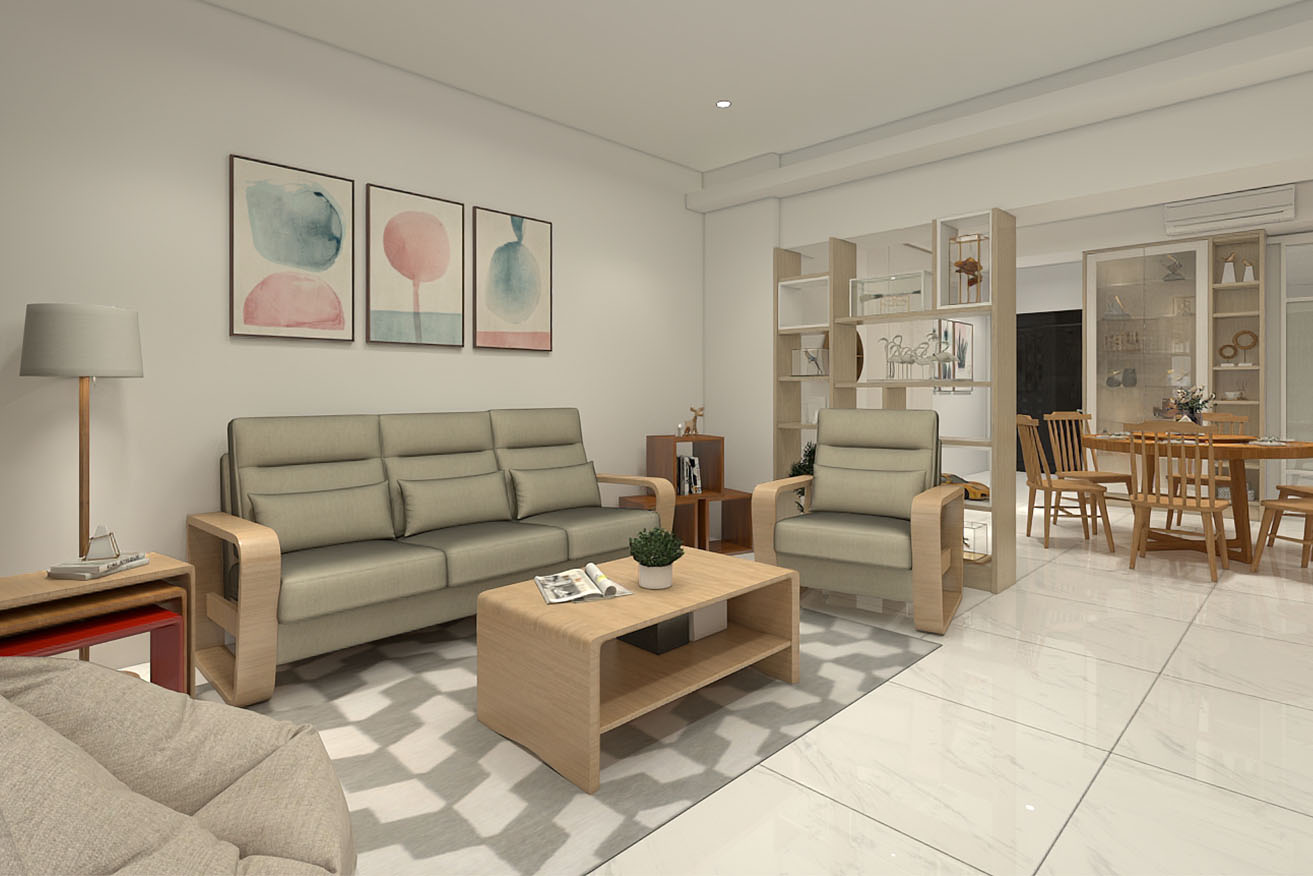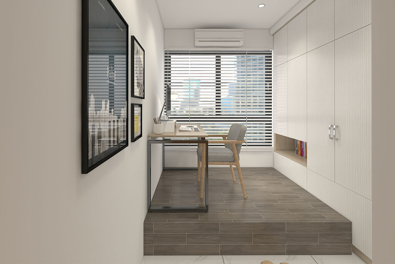 楊育樺設計師與屋主洽談的過程中,了解到屋主有著許多的收藏,喜歡實木家具帶來的溫馨感,設計師以簡約風出發,在玄關進門處,設計了開放式展示收納櫃,化解風水的同時也滿足展示品收納的需求。而主臥室方面,在梁下空間設計了系統收納衣櫃,並將整合梳妝台整合在同一面上,動線順暢妥善分配空間。