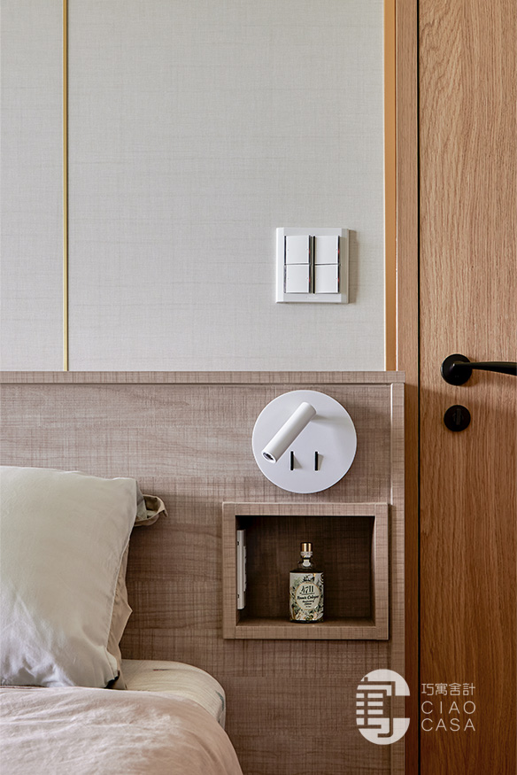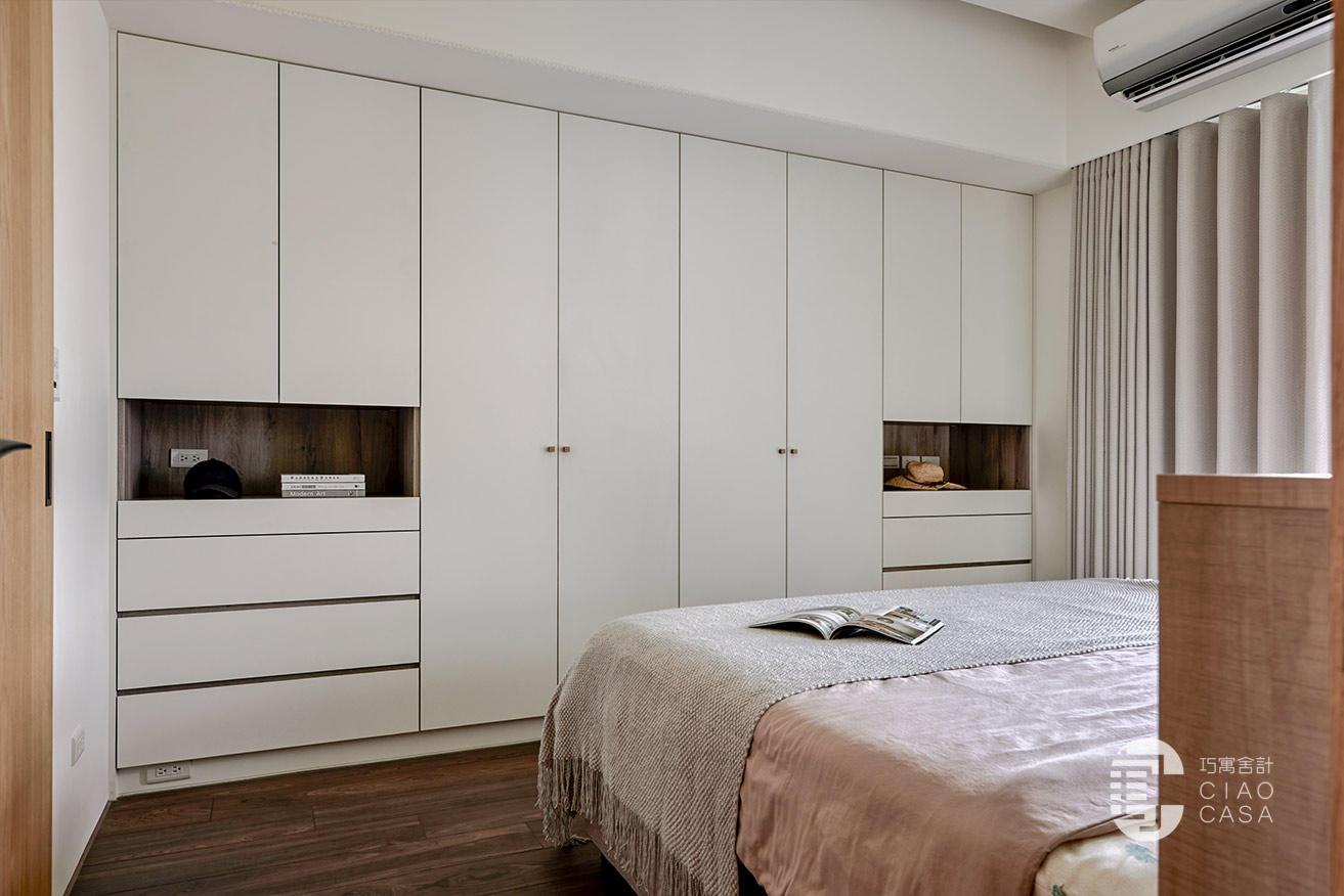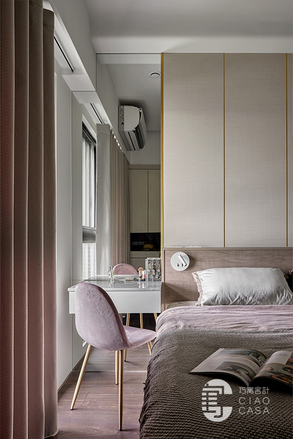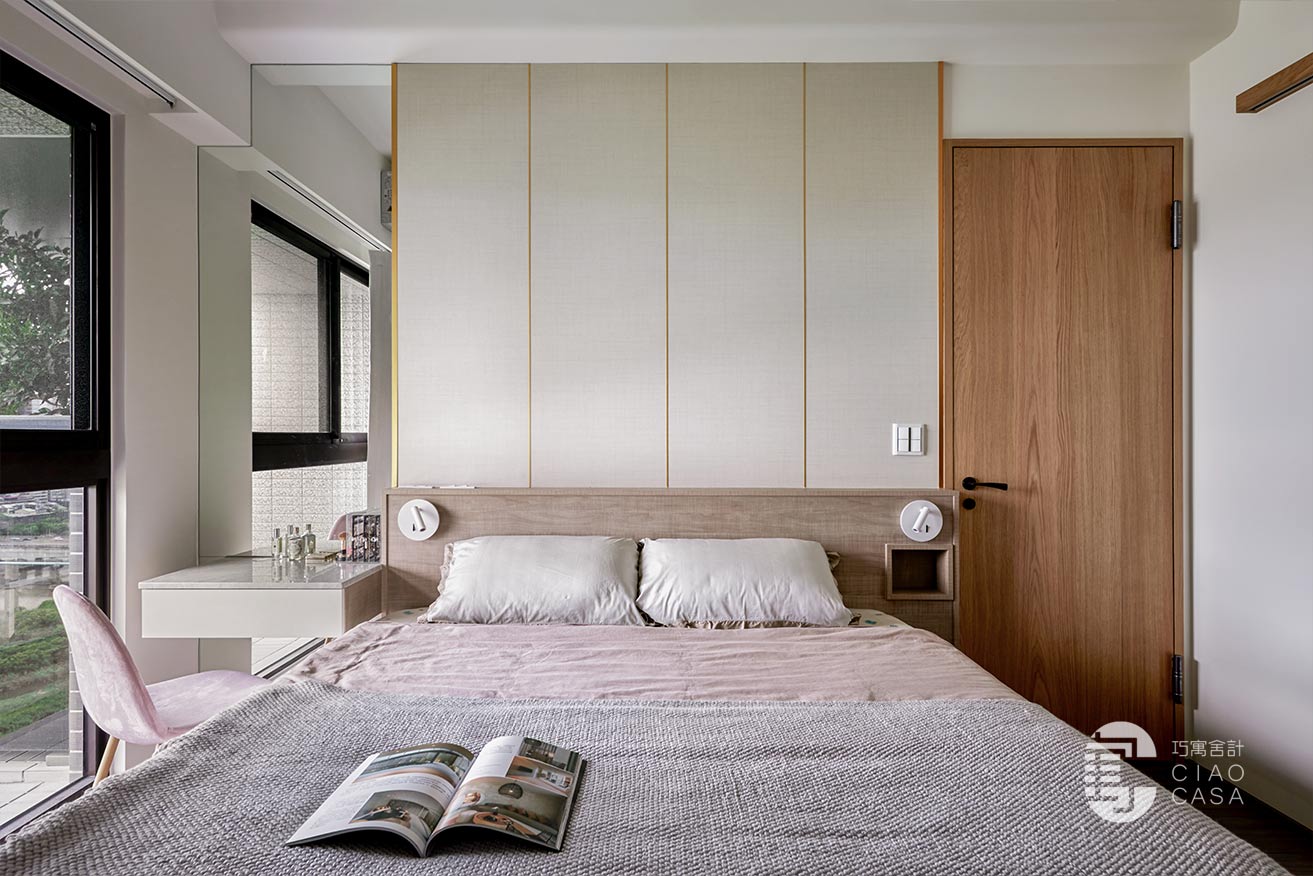 跳脫樸實自然的原木風格,主臥房床頭利用鏡面、金屬飾條,引入女主人嚮往的輕奢質感,並將梳妝機能安於窗邊一隅,在提升生活機能的同時,也豐富了空間格調。床尾的純白衣櫃,特別選用日本建築師藤田雄介設計的木質把手,從精巧的細節之處,將生活的溫度刻畫入微。