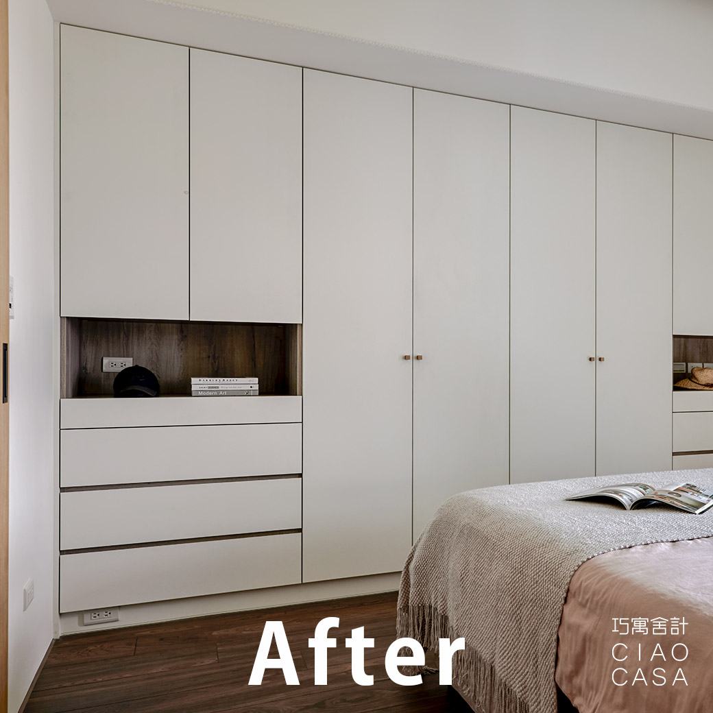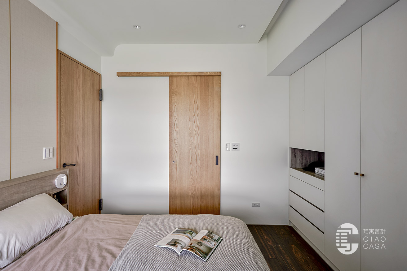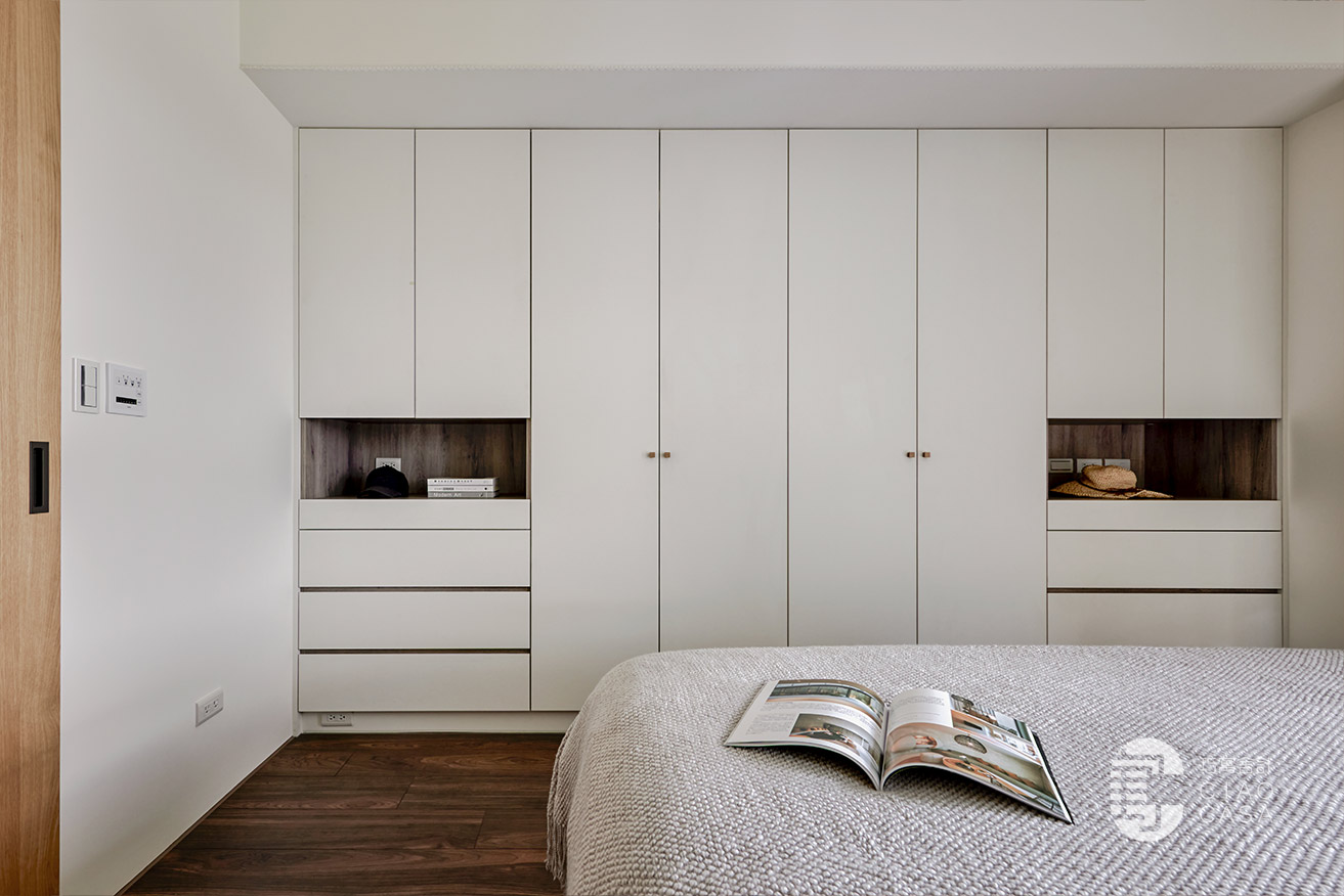 跳脫樸實自然的原木風格,主臥房床頭利用鏡面、金屬飾條,引入女主人嚮往的輕奢質感,並將梳妝機能安於窗邊一隅,在提升生活機能的同時,也豐富了空間格調。床尾的純白衣櫃,特別選用日本建築師藤田雄介設計的木質把手,從精巧的細節之處,將生活的溫度刻畫入微。