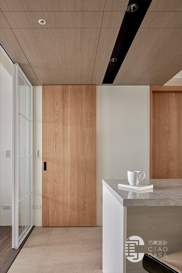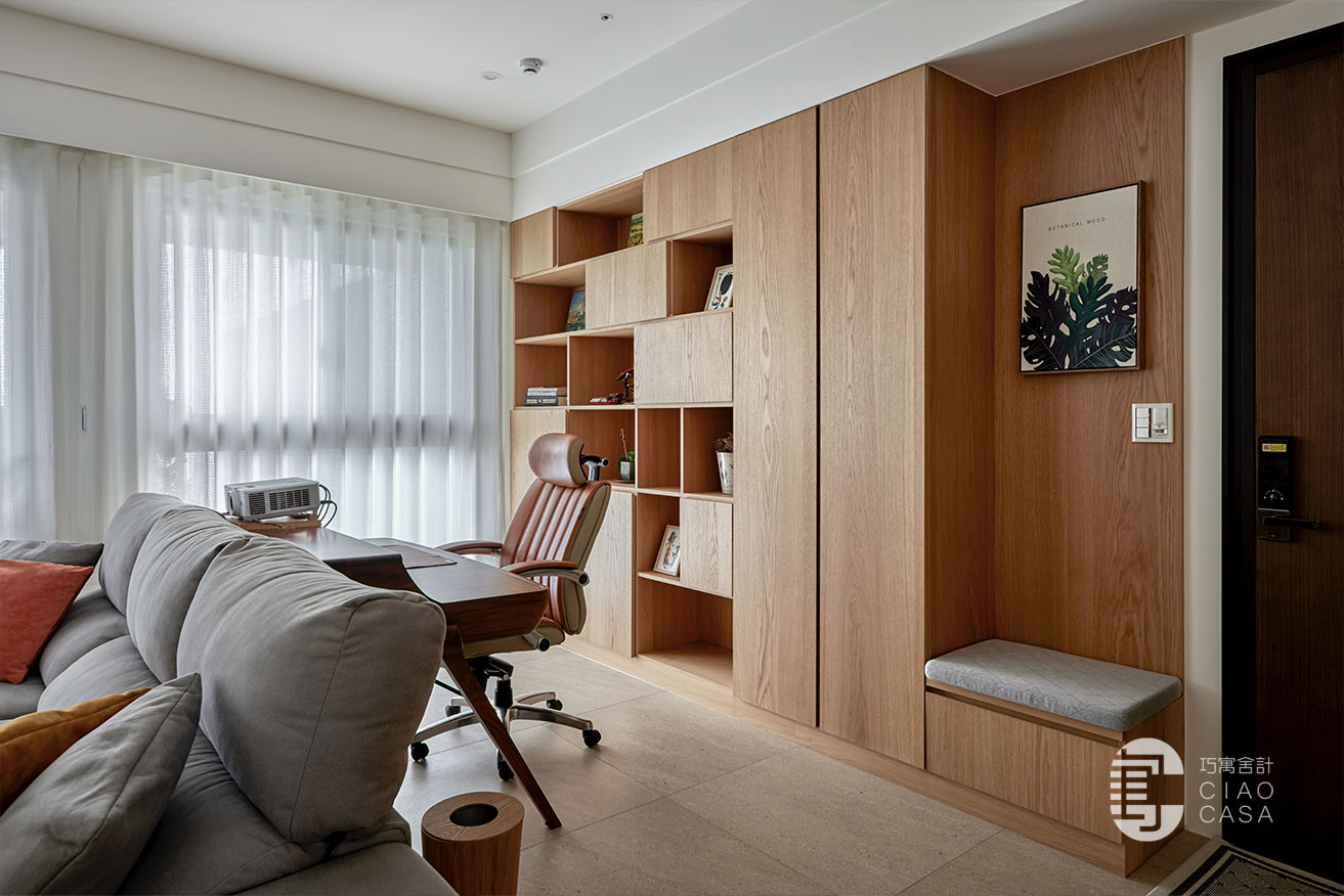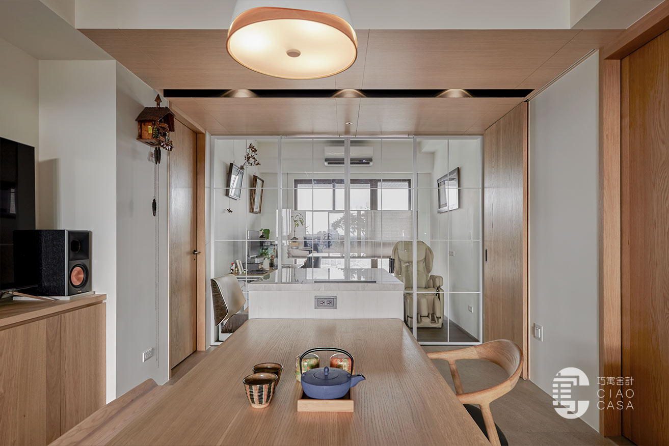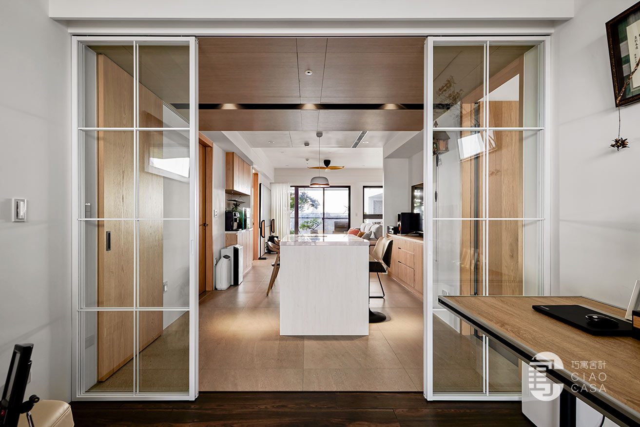 對居者而言,書房是療癒自我的心靈場域,設計師遂利用白色玻璃拉門隔出空間,雙扇平開的結構,不僅讓光線視覺有所提升,釋出寬敞感,開合自在的場域設定,也使書房氣韻更顯生動悠長,形塑出生活的詩意與精神屬性。