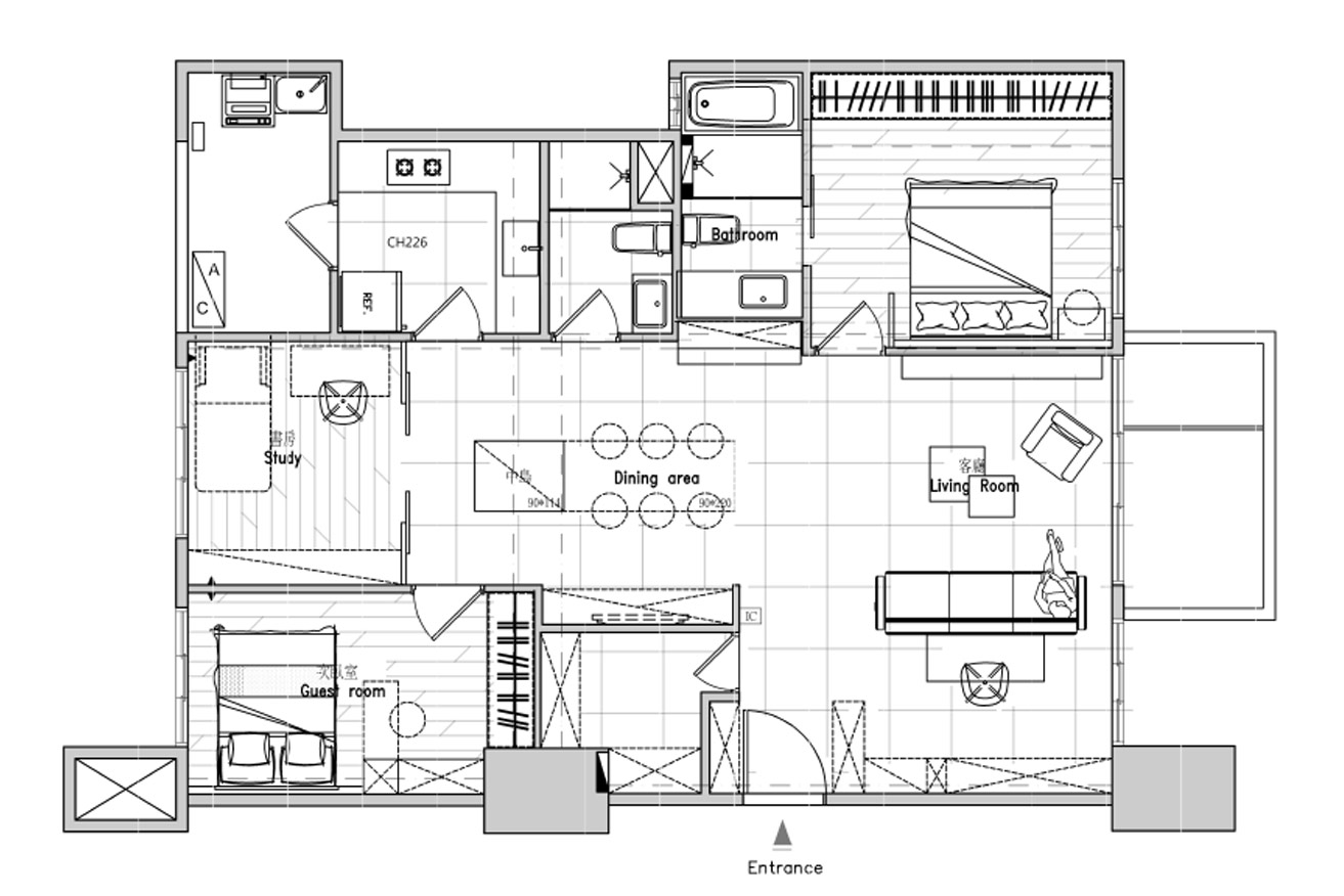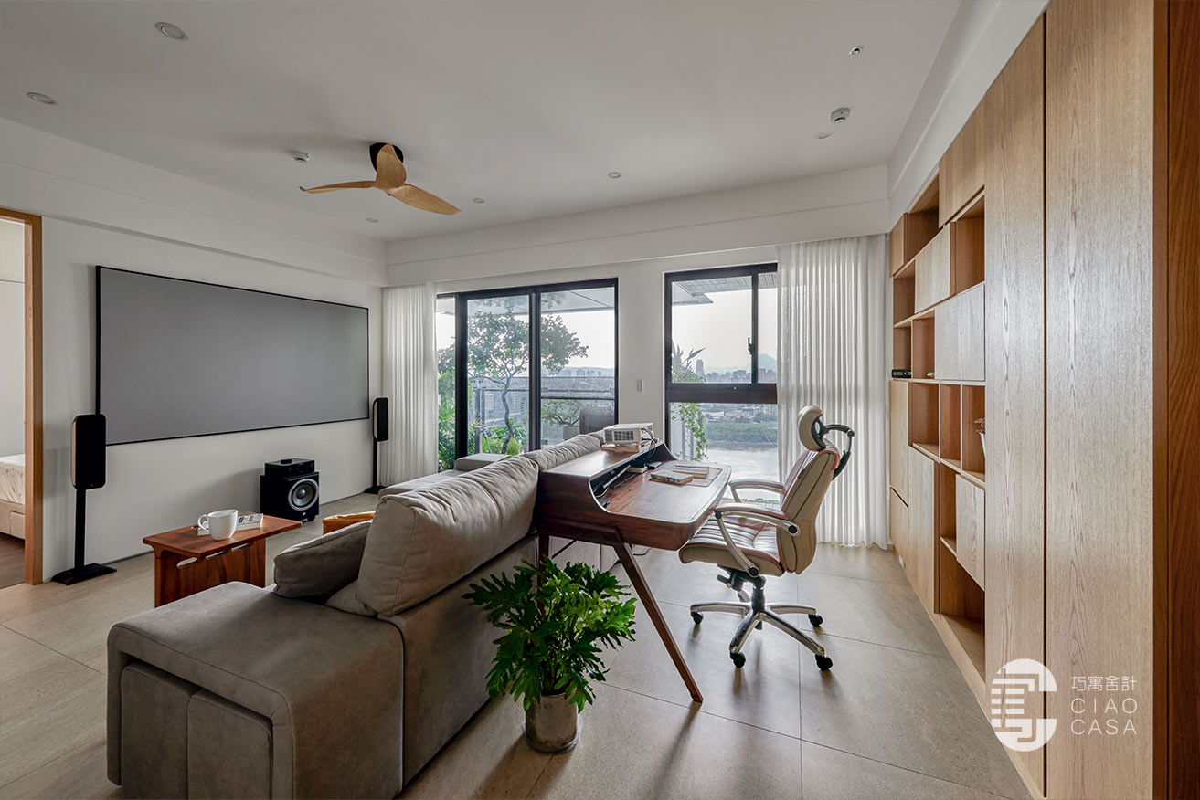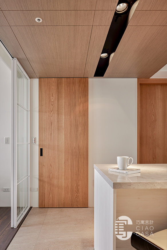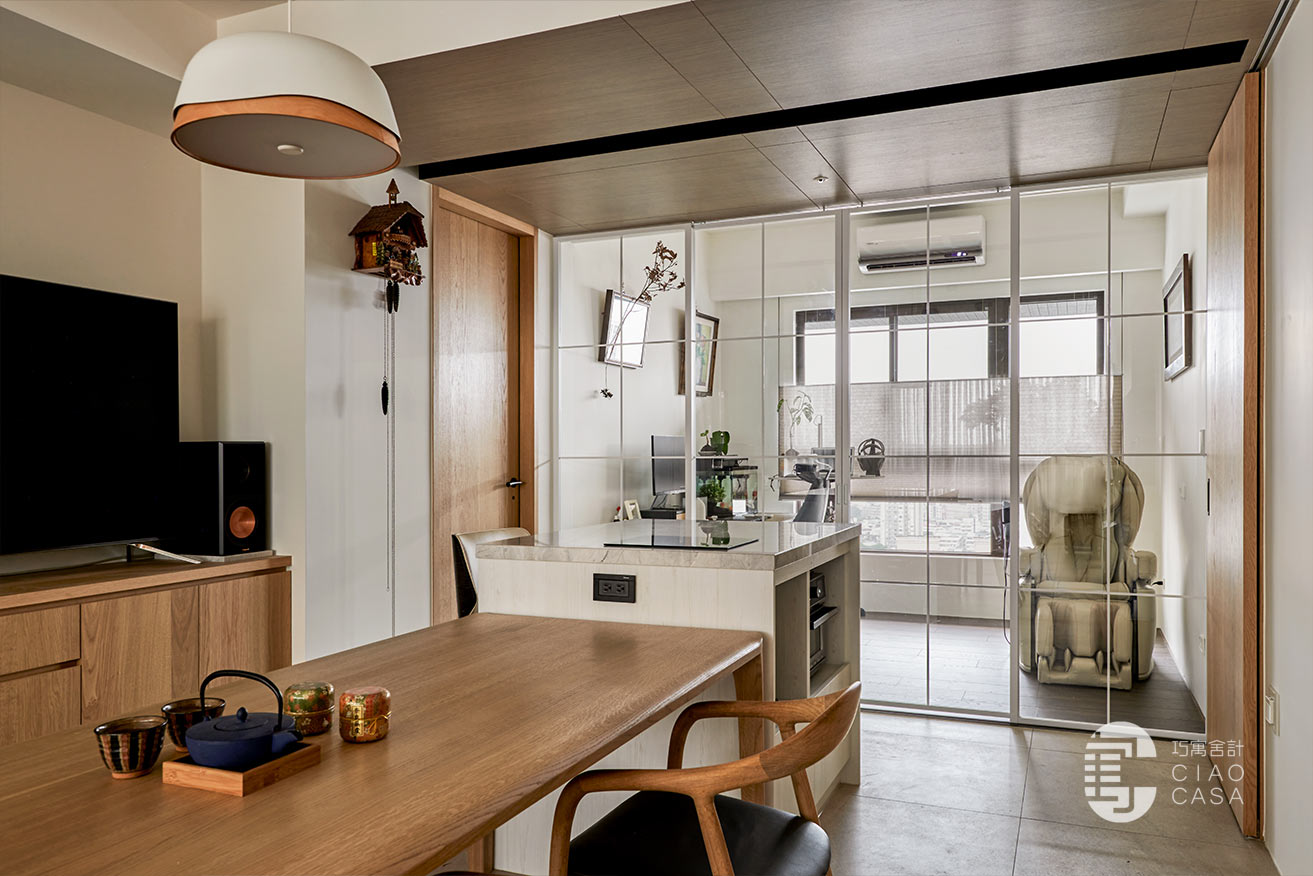 對居者而言,書房是療癒自我的心靈場域,設計師遂利用白色玻璃拉門隔出空間,雙扇平開的結構,不僅讓光線視覺有所提升,釋出寬敞感,開合自在的場域設定,也使書房氣韻更顯生動悠長,形塑出生活的詩意與精神屬性。