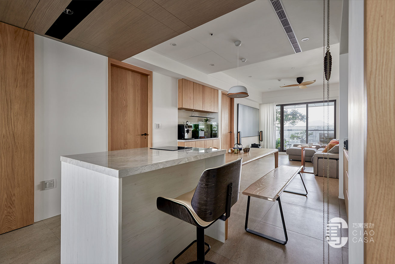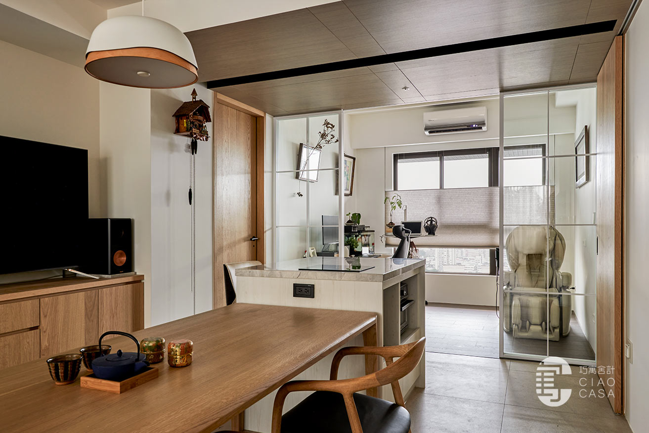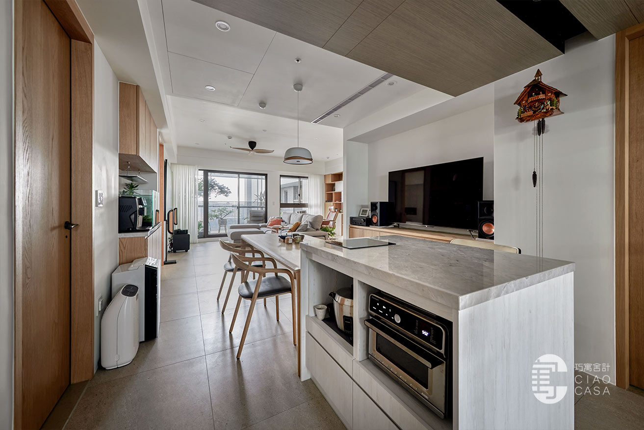 餐廳採用中島與大尺度餐桌的組合,讓尤愛飲茶的屋主能與好友相伴而坐、品茶敘舊,而中島設有嵌入式IH爐及電器櫃,也貼心圍塑與家人齊聚吃鍋的溫馨情景。