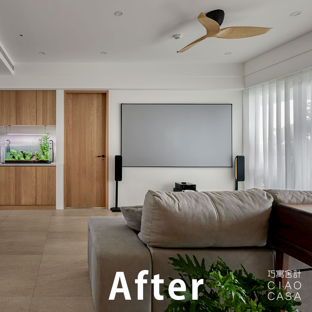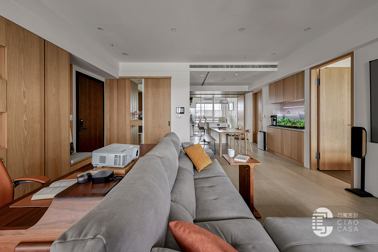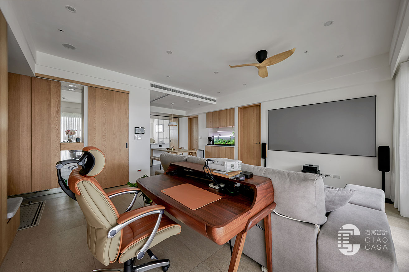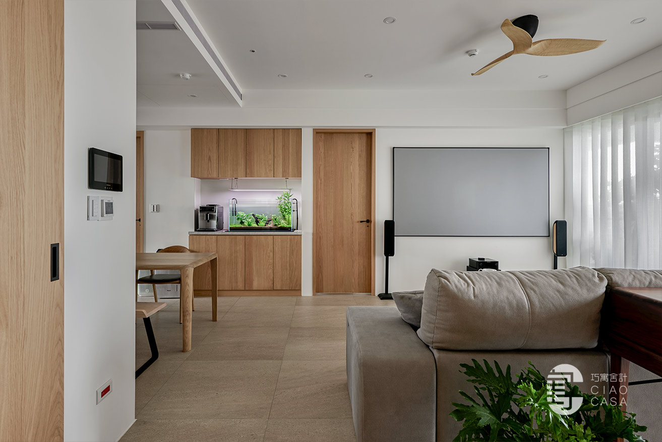甫進家宅,位於盡頭的端景是視線和心境的落腳點,平實無華的木質餐櫃,在玻璃魚缸的妝點下,成了佈局中一處點亮視覺、撫平心緒的存在。而原先留白的牆景,在往後的生活軌跡裡,逐步成為投影布幕的背襯,承載著一家多元的生活體驗。