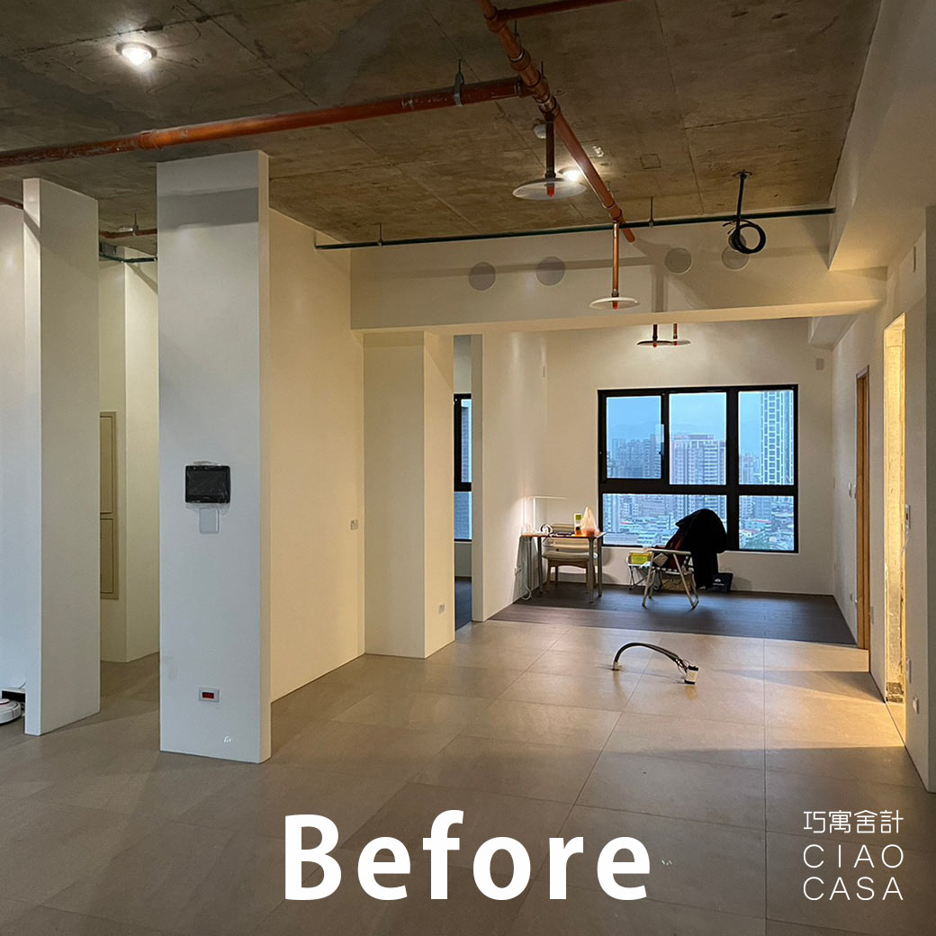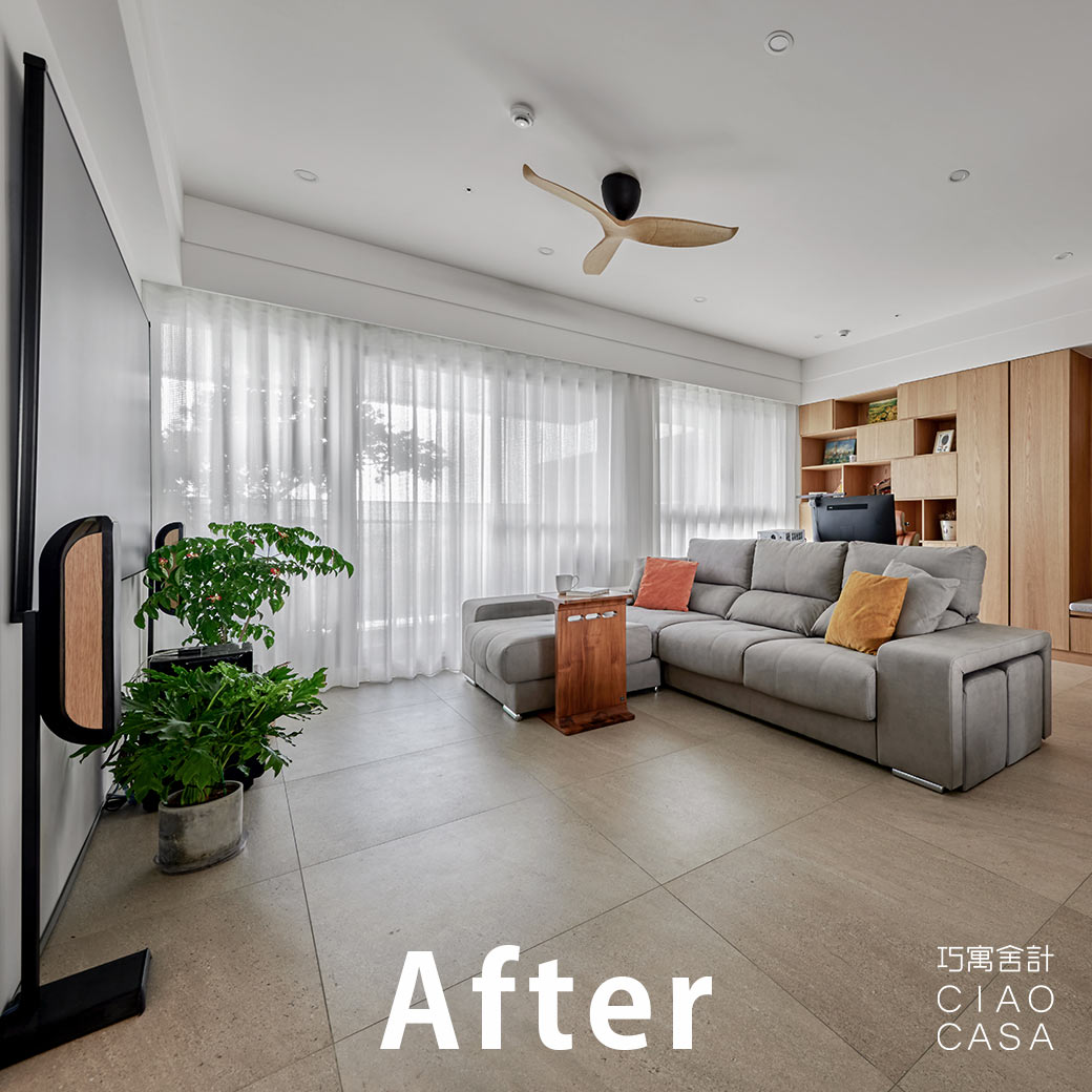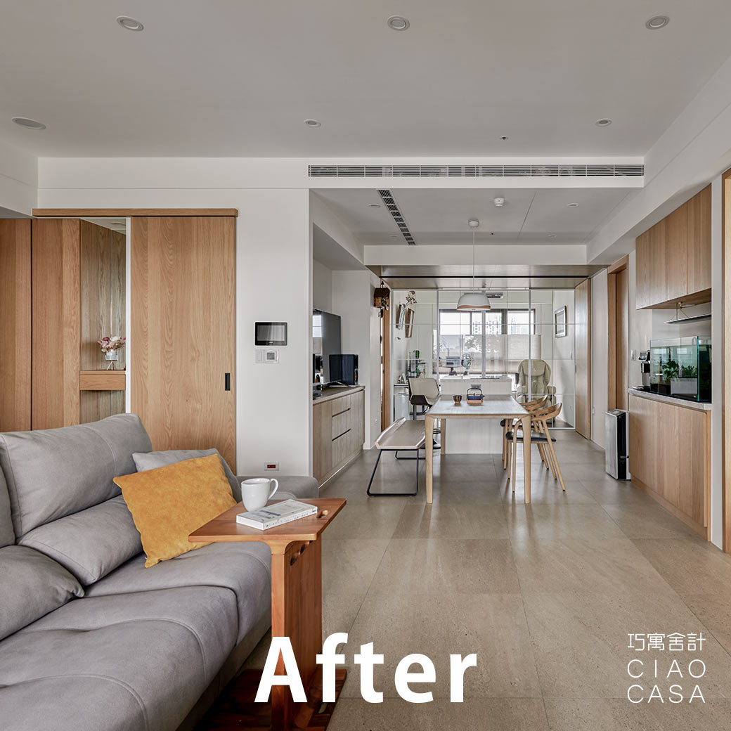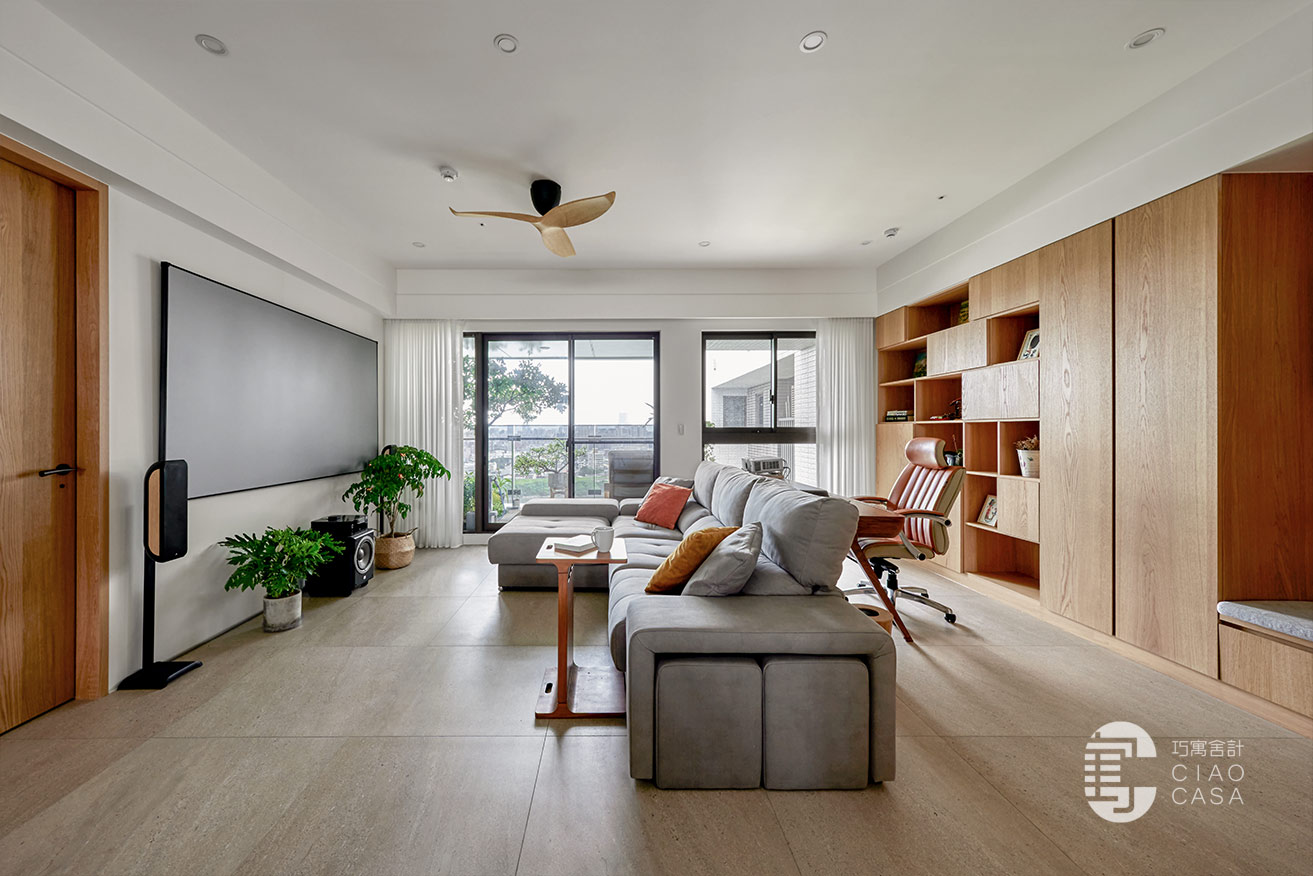 甫進家宅,位於盡頭的端景是視線和心境的落腳點,平實無華的木質餐櫃,在玻璃魚缸的妝點下,成了佈局中一處點亮視覺、撫平心緒的存在。而原先留白的牆景,在往後的生活軌跡裡,逐步成為投影布幕的背襯,承載著一家多元的生活體驗。