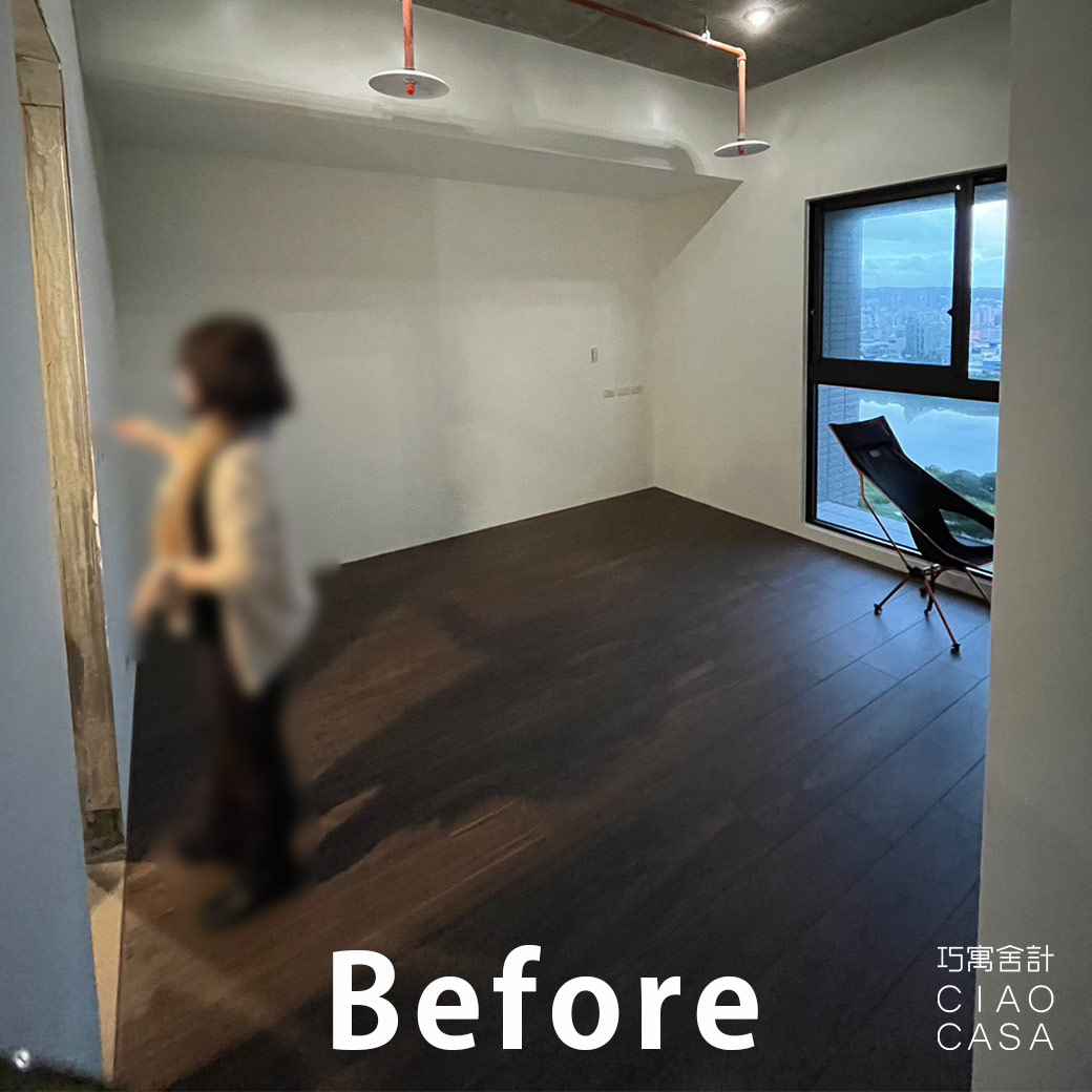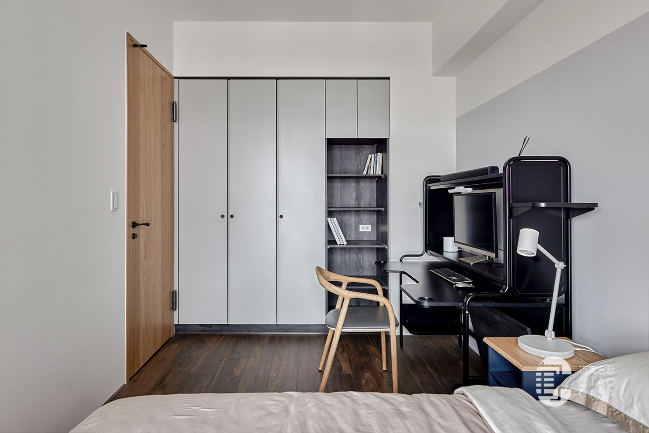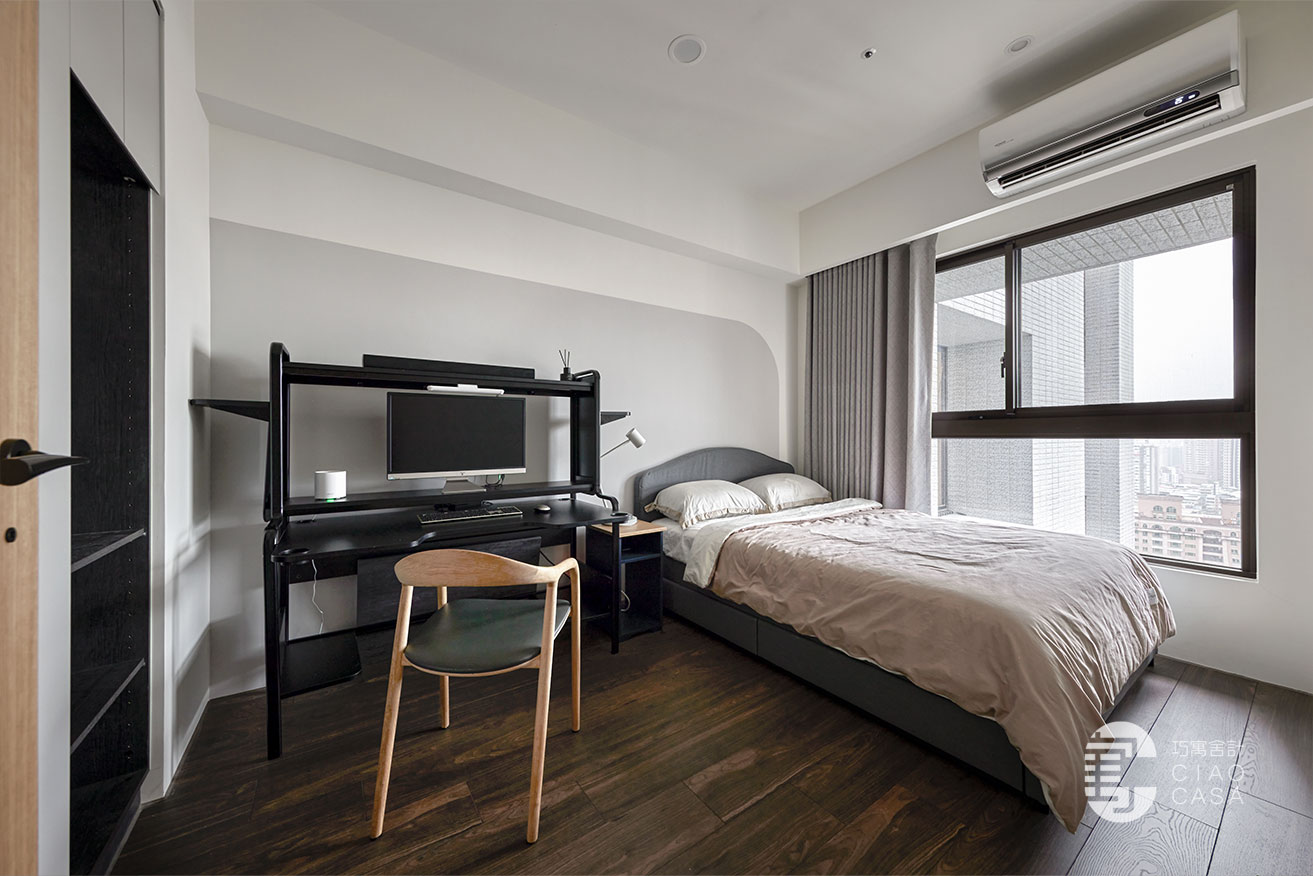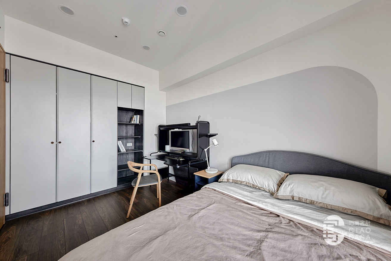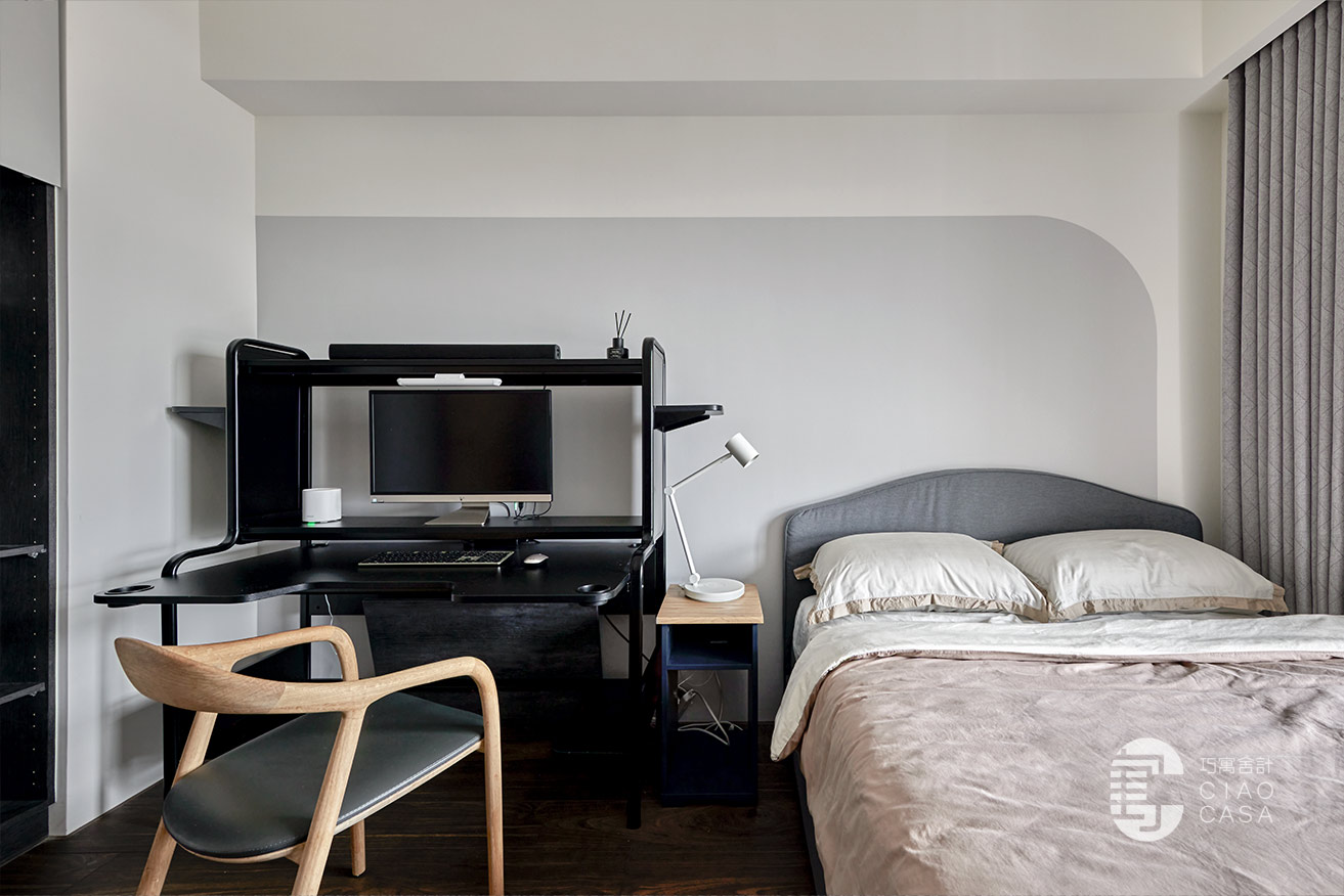 為貼合兒子低調內斂的個性,次臥房以黑白灰的中性色調,搭配弧形線條、木質元素,巧妙平衡冷暖,營造放鬆自在的休憩氛圍。由於坪數有限,設計師將衣櫃結合展示書櫃,透過微幅懸空輕緩櫃體的厚重感,同時以柔和的米灰色、肌理鮮明的深灰色,形塑視覺的層次感。此外,闊綽的空間安排足以放置舒適的床組、電競桌和休閒椅,一舉滿足睡眠、閱讀、休閒娛樂等起居機能。